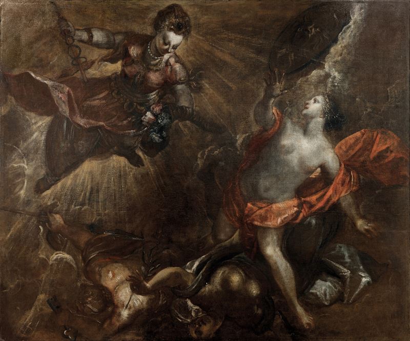 Nonostante non sia nota la provenienza e la committenza originaria del dipinto in oggetto, l’opera risulta pubblicata su diversi volumi dedicati alle opere del maestro veneziano (non sempre purtroppo con l’esatta identificazione iconografica - in alcuni casi, infatti, la troviamo descritta come Atena e Venere o come Arcangelo Michele che scaccia Lucifero). Nonostante parte della critica sia concorde nel ritenere che il dipinto sia da attribuire direttamente a Tintoretto, non può comunque essere escluso un possibile intervento da parte dei sui collaboratori, che certamente furono incaricati di affiancare il maestro in casi di commissioni così impegnative sia a livello di dimensioni sia di numero di opere da realizzare.