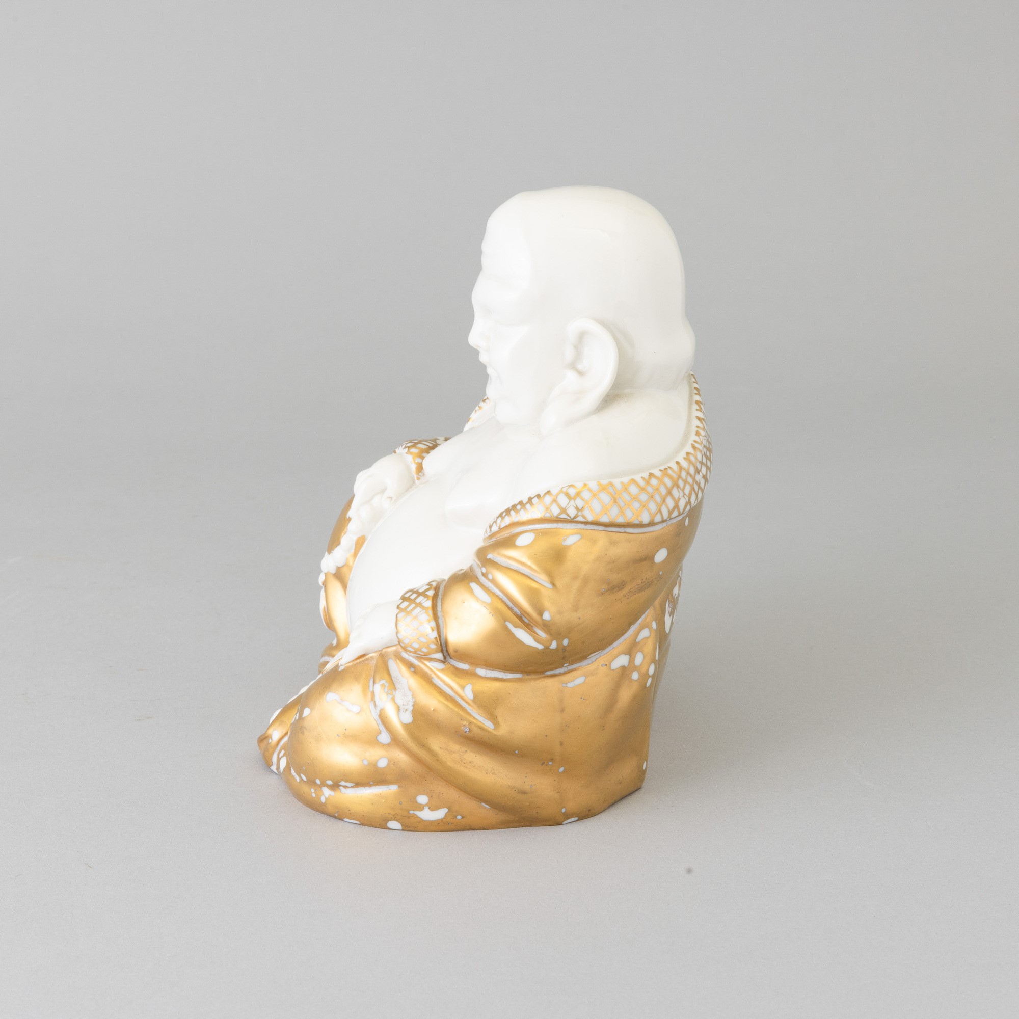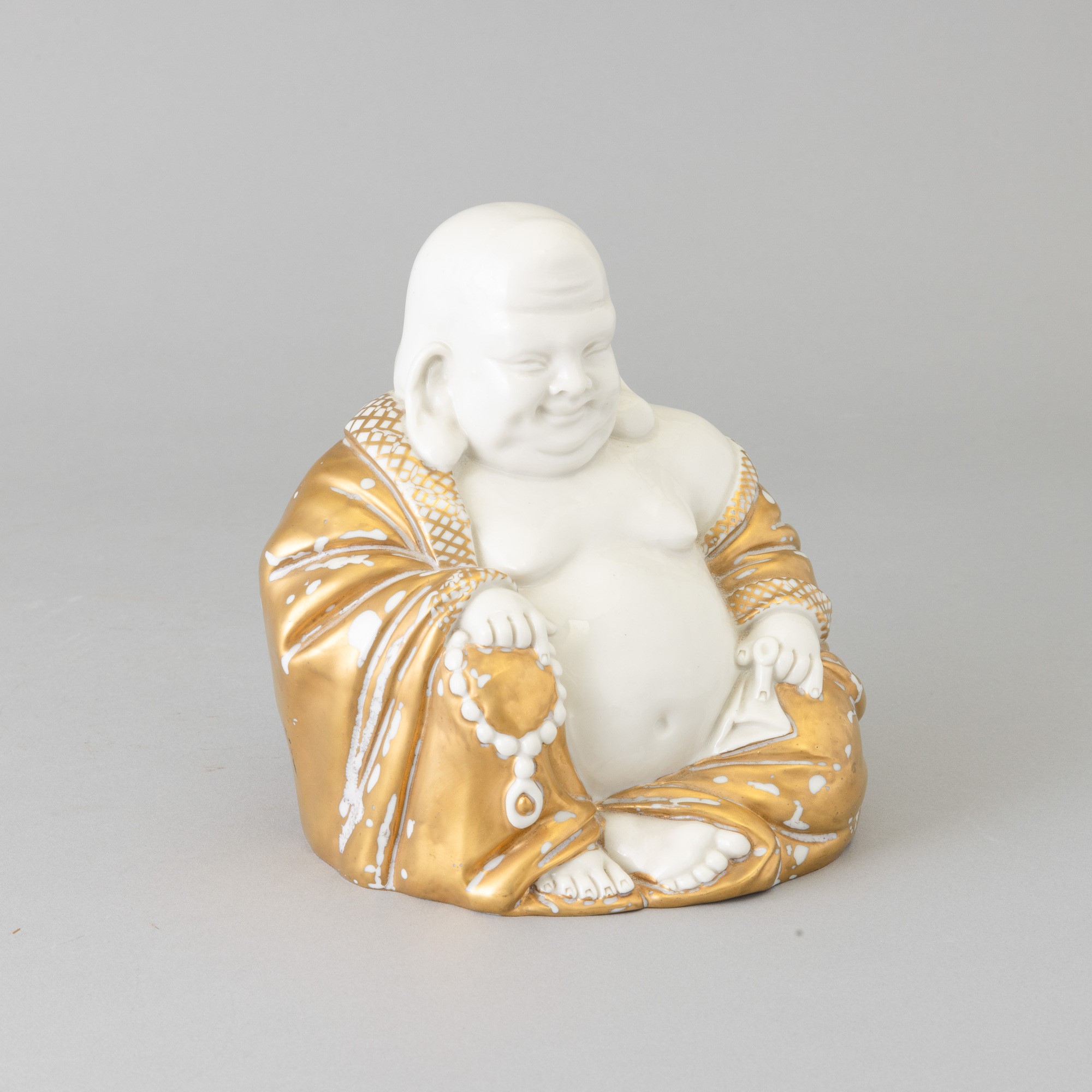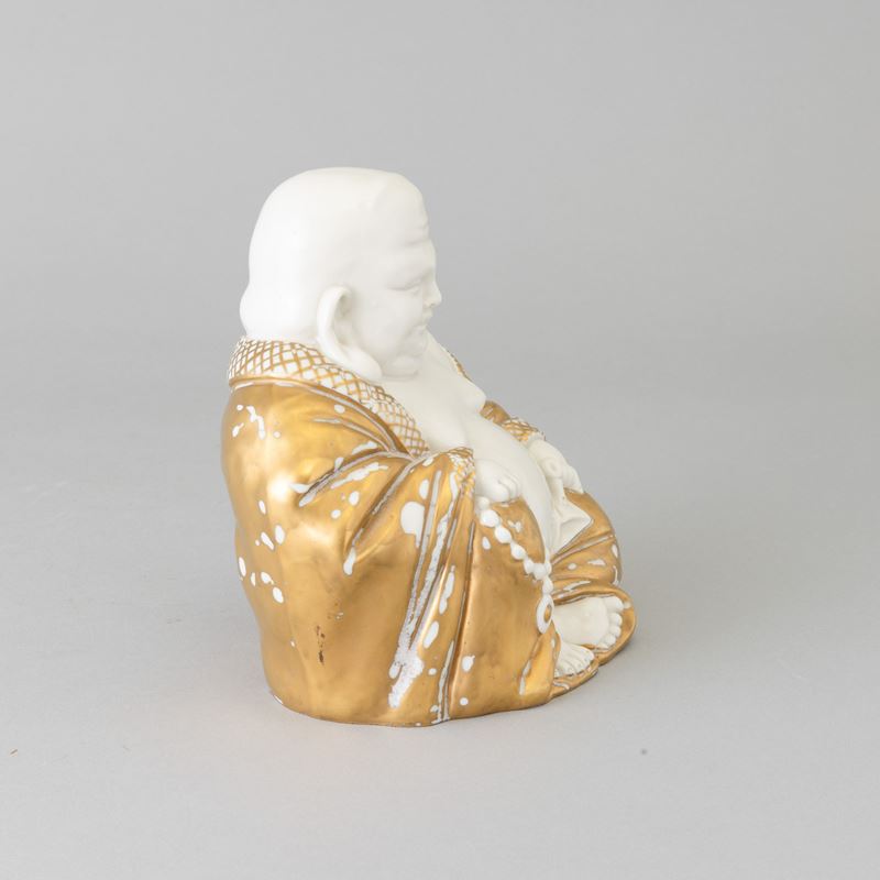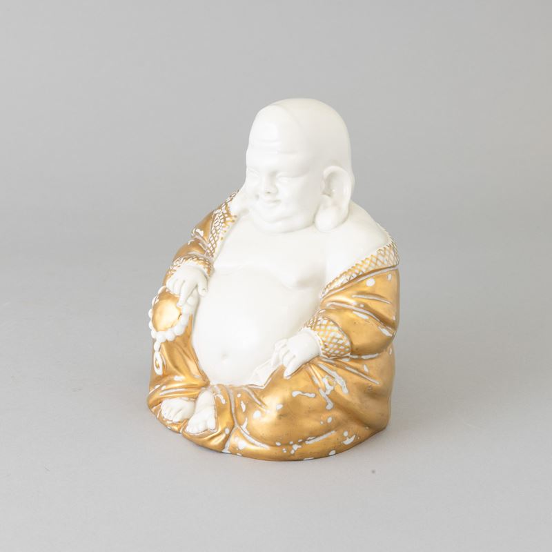Earthenware Buddha figure with surface partly golden in gold leaf.