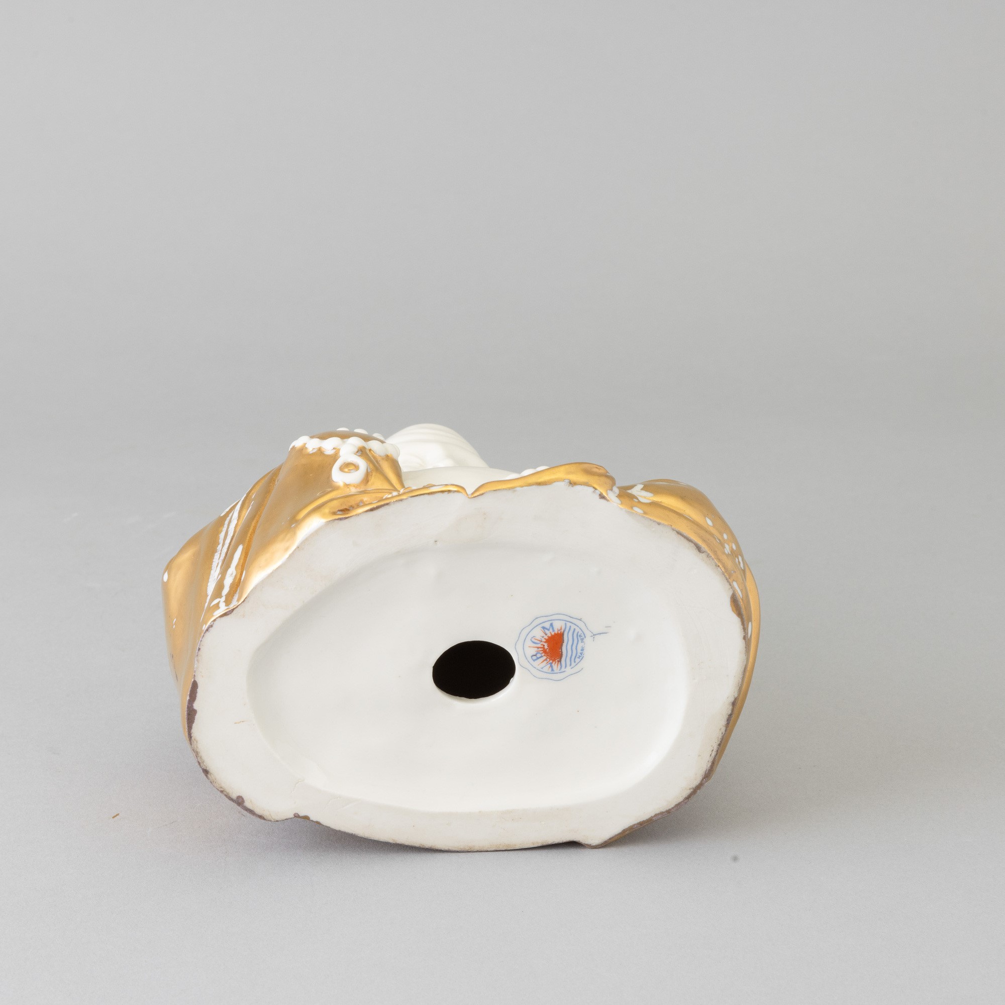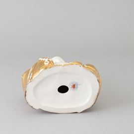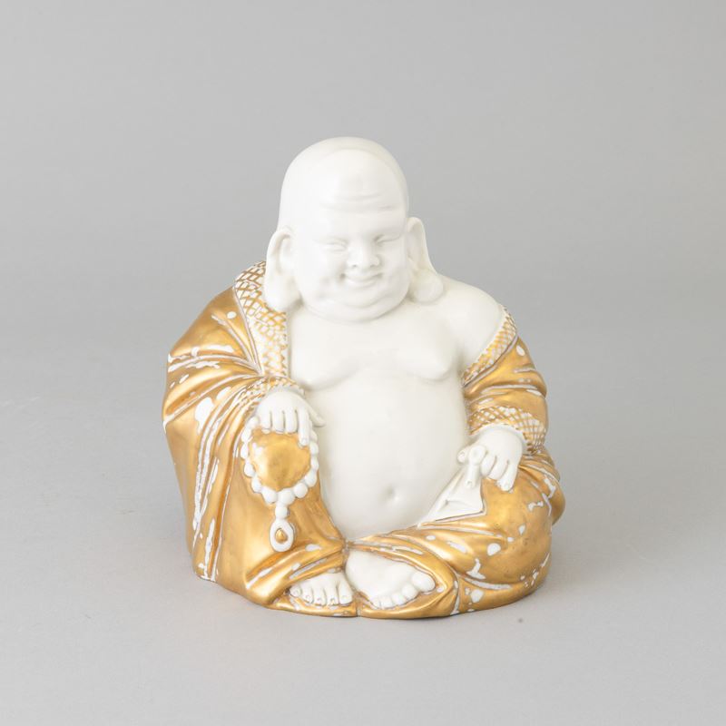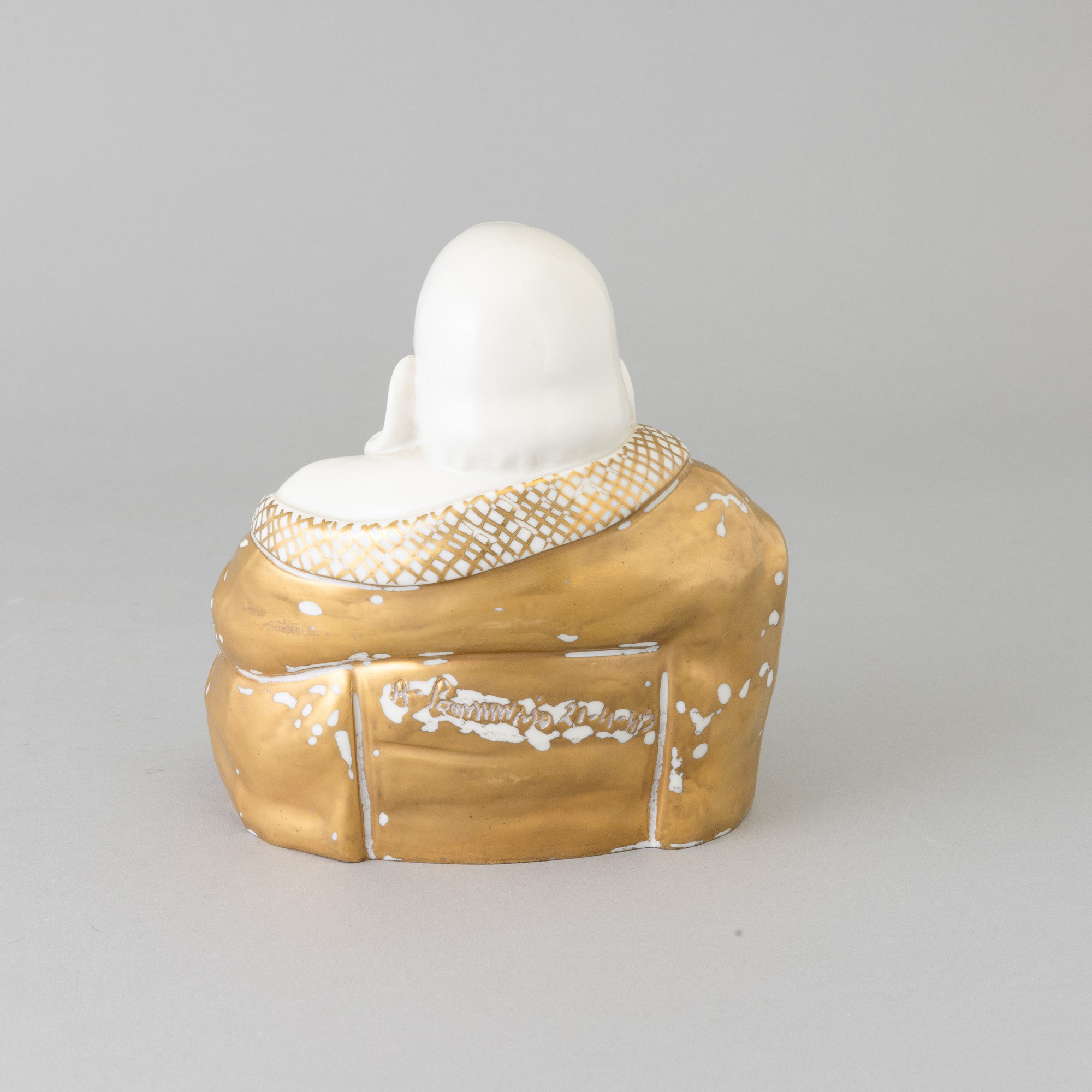 Earthenware Buddha figure with surface partly golden in gold leaf.