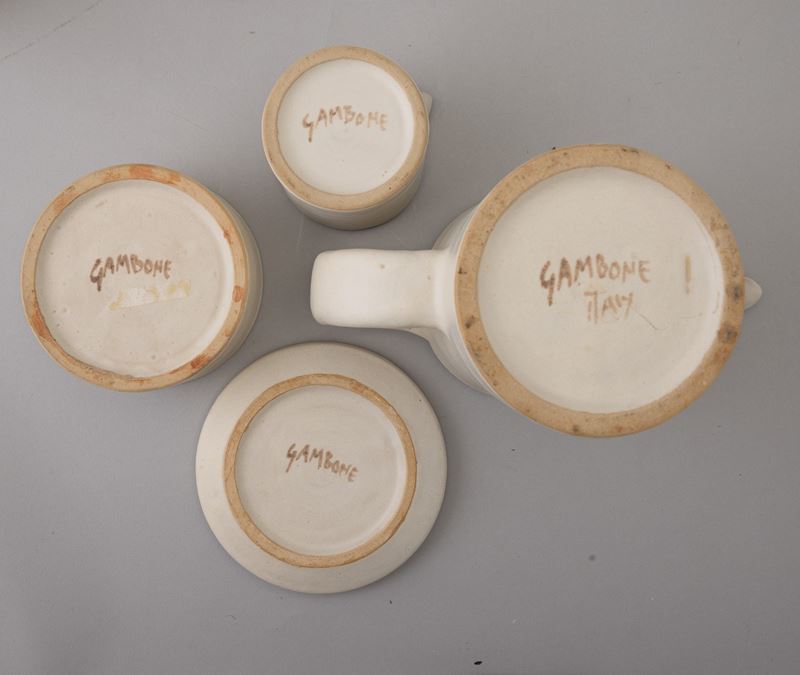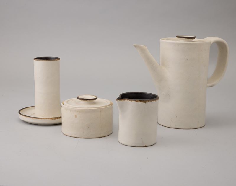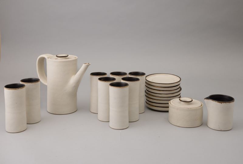 Servizio da caffè in ceramica al tornio con decoro a smalto bianco e interno marrone, formato da: caffettiera, zuccheriera, lattiera e otto tazze cilindriche con piattini. Marchio della manifattura.