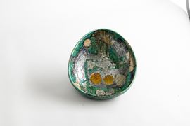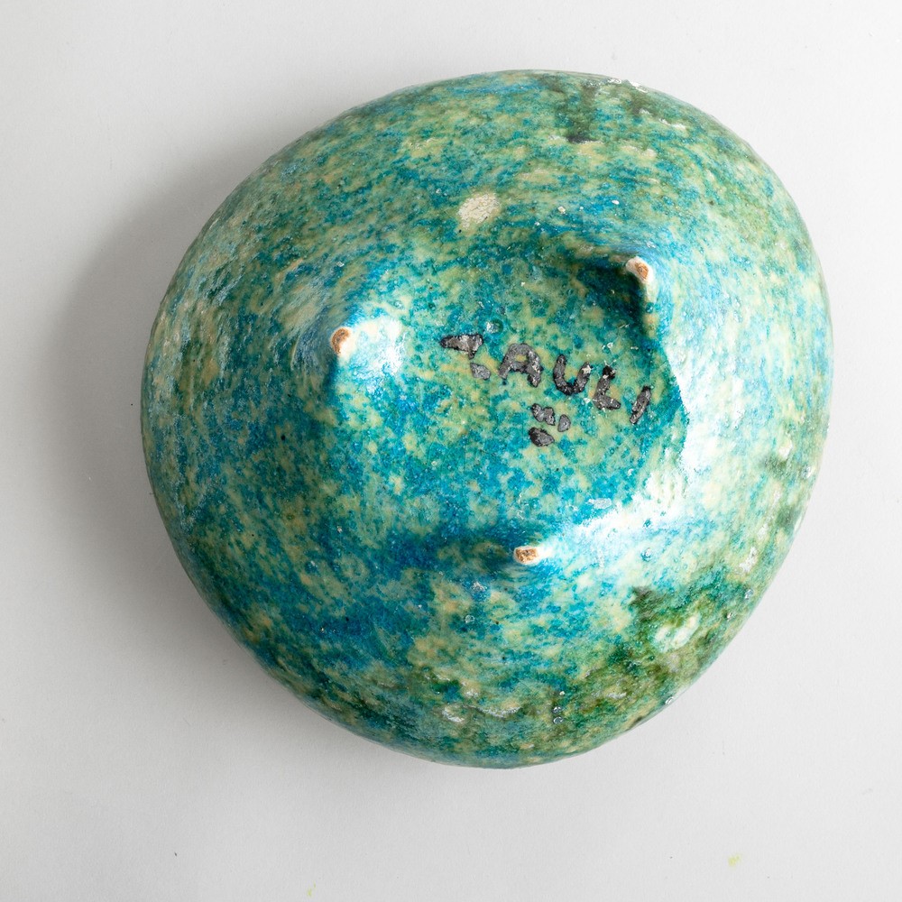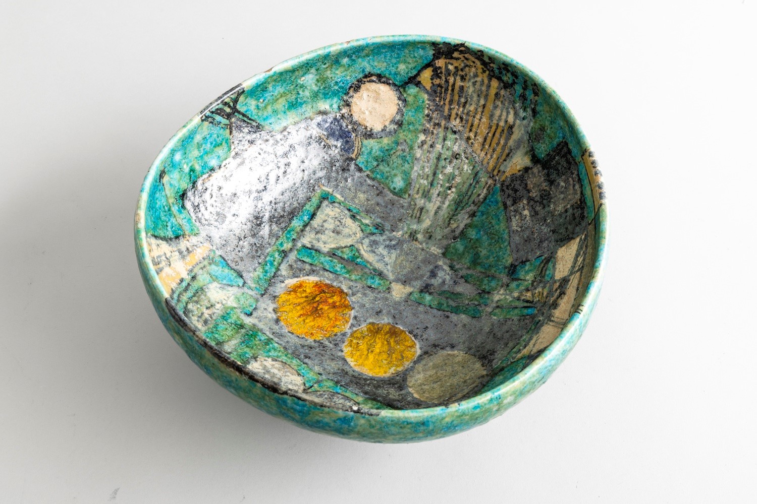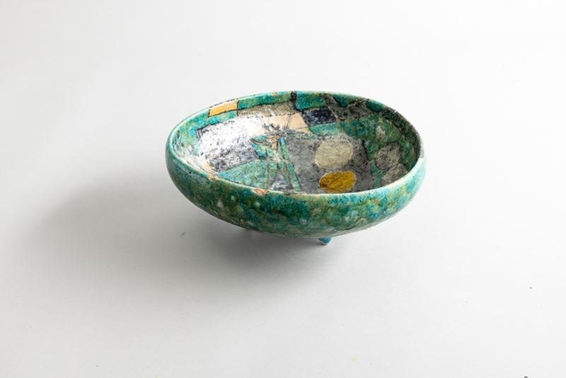 Tiled earthenware triangular bowl with three feet base with polychrome glossy abstract decoration.