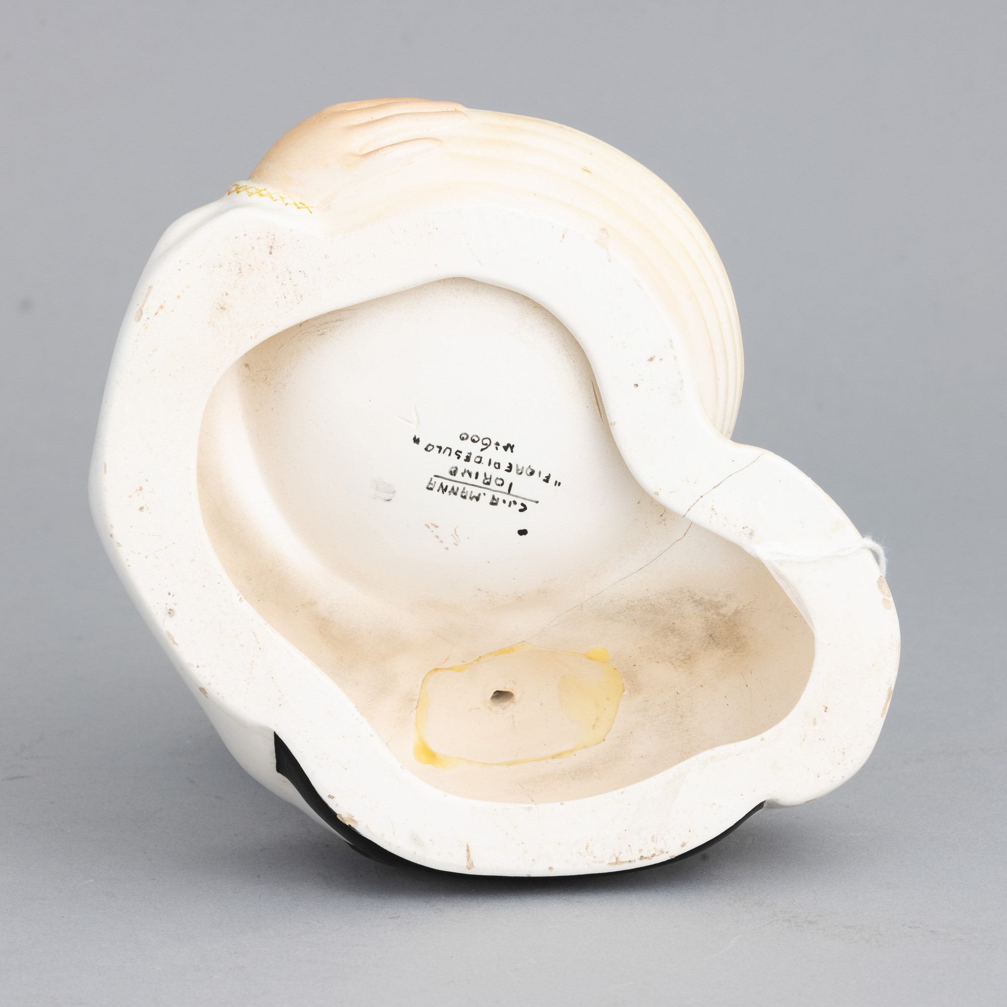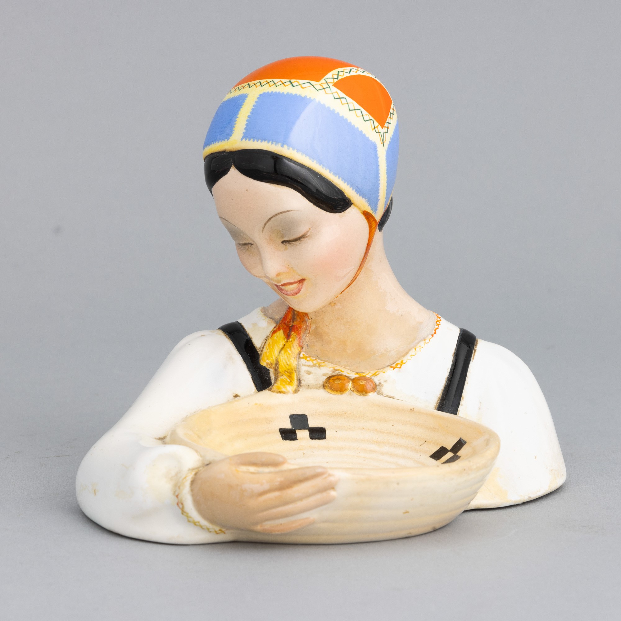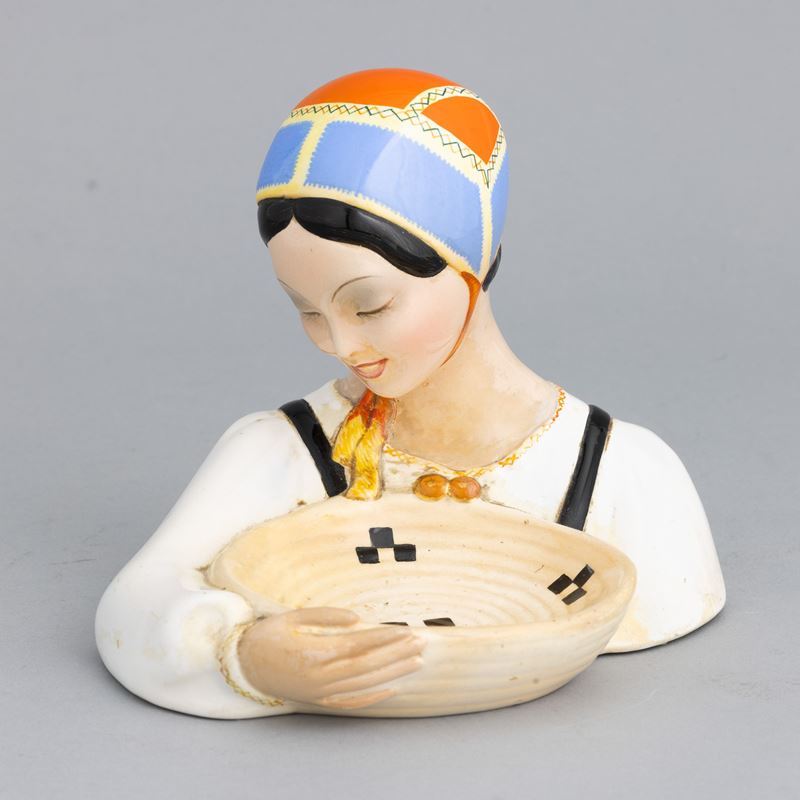 Figura con portagioie in terraglia a colaggio con decoro policromo.