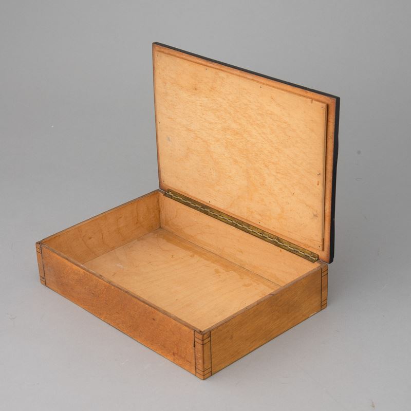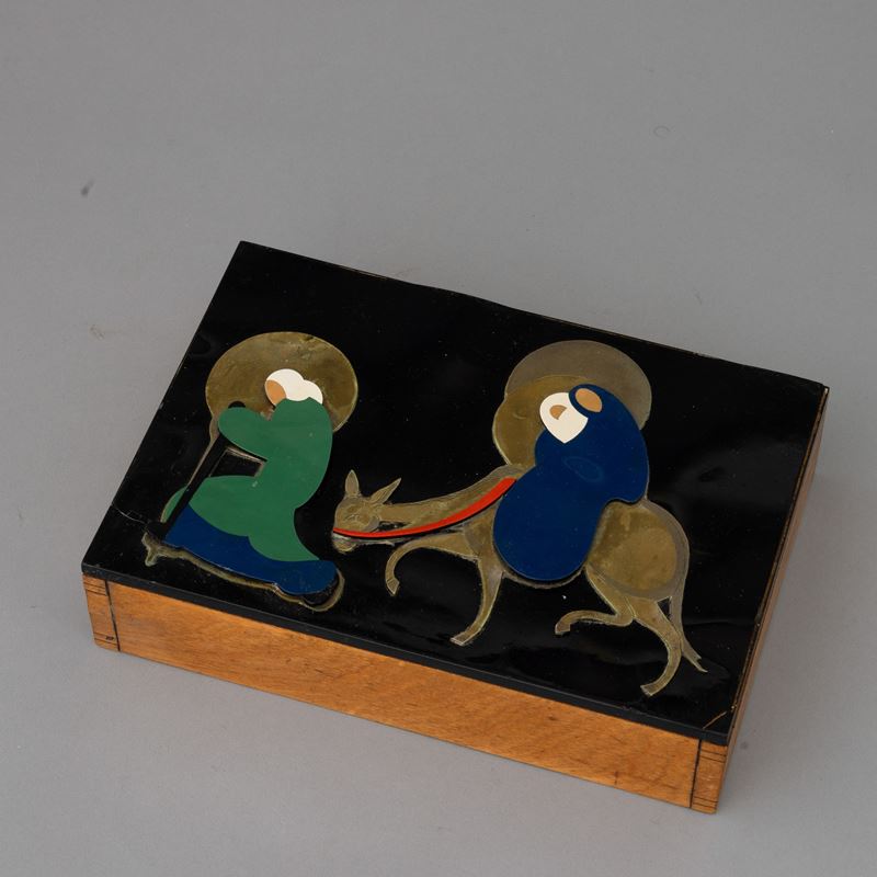 Wooden box with decorated lid representing the Escape to Egypt, made with metal foil and bakelite.