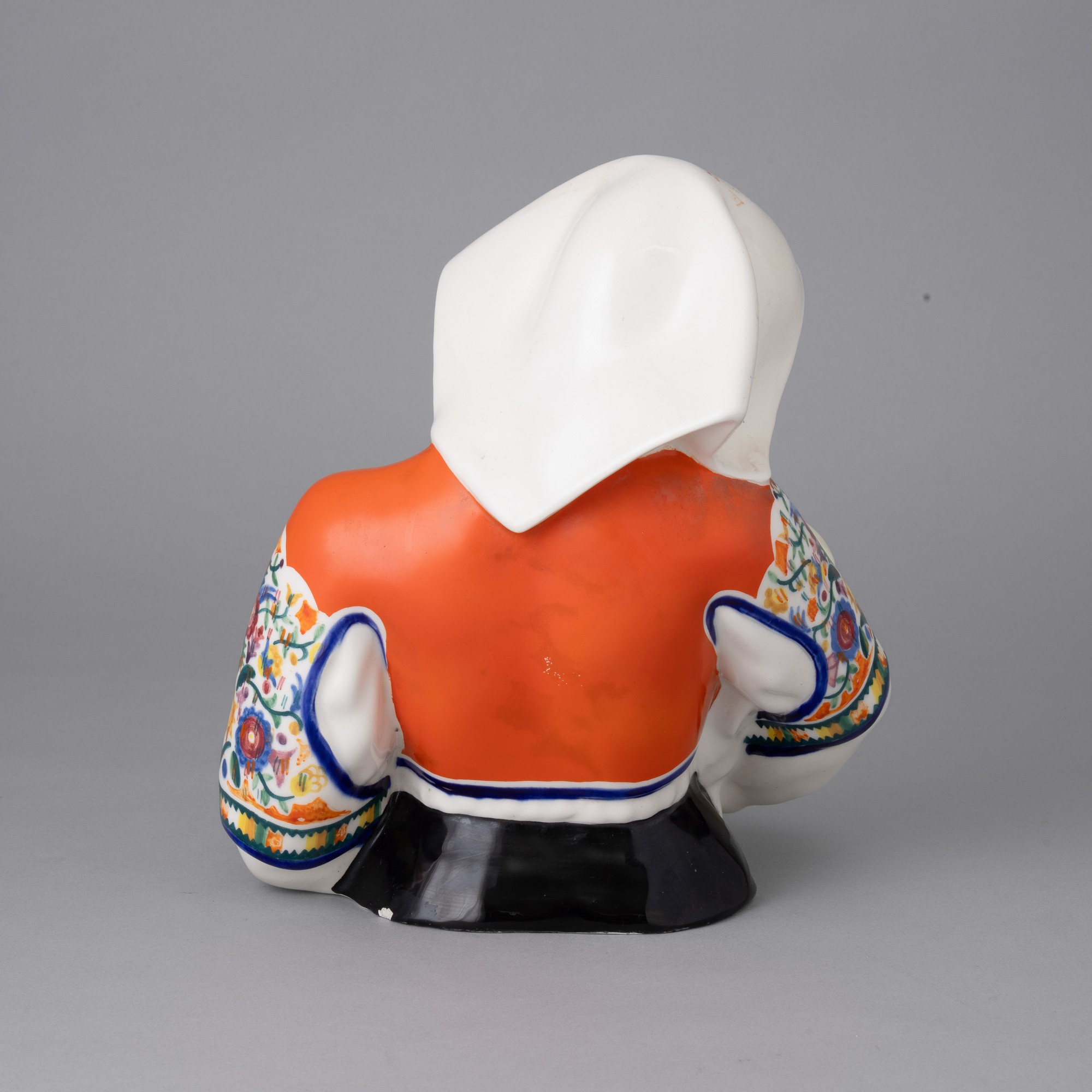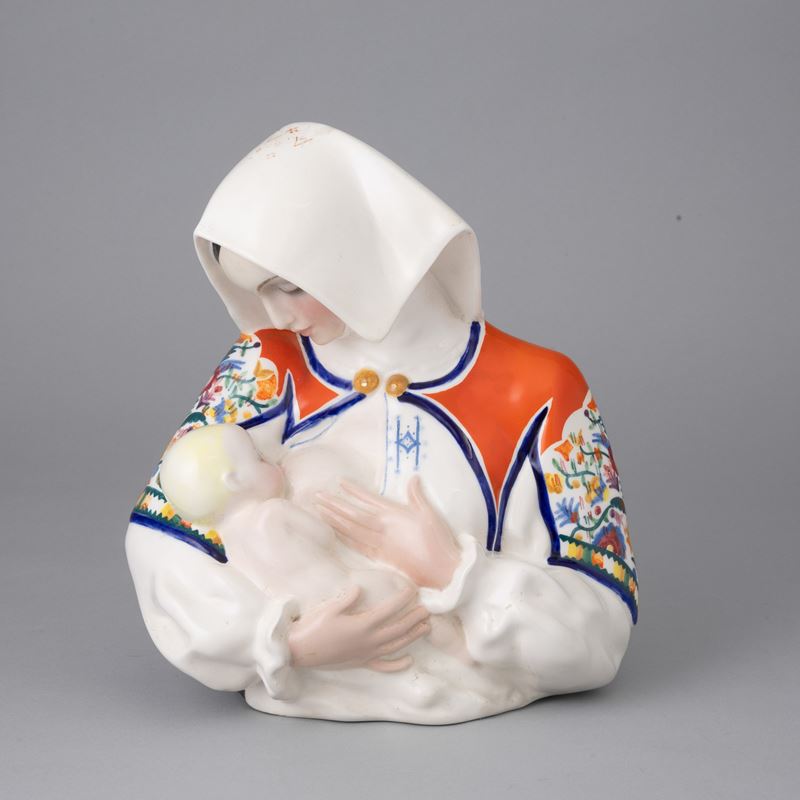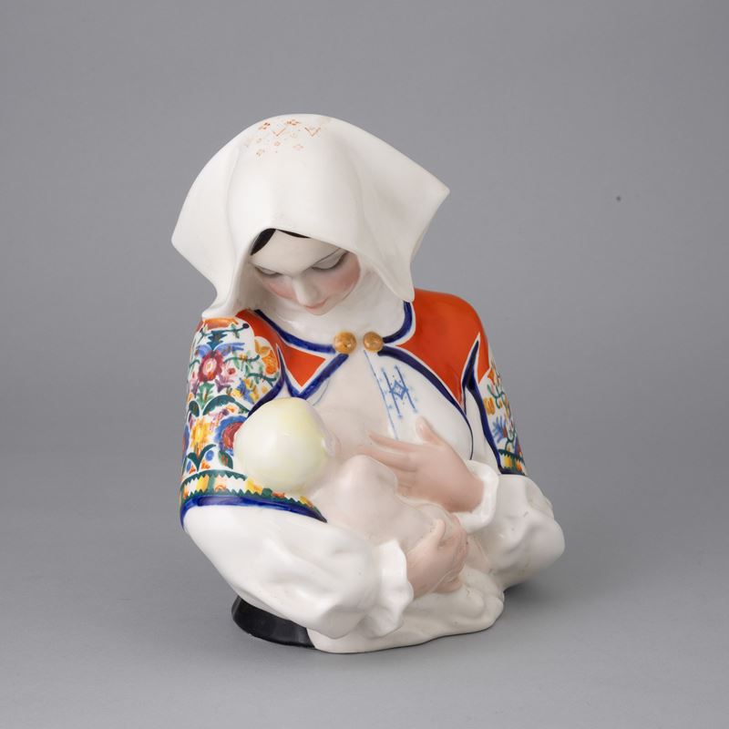Scultura in terraglia a colaggio raffigurante donna che allatta in costume tradizionale sardo.