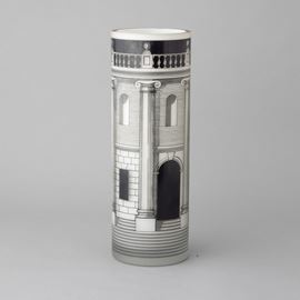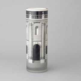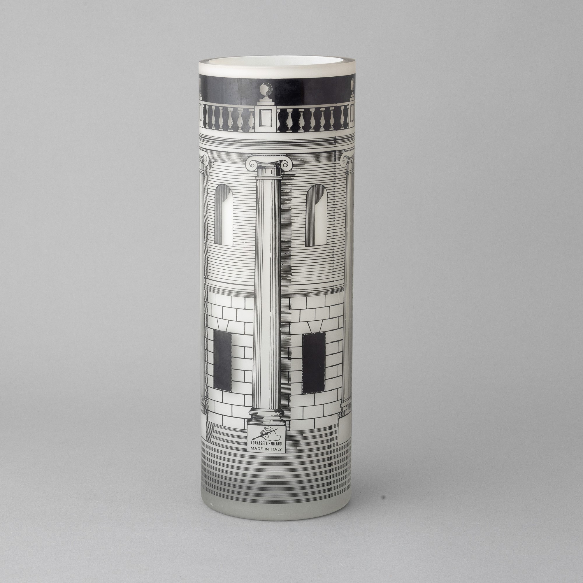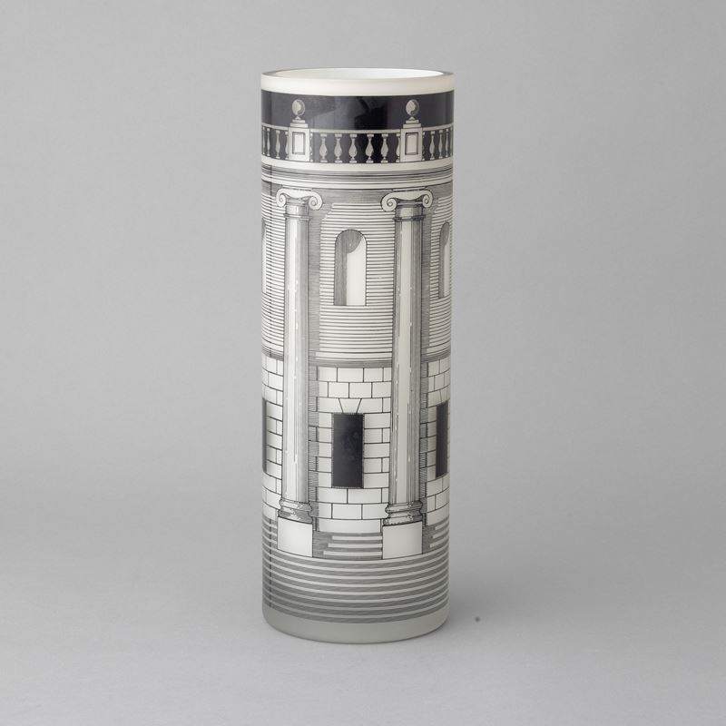Vaso cilindrico in vetro sabbiato con decoro serigrafato.
