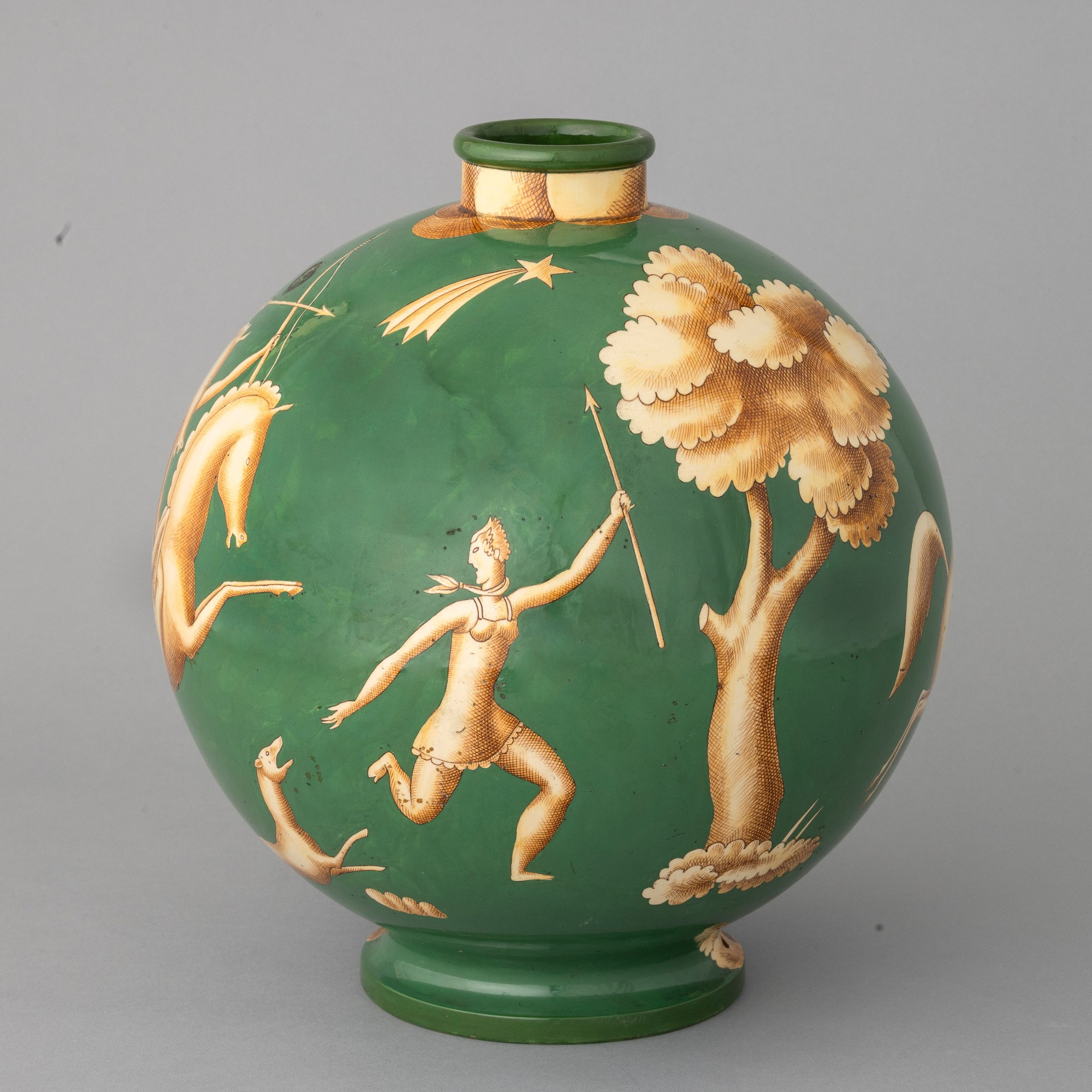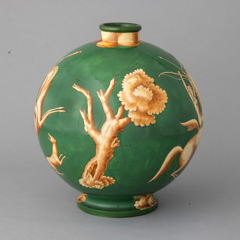 Vaso serie Venatoria di forma sferica con collo cilindrico e piede scanalato in terracotta maiolicata con decoro giallo bruno su fondo verde.