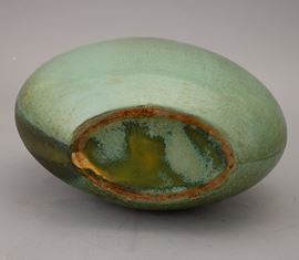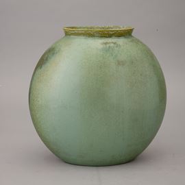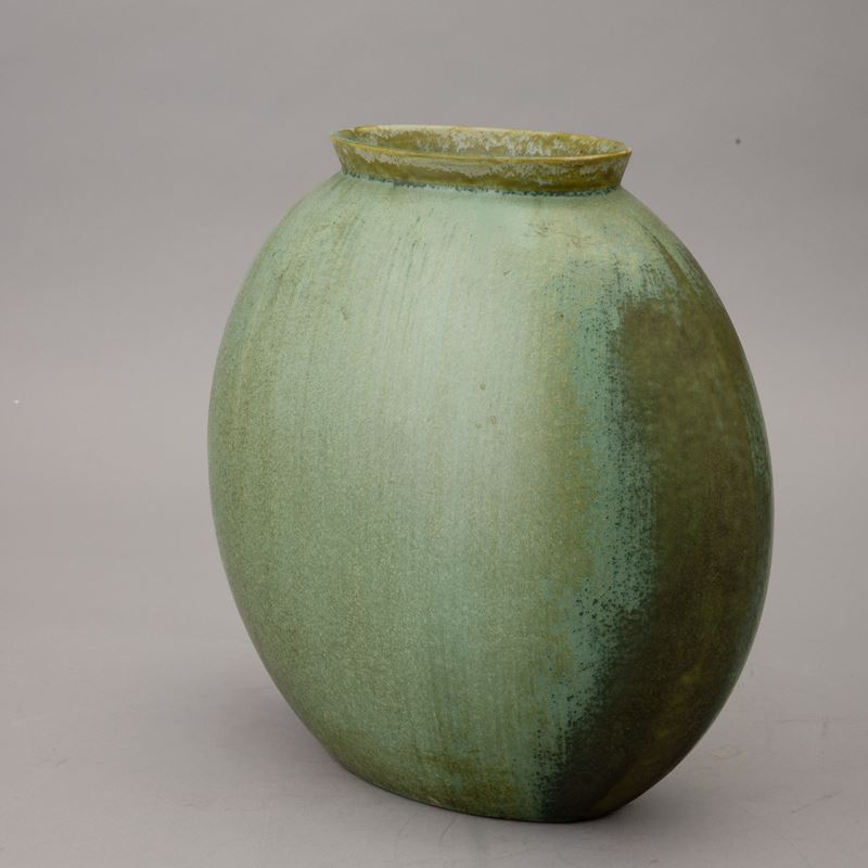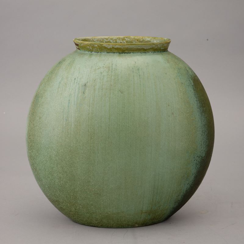 Vaso a lente con collo svasato in terraglia a colaggio con decoro di smalto verde cristallizzato.