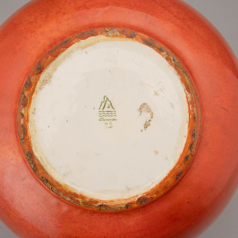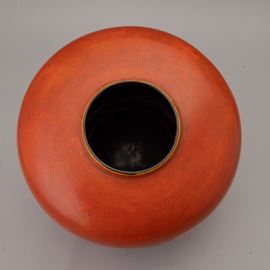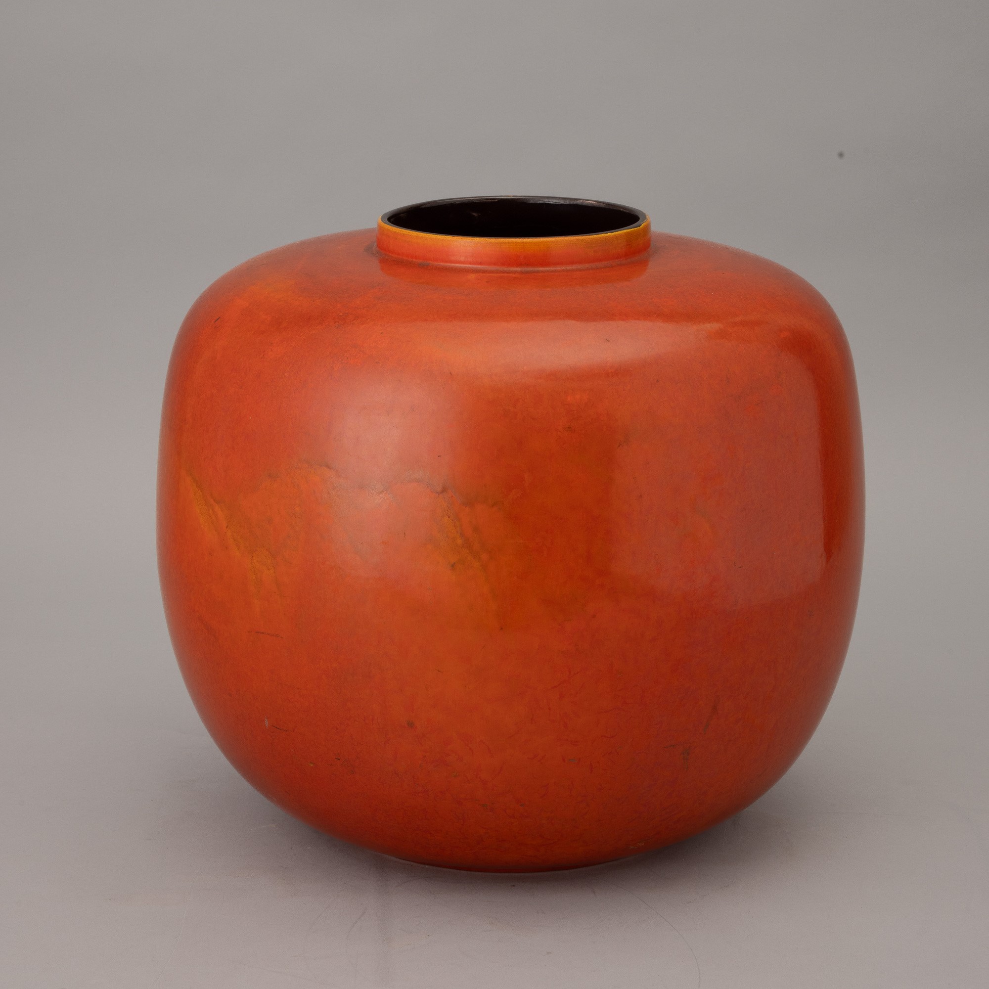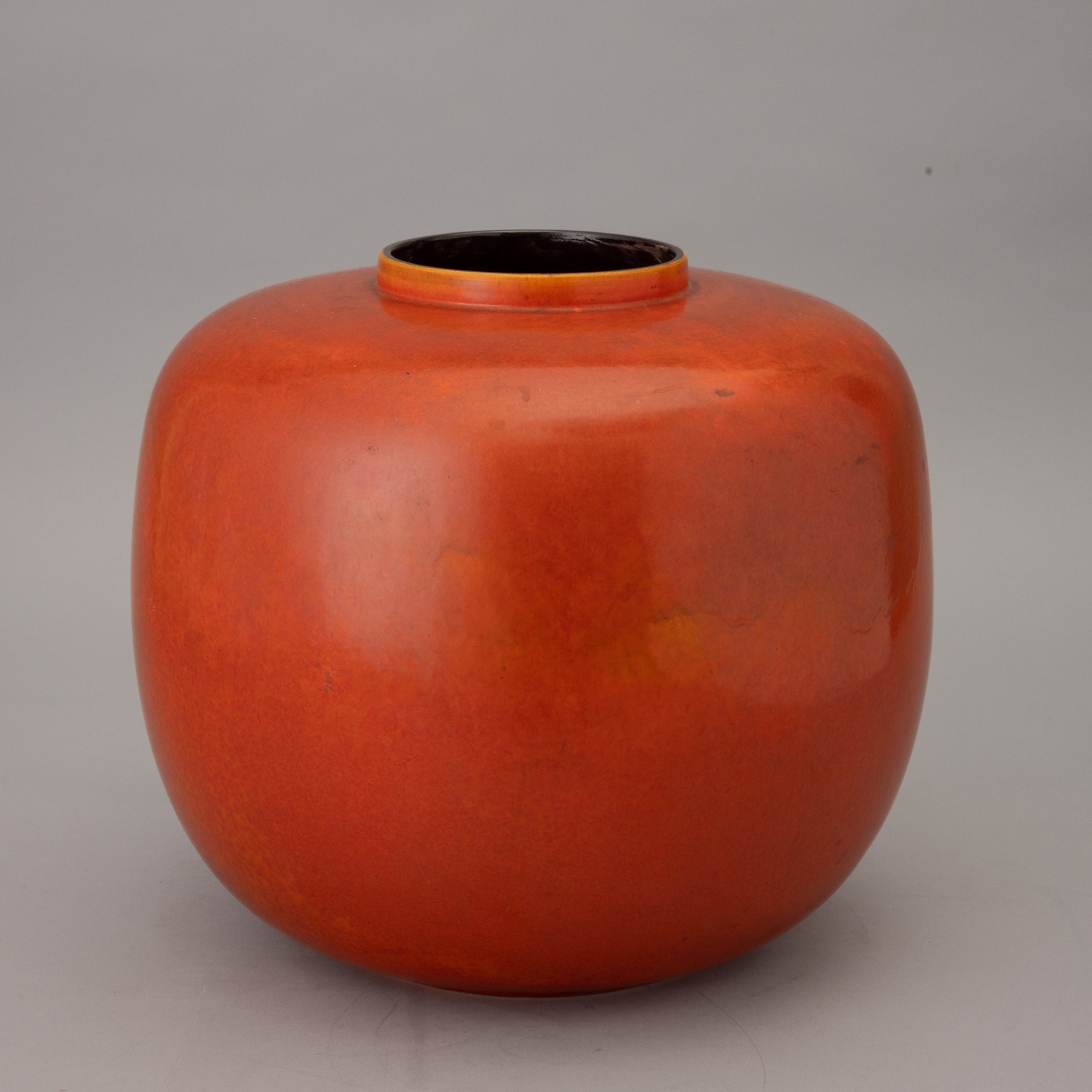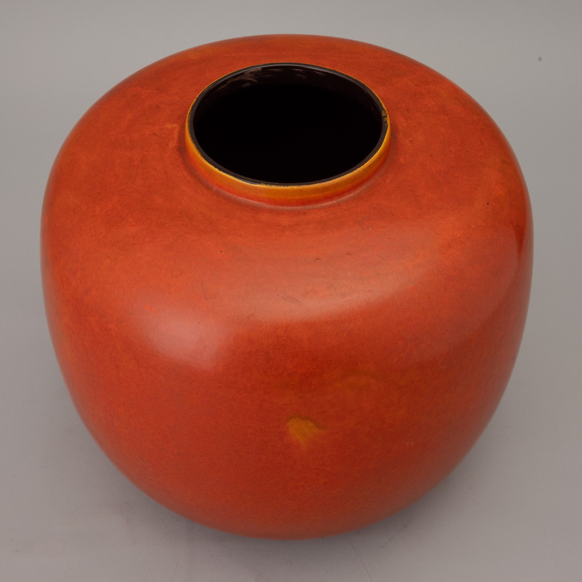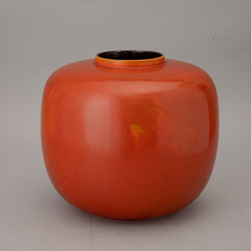 Grande vaso di forma globulare in terraglia a colaggio con decoro monocromo di smalto arancione.