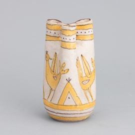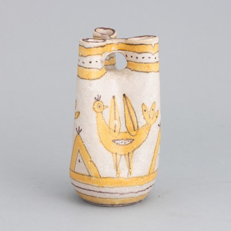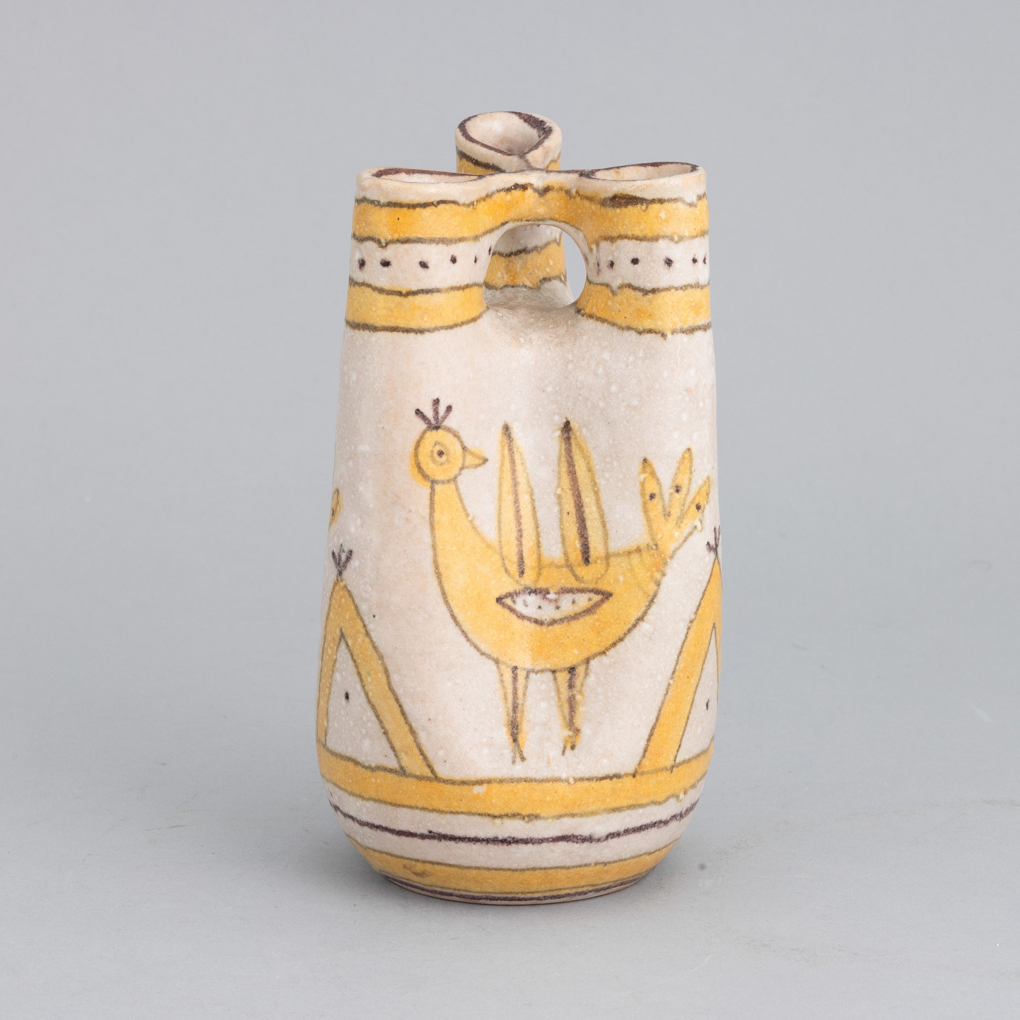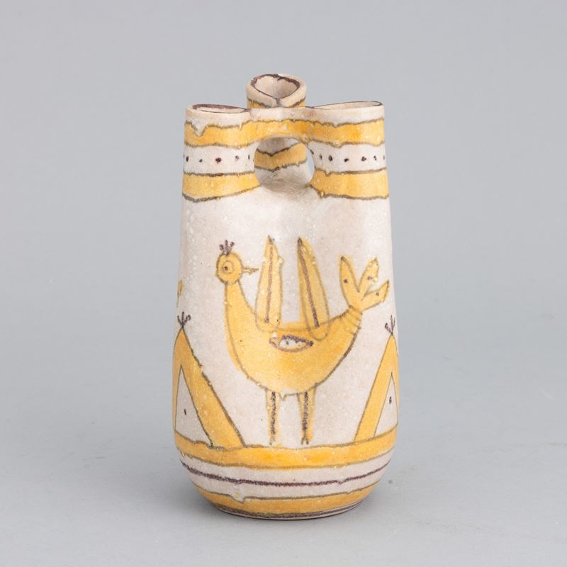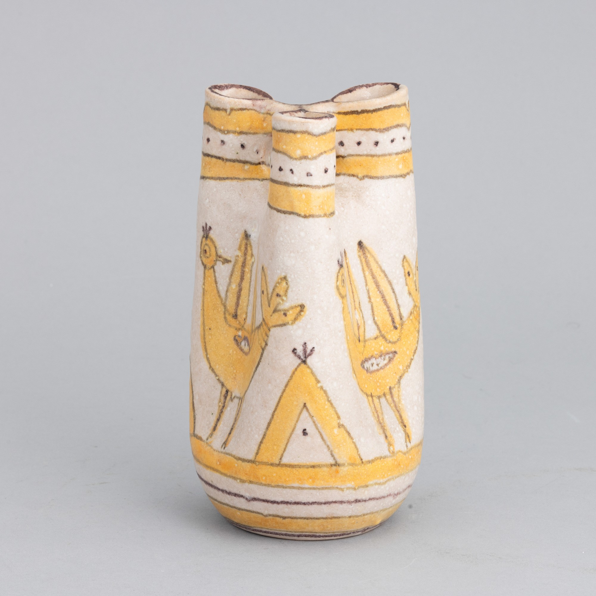 Rare tiled earthenware vase with three mouths with salt enamels decorations depicting stylized birds and abstract bands.