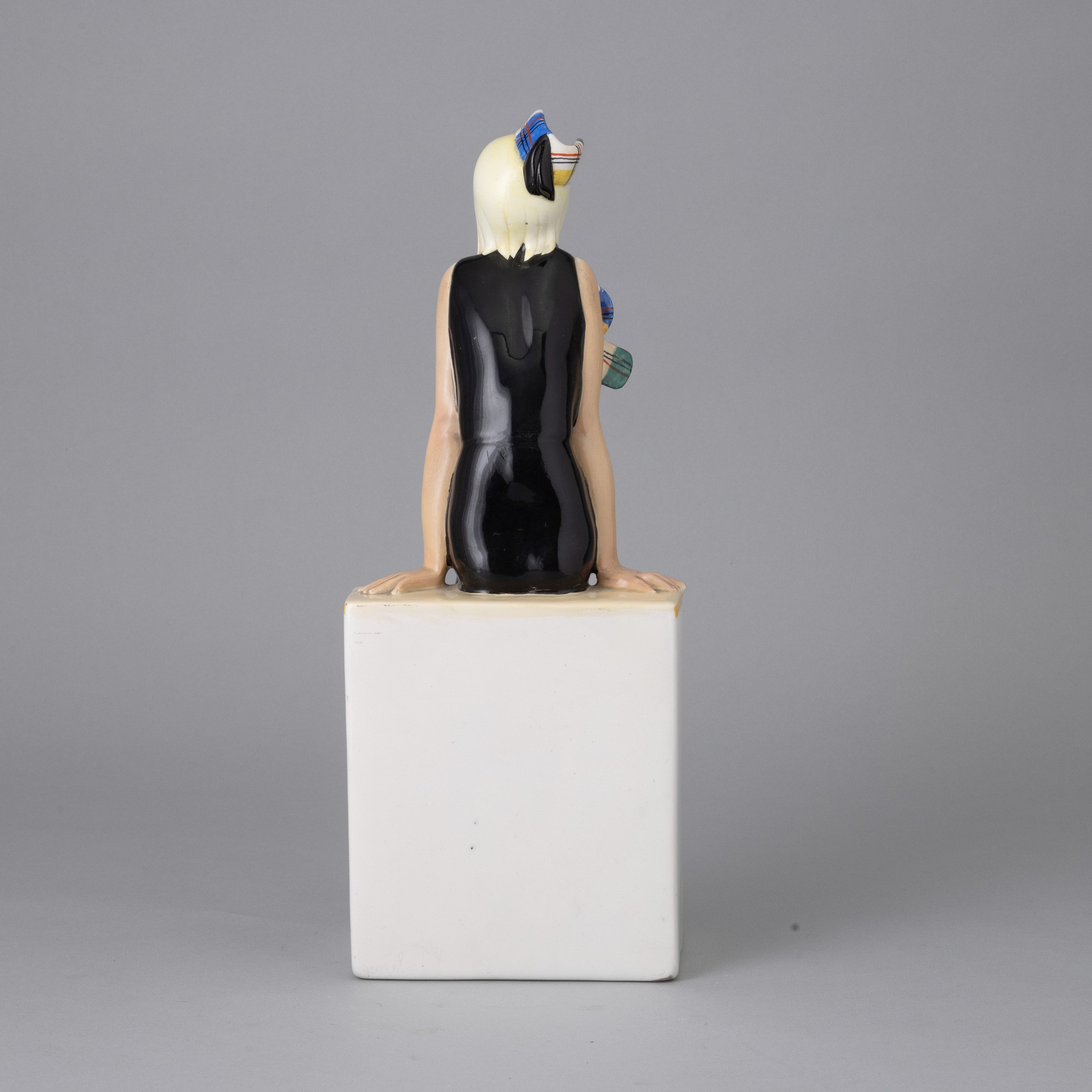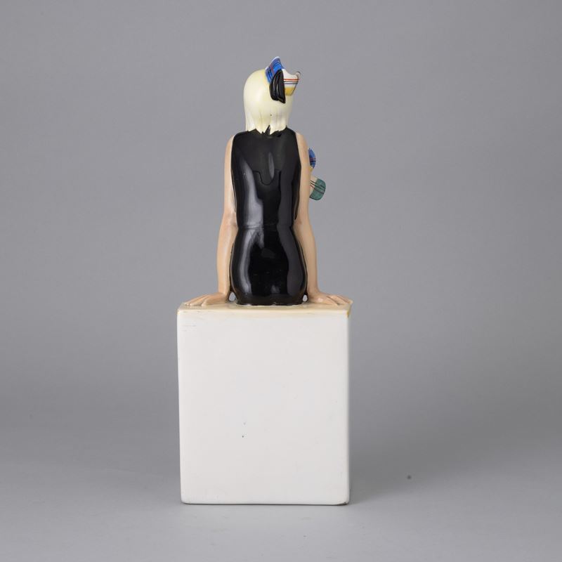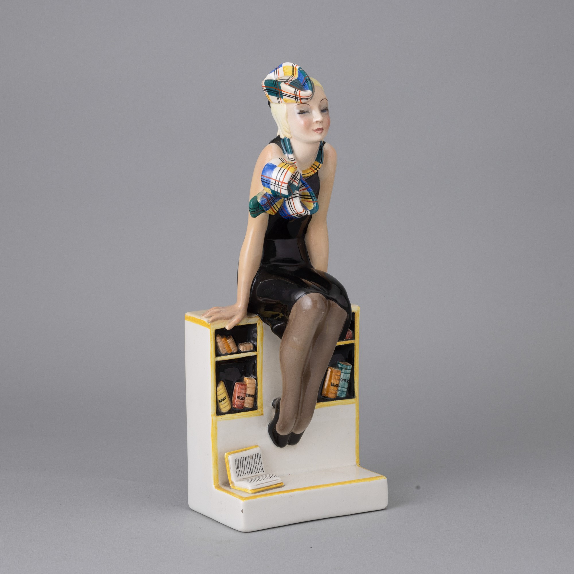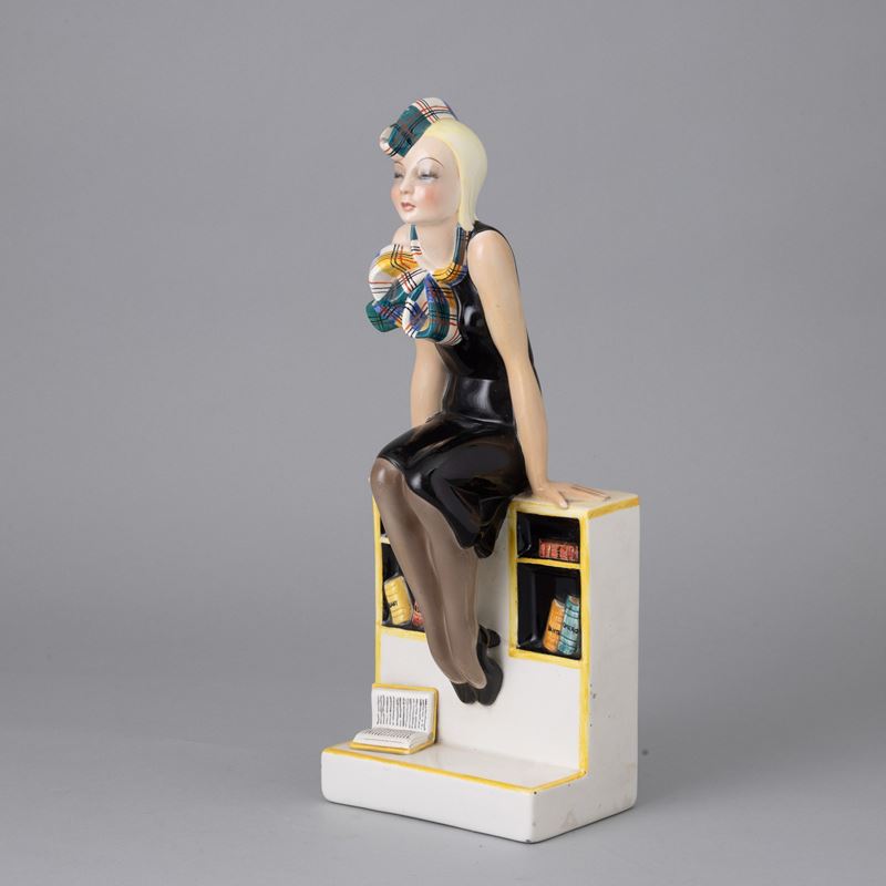 Figura raffigurante ragazza con cappello e grande foulard seduta su libreria in terraglia a colaggio con decoro policromo.