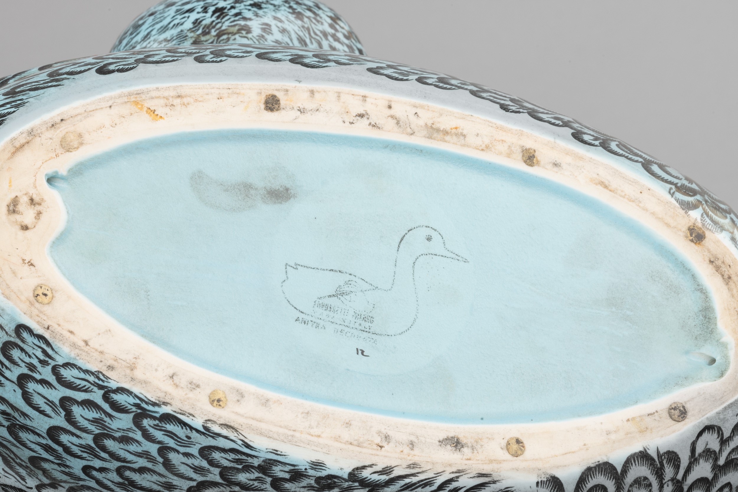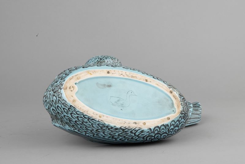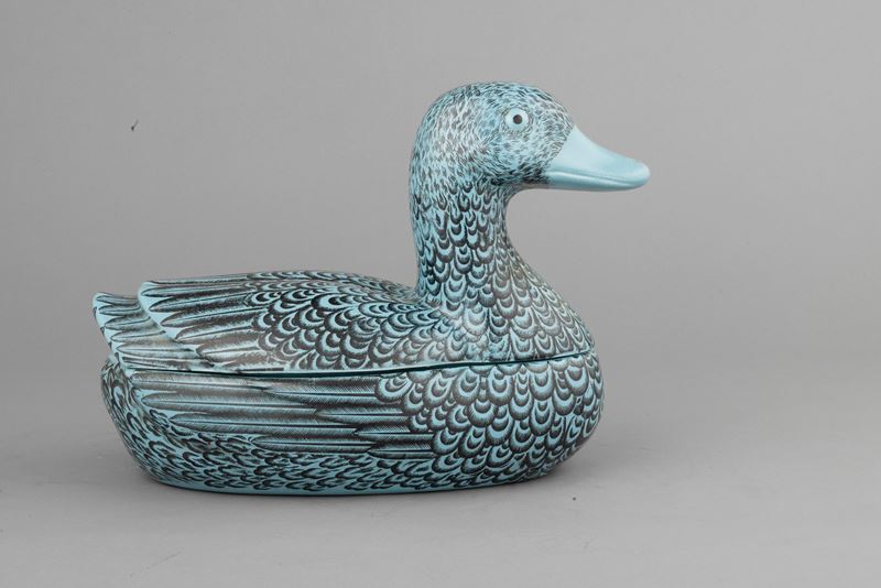 Zuppiera in forma di anatra in terraglia a colaggio con decoro serigrafato su fondo turchese.