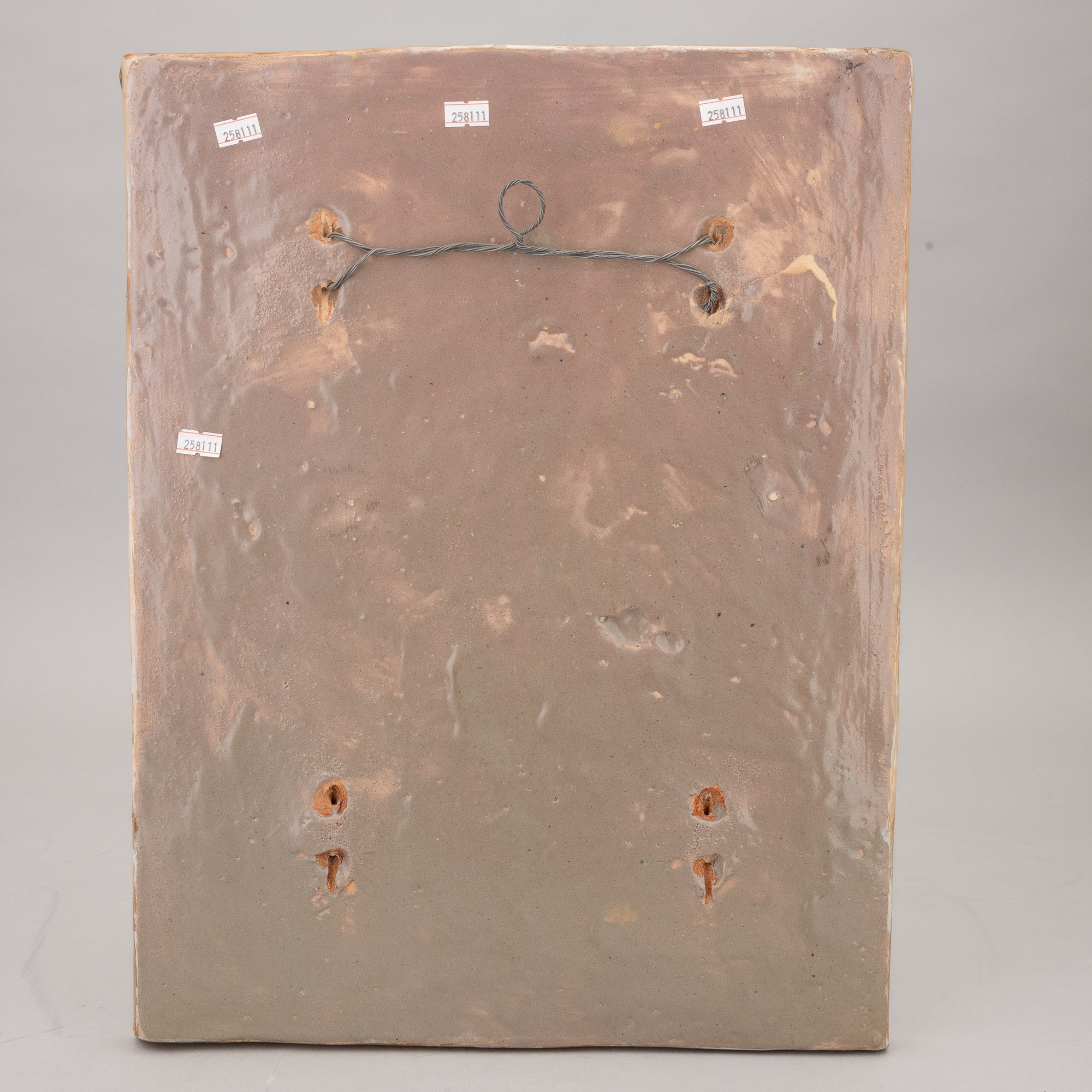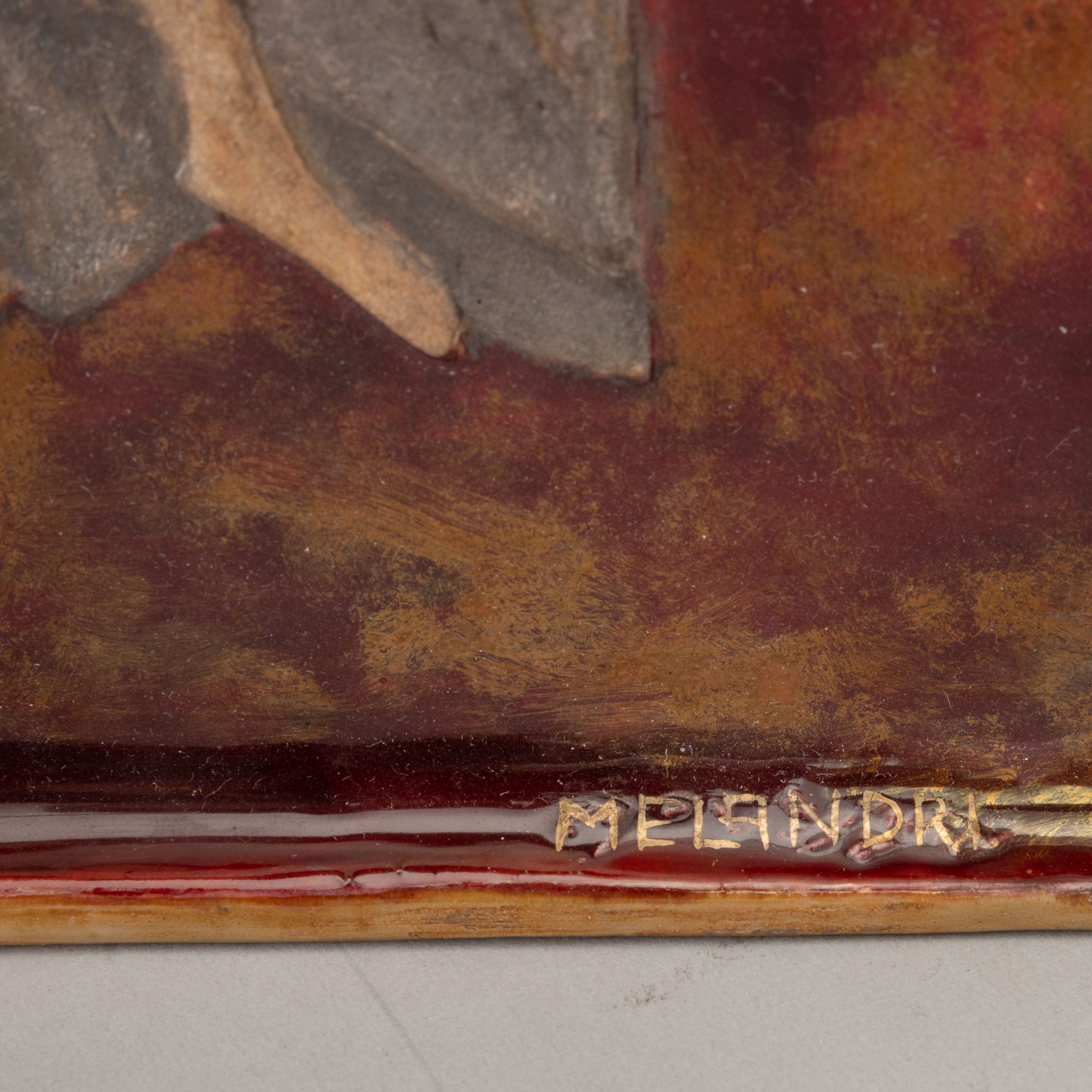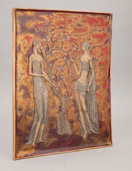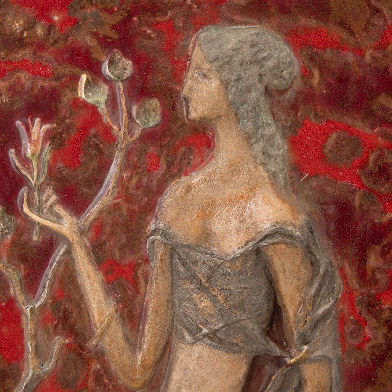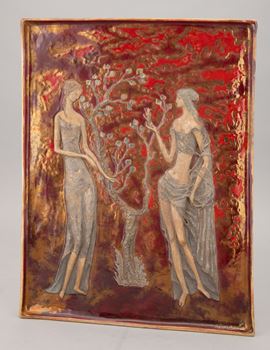 Plaque with muse representations in bas-relief with decoration in lustruos polychrome.