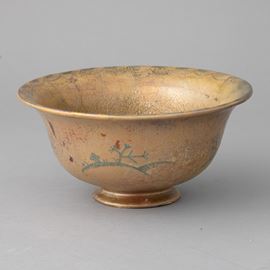 Bell-shaped cup with flared ceramic foot, with spinning machine decoration. Surface is entirely lustrated.