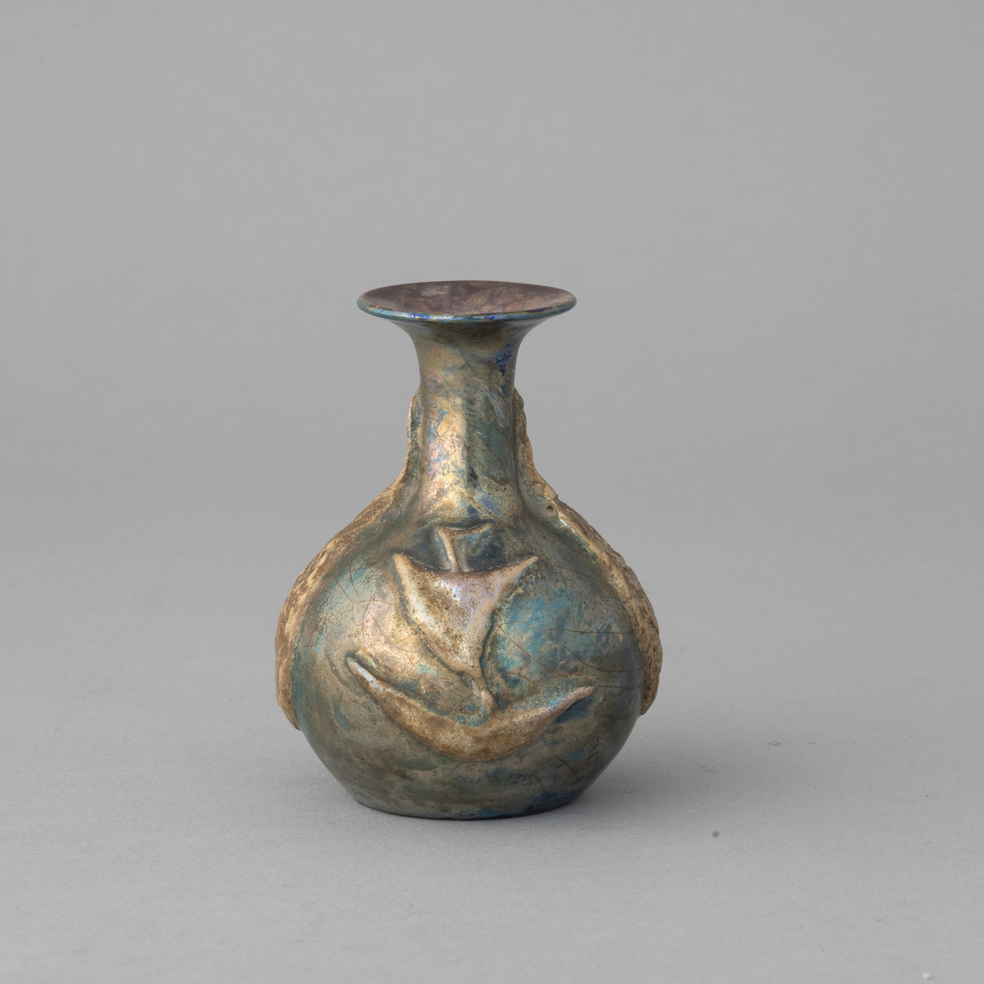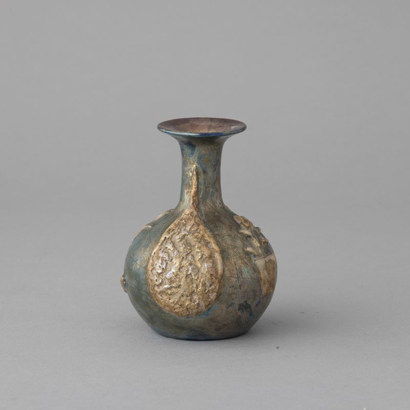 Small amphora vase with relief decorations on a lustrous background.
