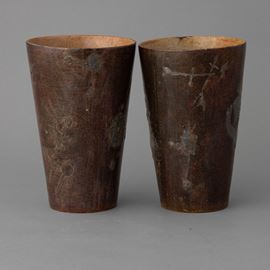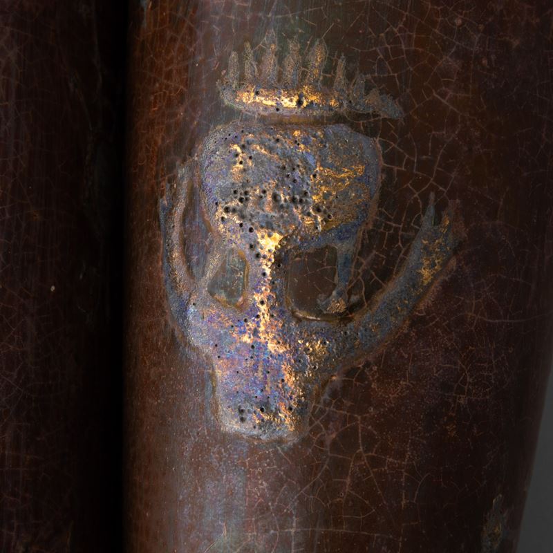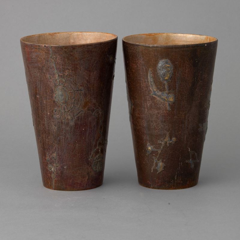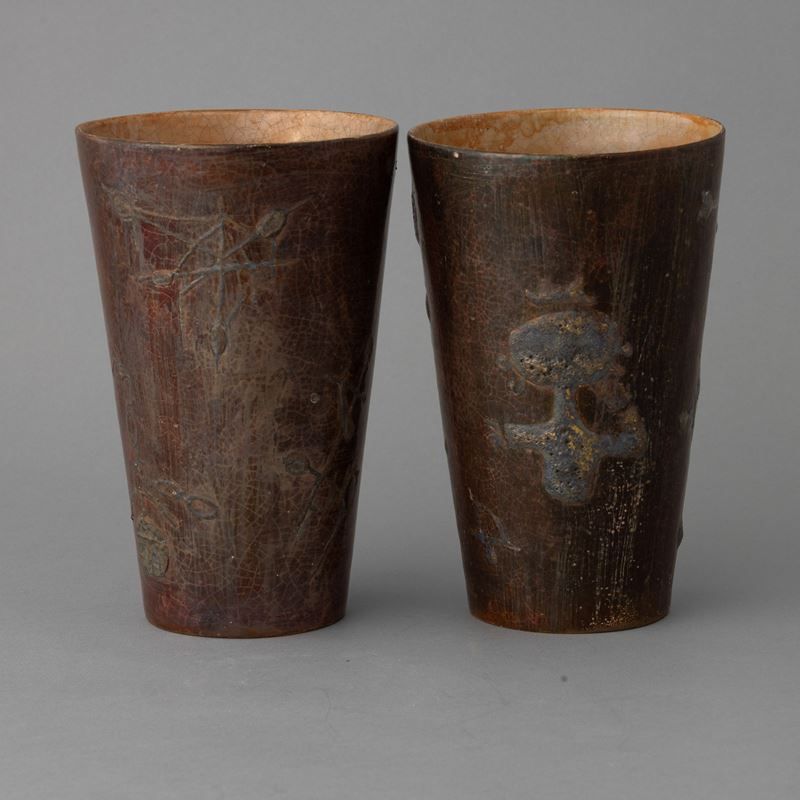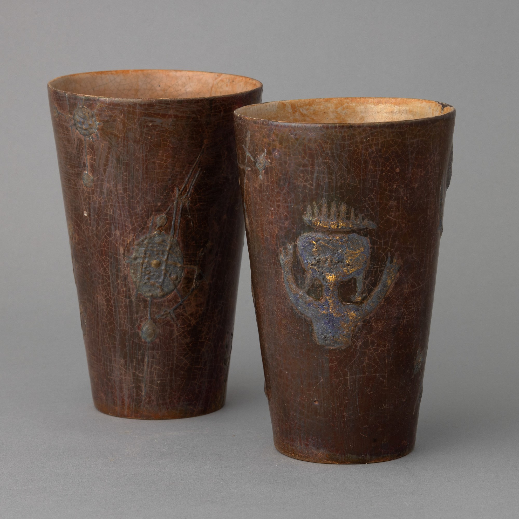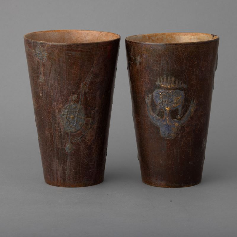 Pair of truncated ceramic pots with enamel and glossy decoration and relief applications.