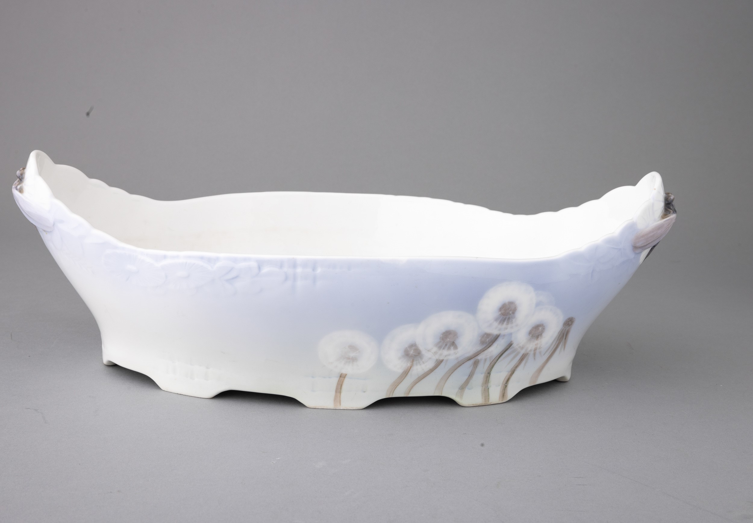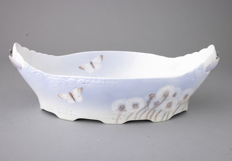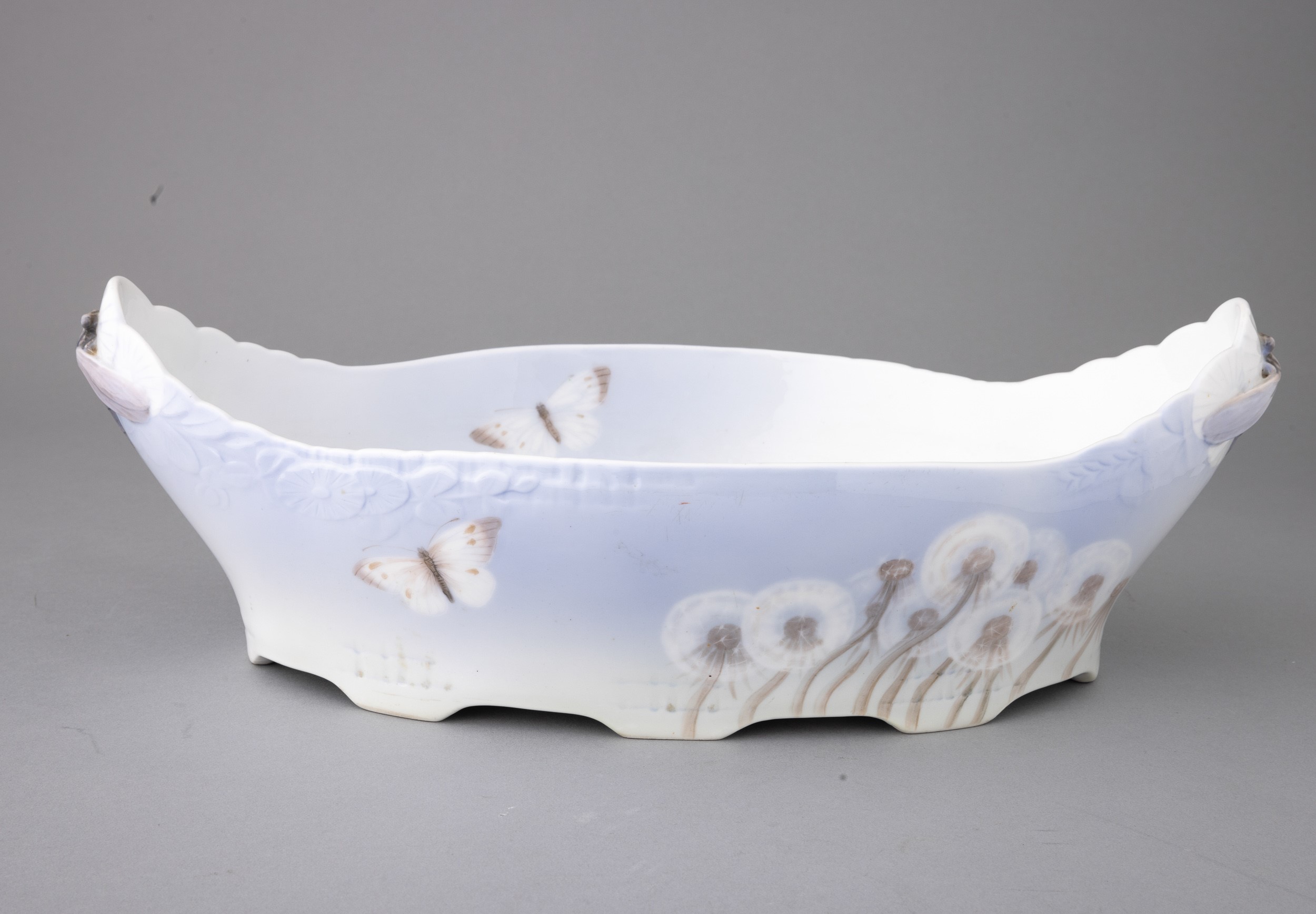 Large porcelain centerpiece, boat shaped with butterflied decoration in relief and blowers on a shaded background. Dragonfly shaped handles.
