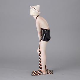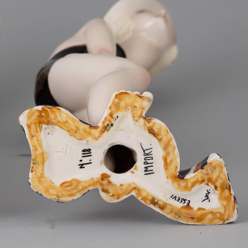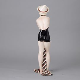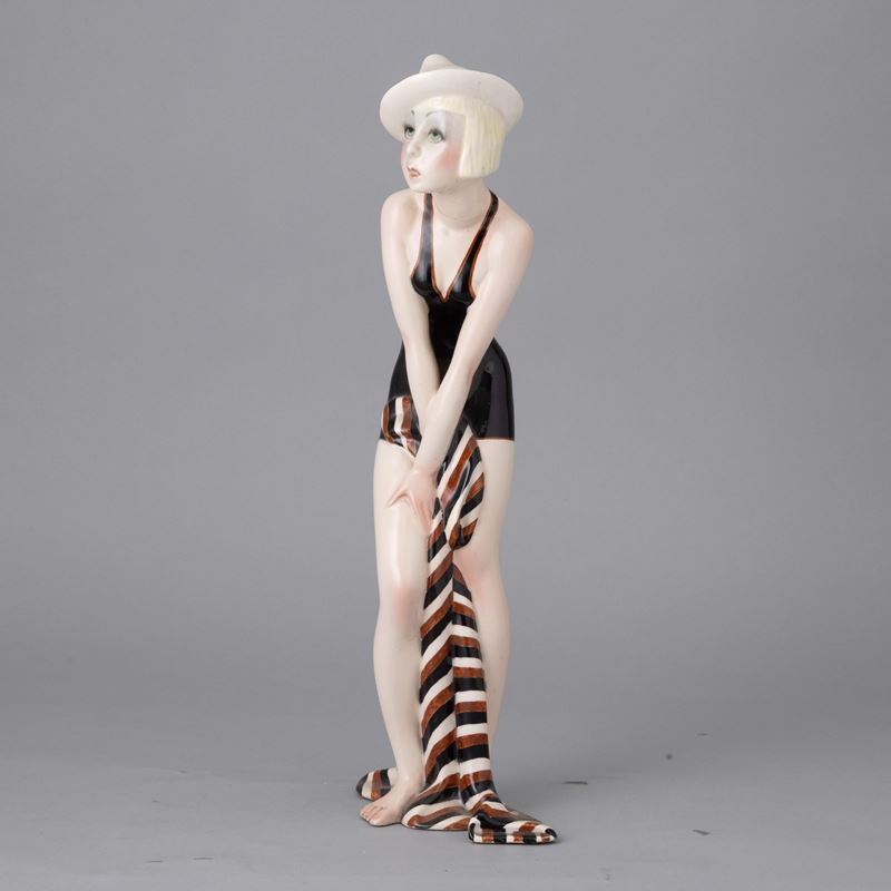 Figura di donna in costume da bagno con telo mare in terraglia a colaggio con decoro policromo.