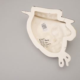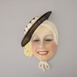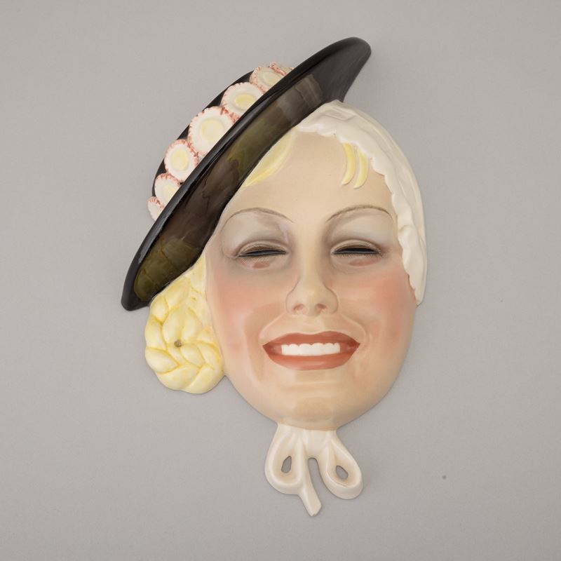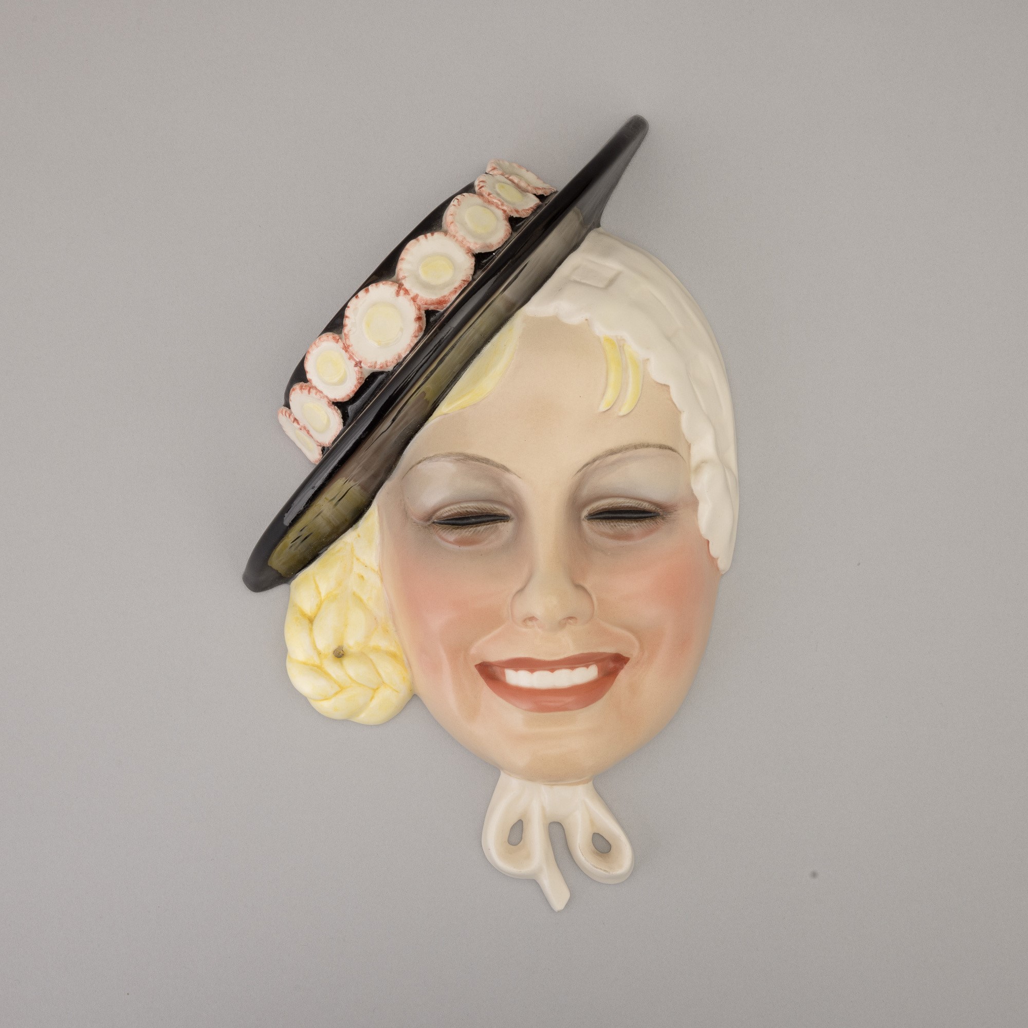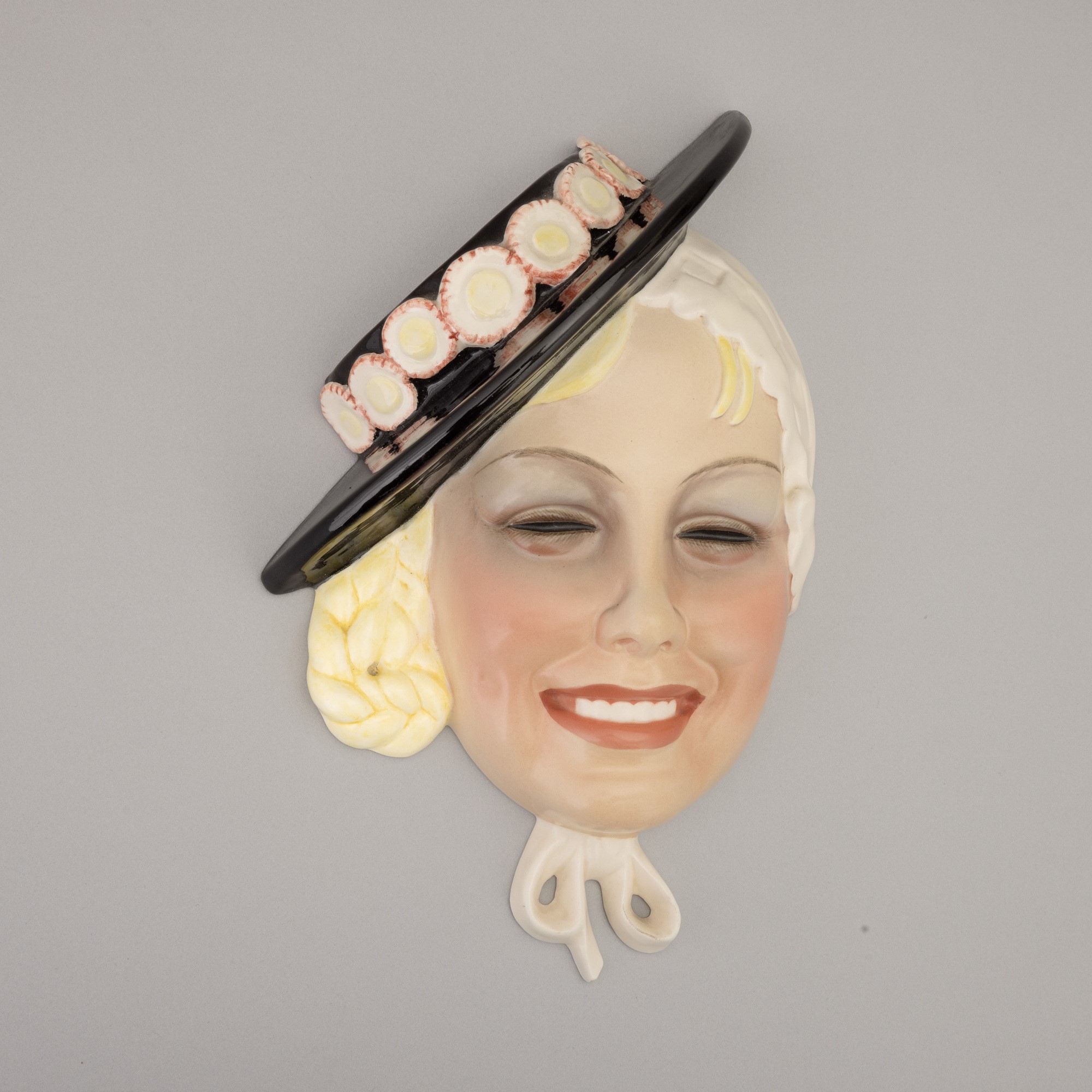 Volto di donna con cappello in terraglia a colaggio con decoro policormo.