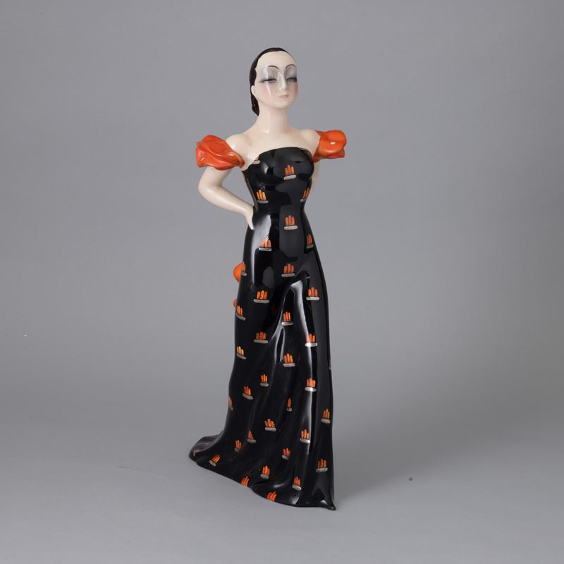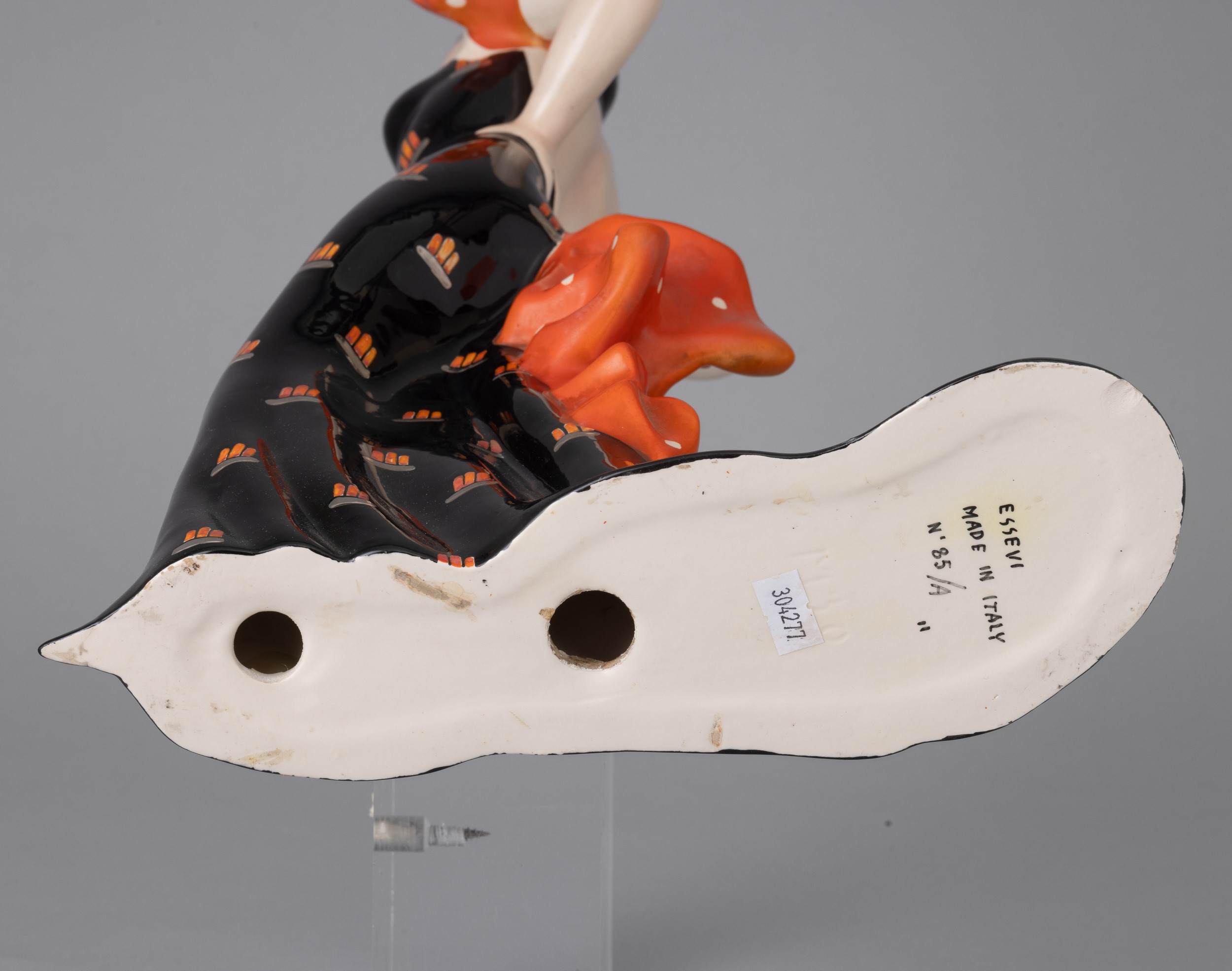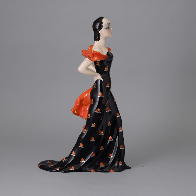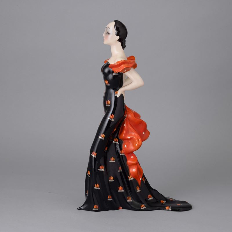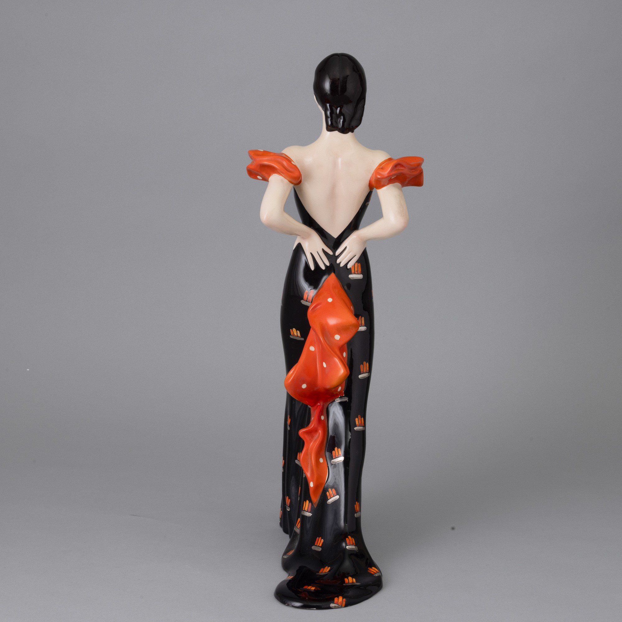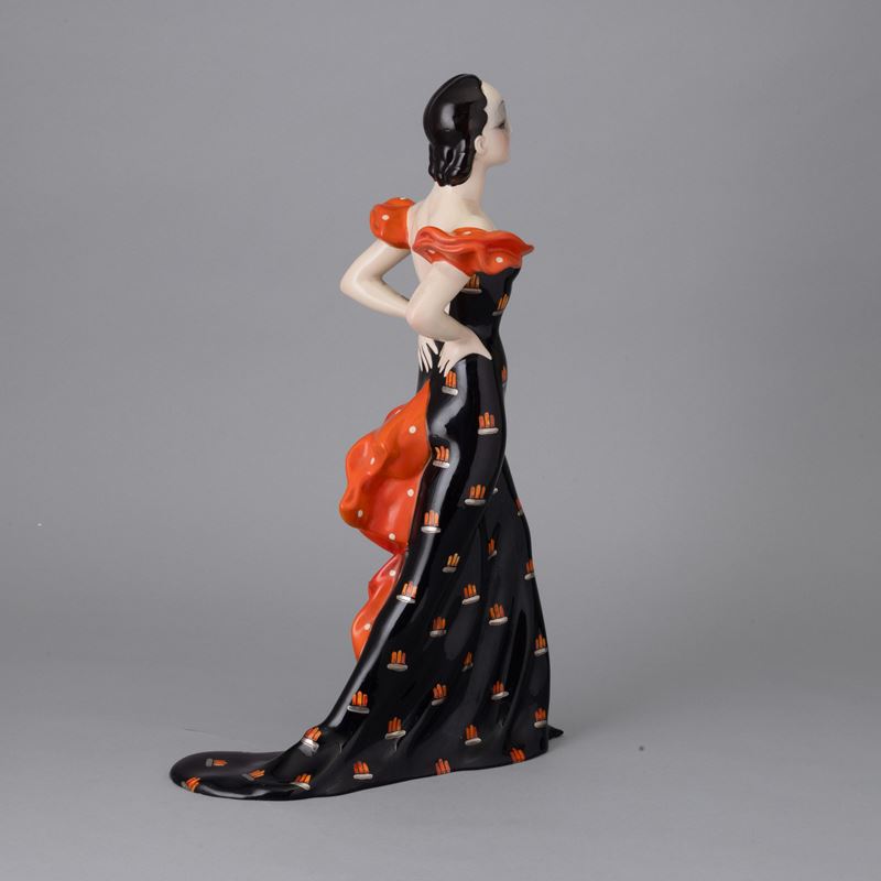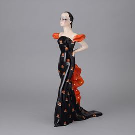 Figura di donna in lungo abito da sera con volant rosso in terraglia a colaggio con decoro policromo.