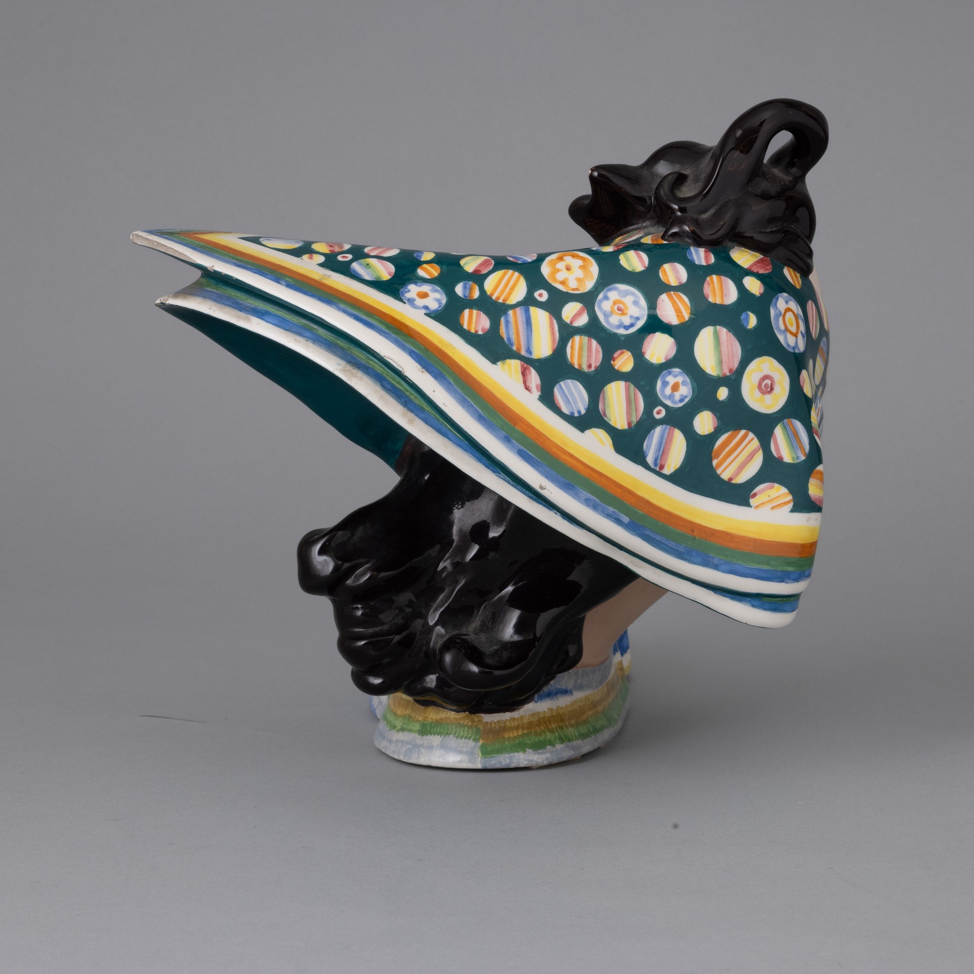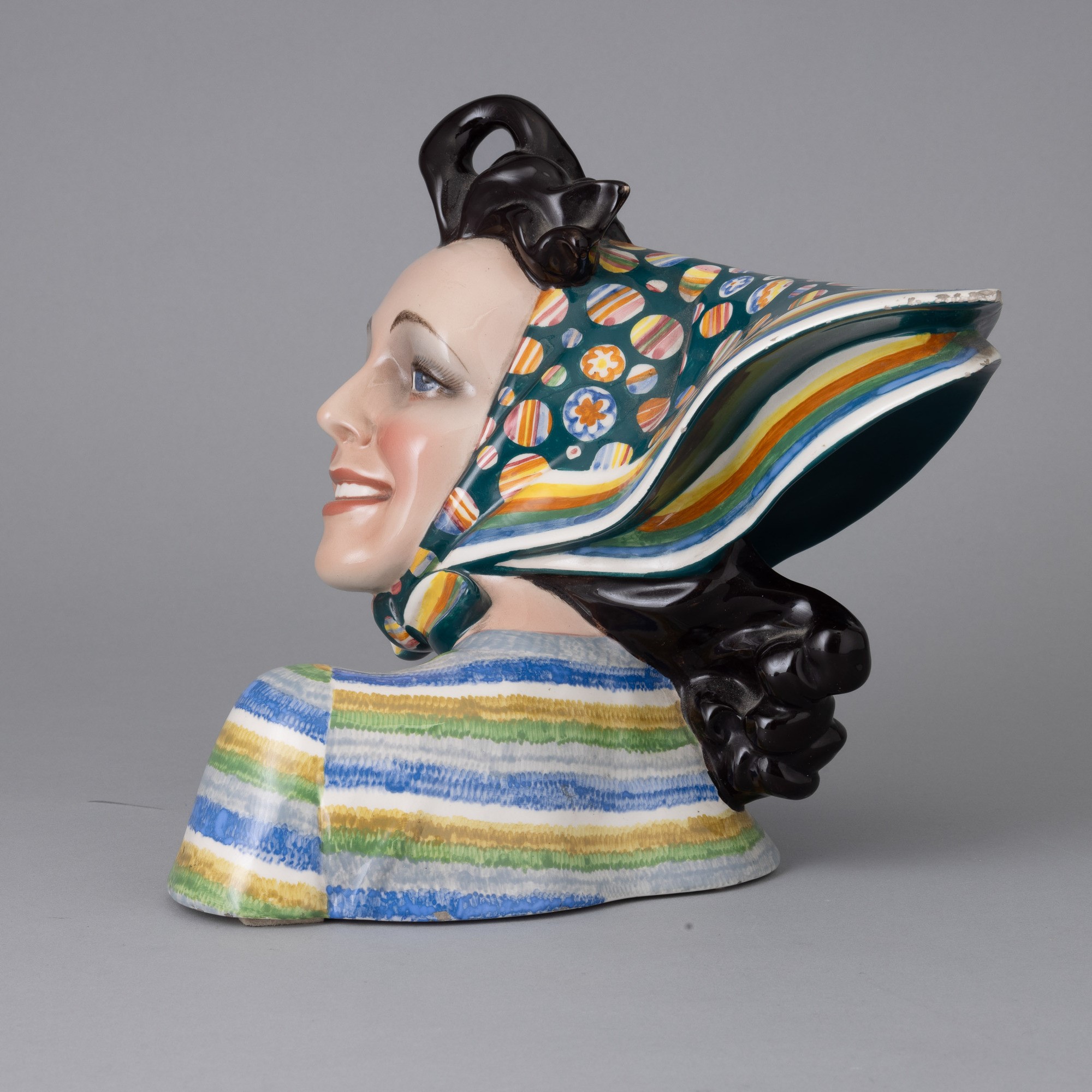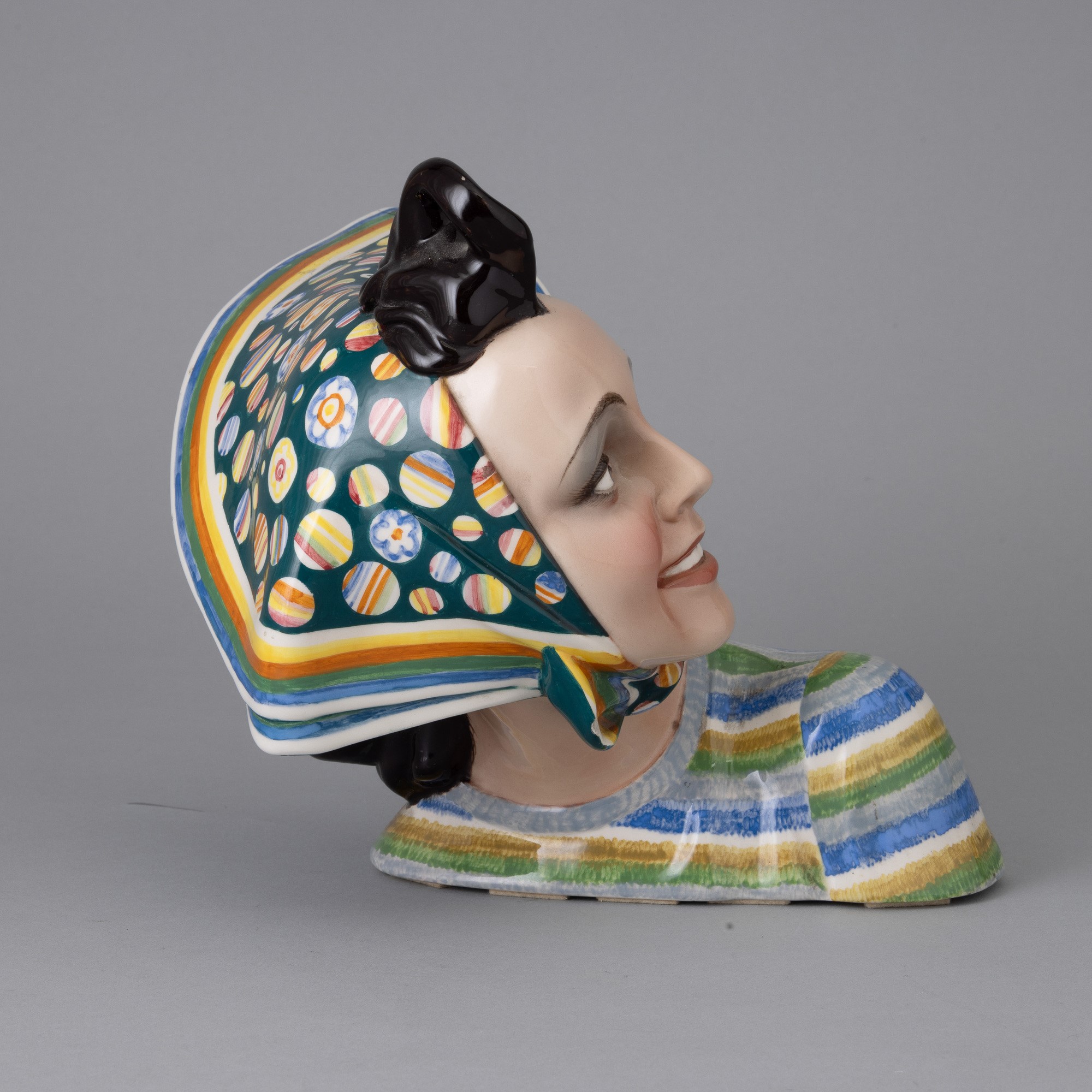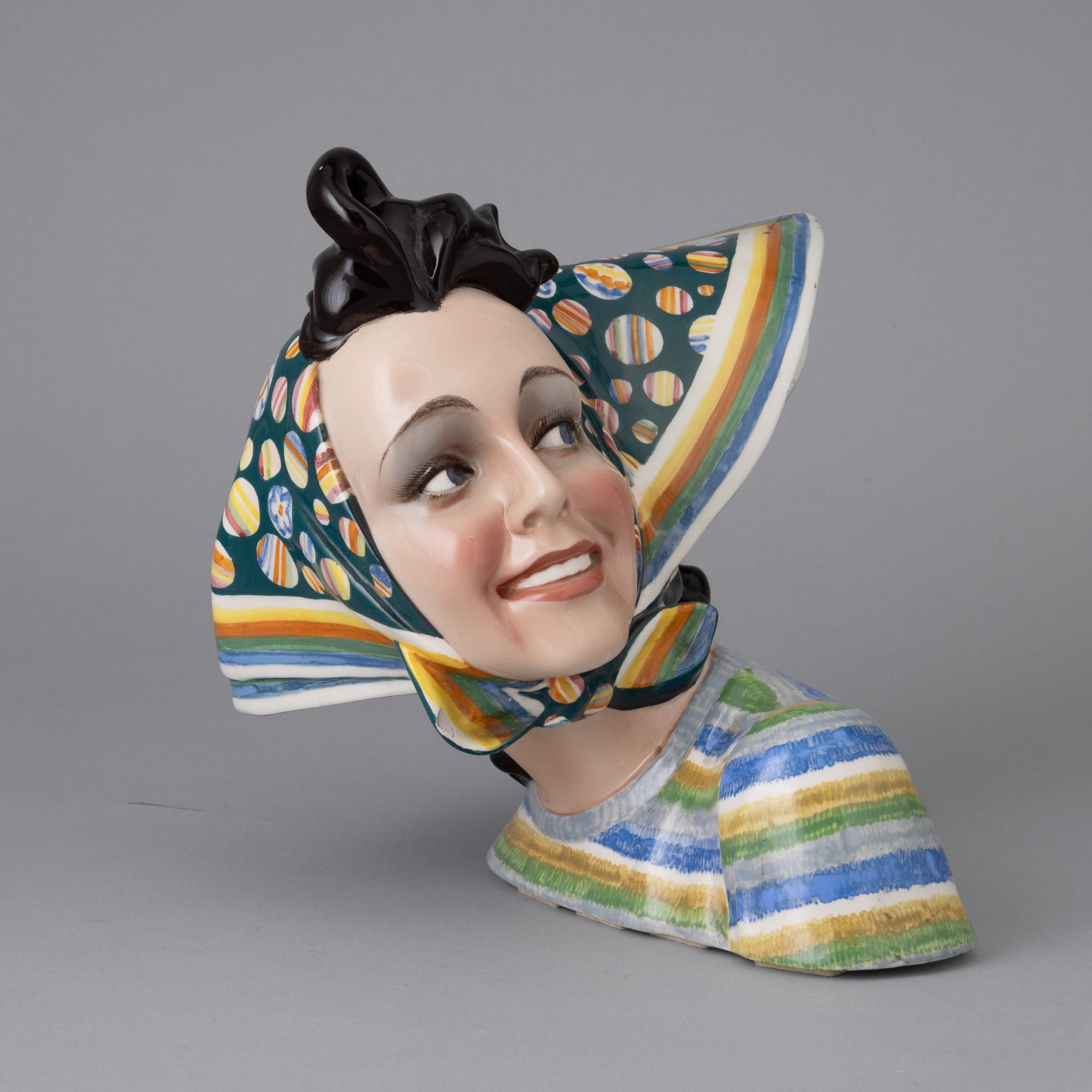 Busto di giovane donna con foulard piegato al vento in terraglia a colaggio con decoro policromo.