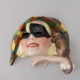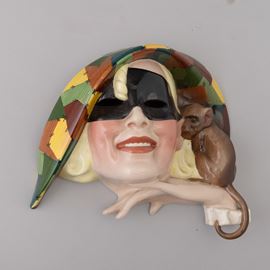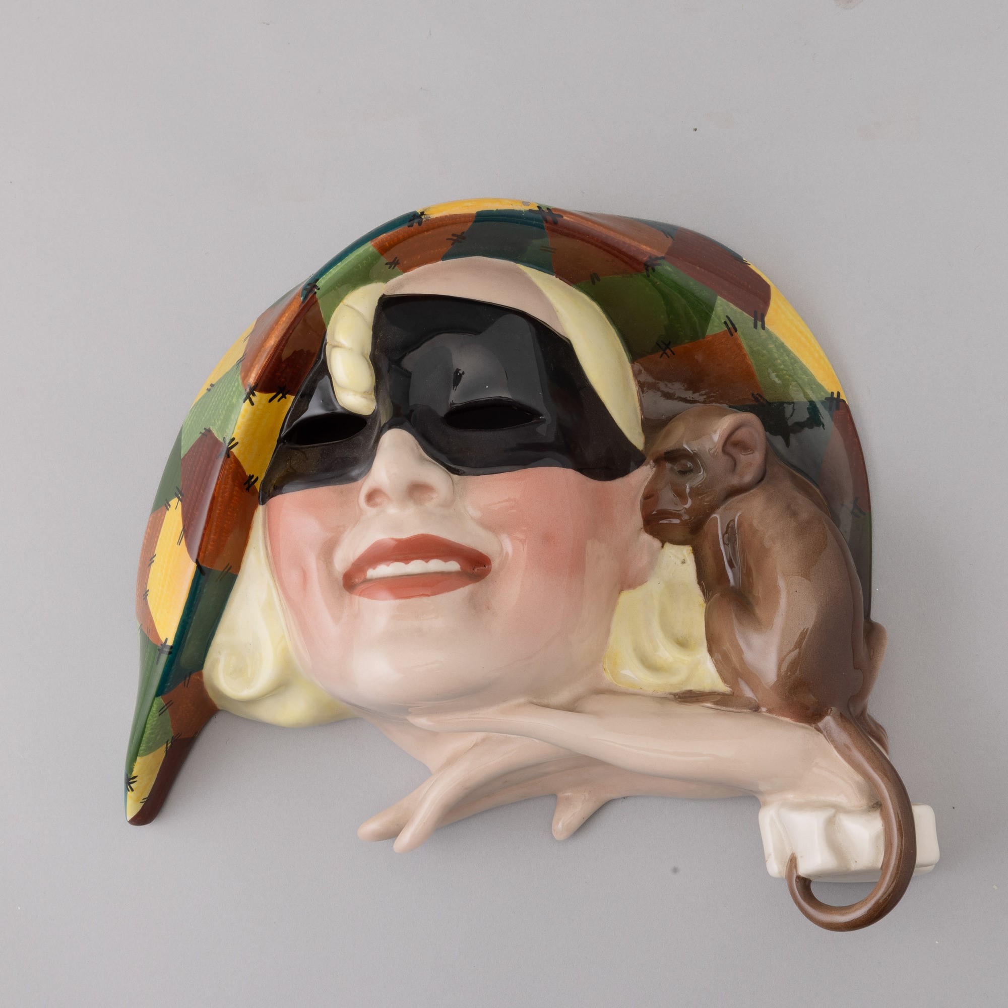 Volto di donna mascherata con scimmietta sulla mano in terraglia a colaggio con decoro policromo.