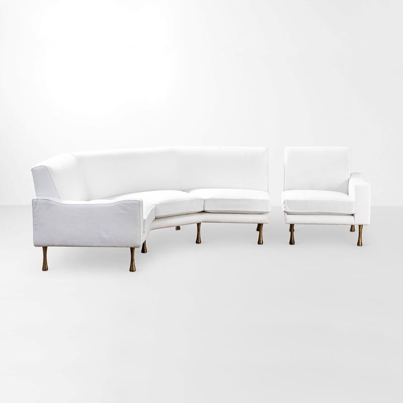 Struttura in legno, rivestimenti in tessuto e sostegni in ottone.