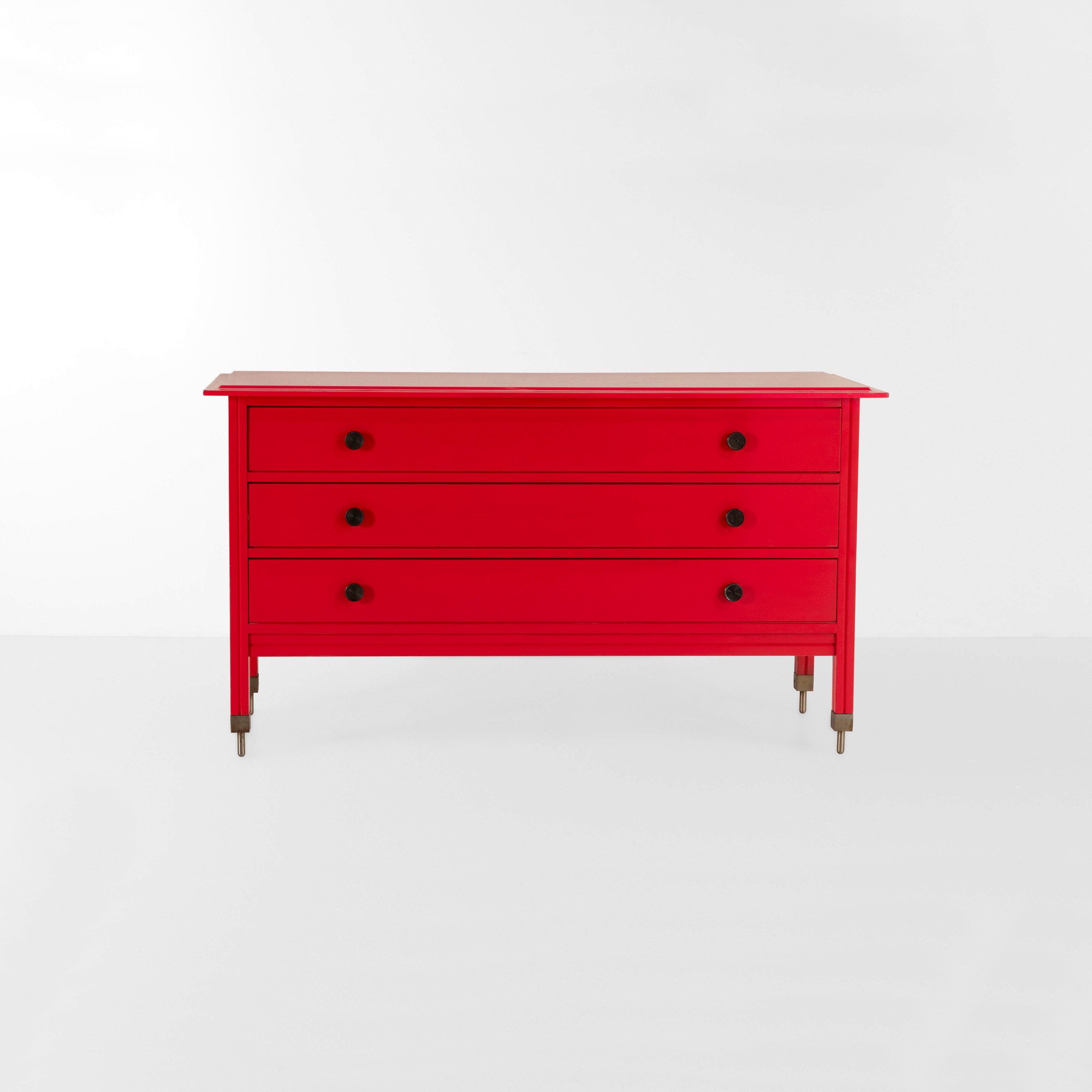 Struttura in legno laccato e particolari in ottone nichelato.