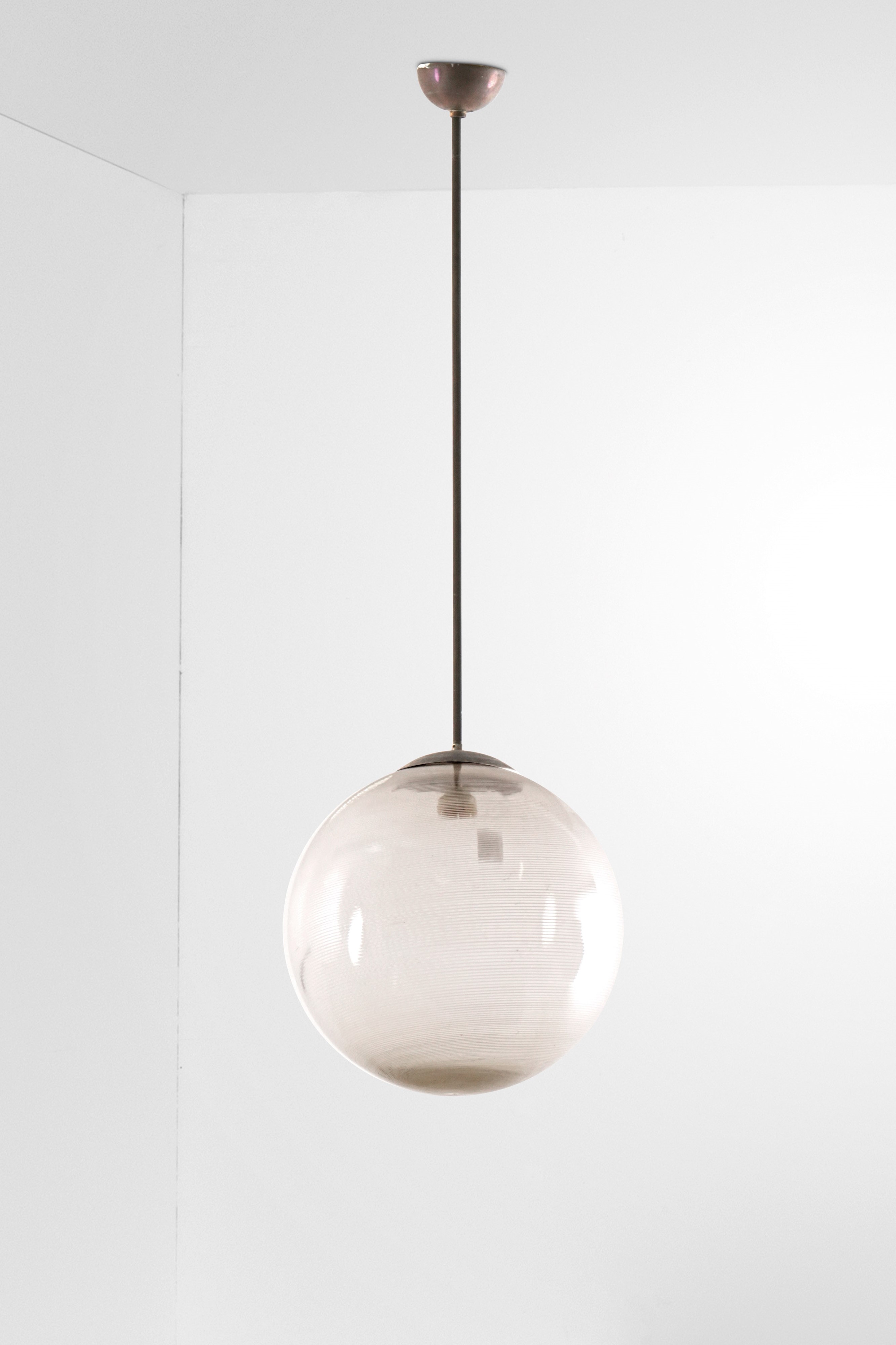 Struttura in ottone e diffusore in vetro di Murano rigato.