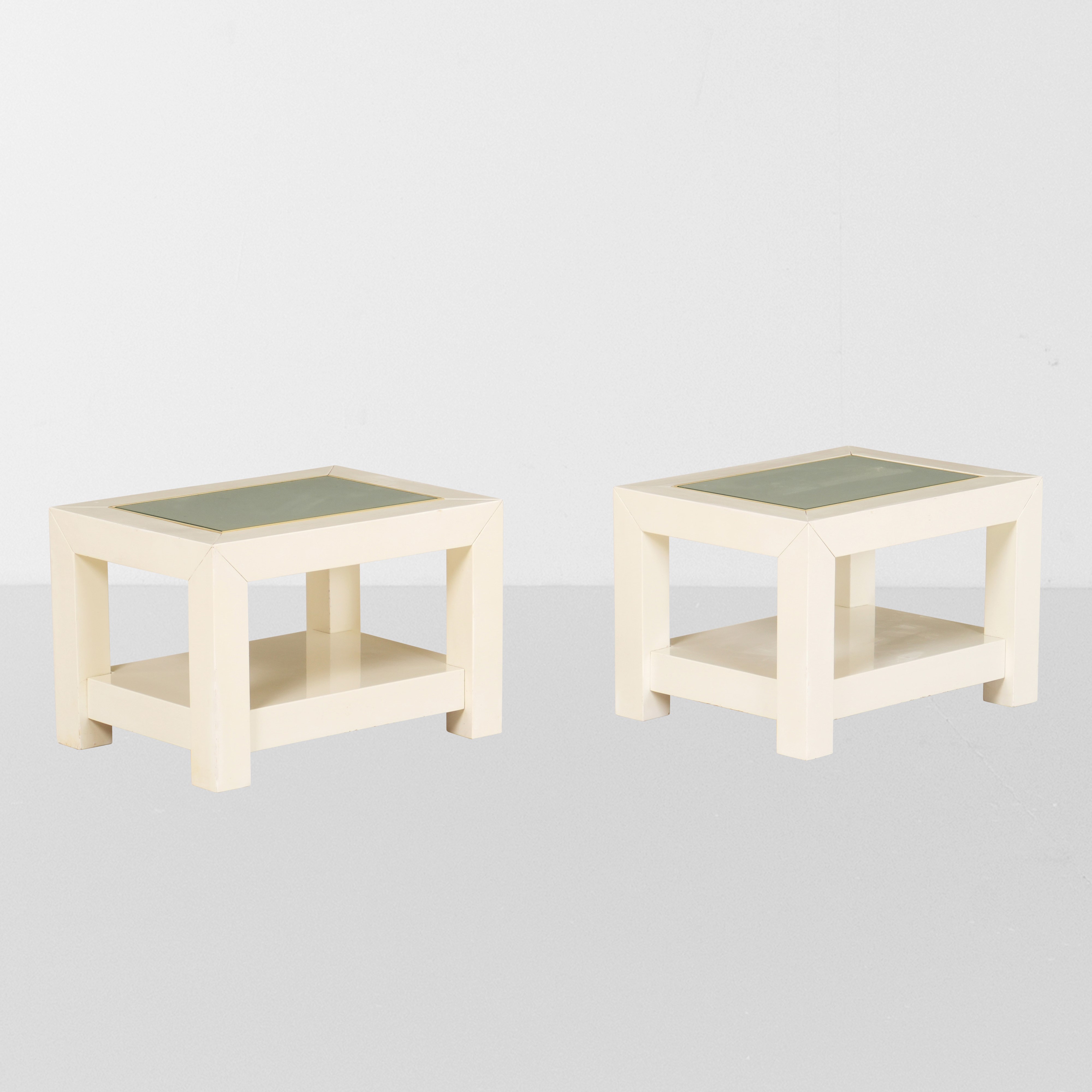 Struttura in legno laccato e ottone. Piano in vetro.