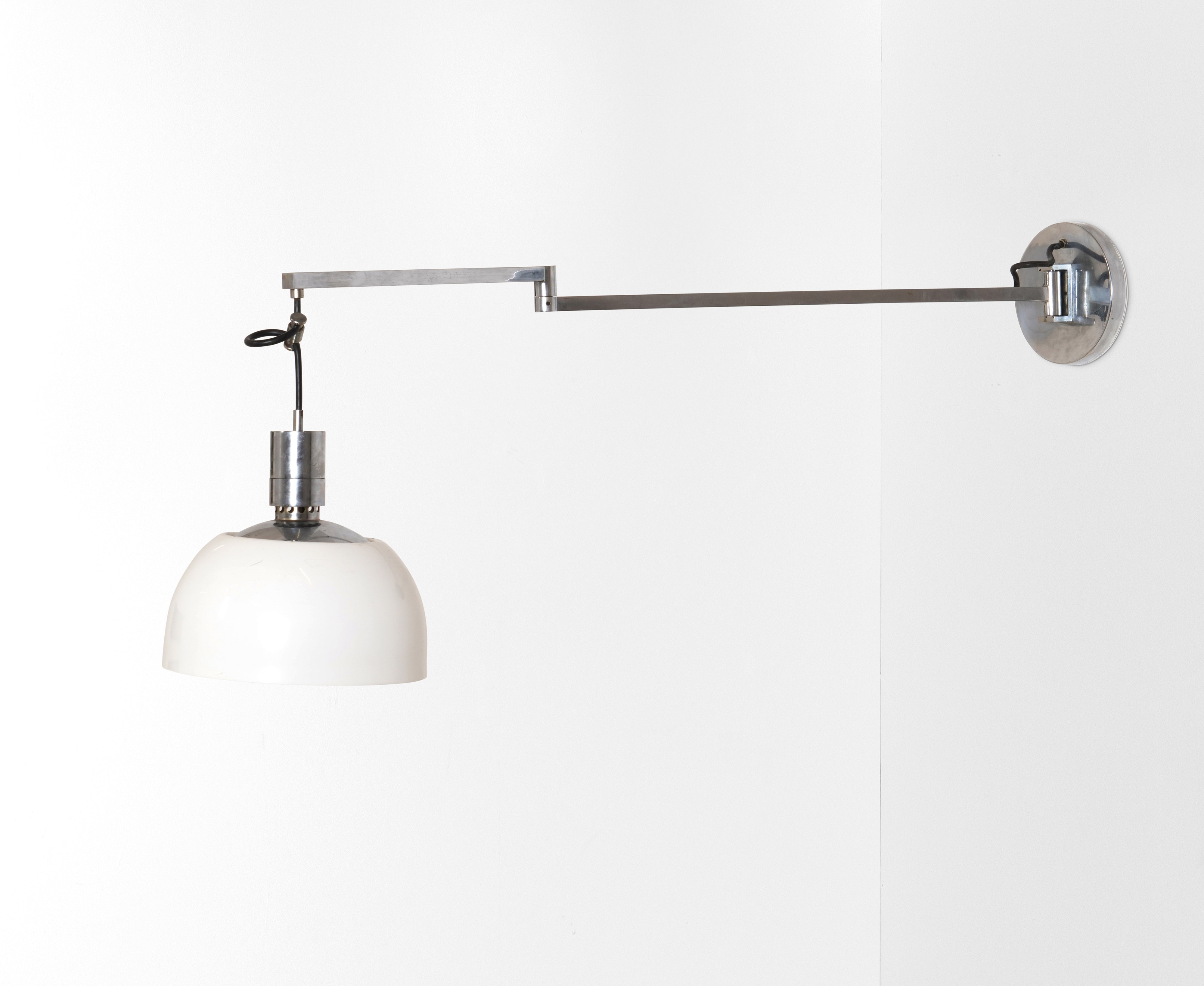 Struttura in metallo cromato e diffusore in vetro opalino.