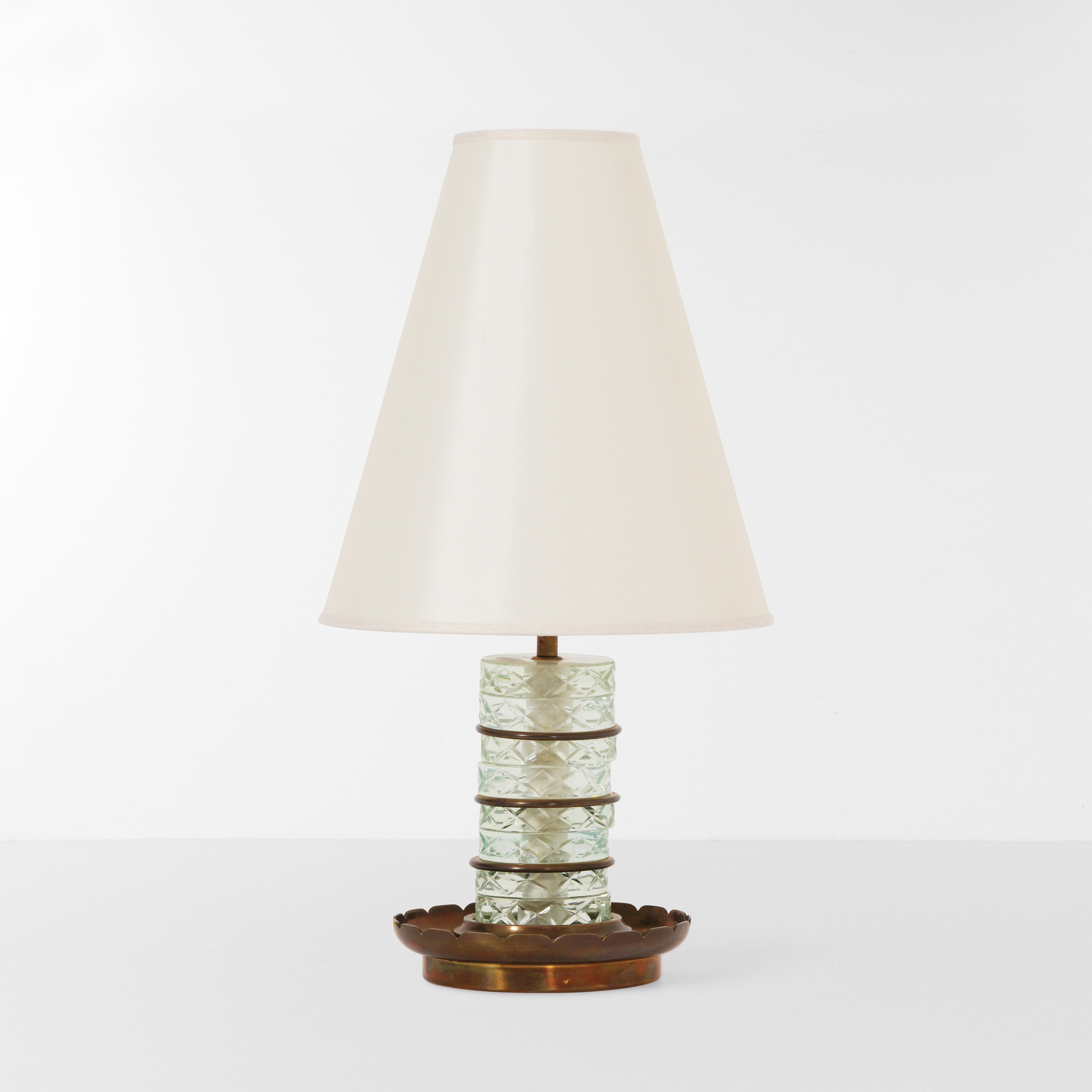 Struttura in bronzo e vetro, paralume in tessuto.
