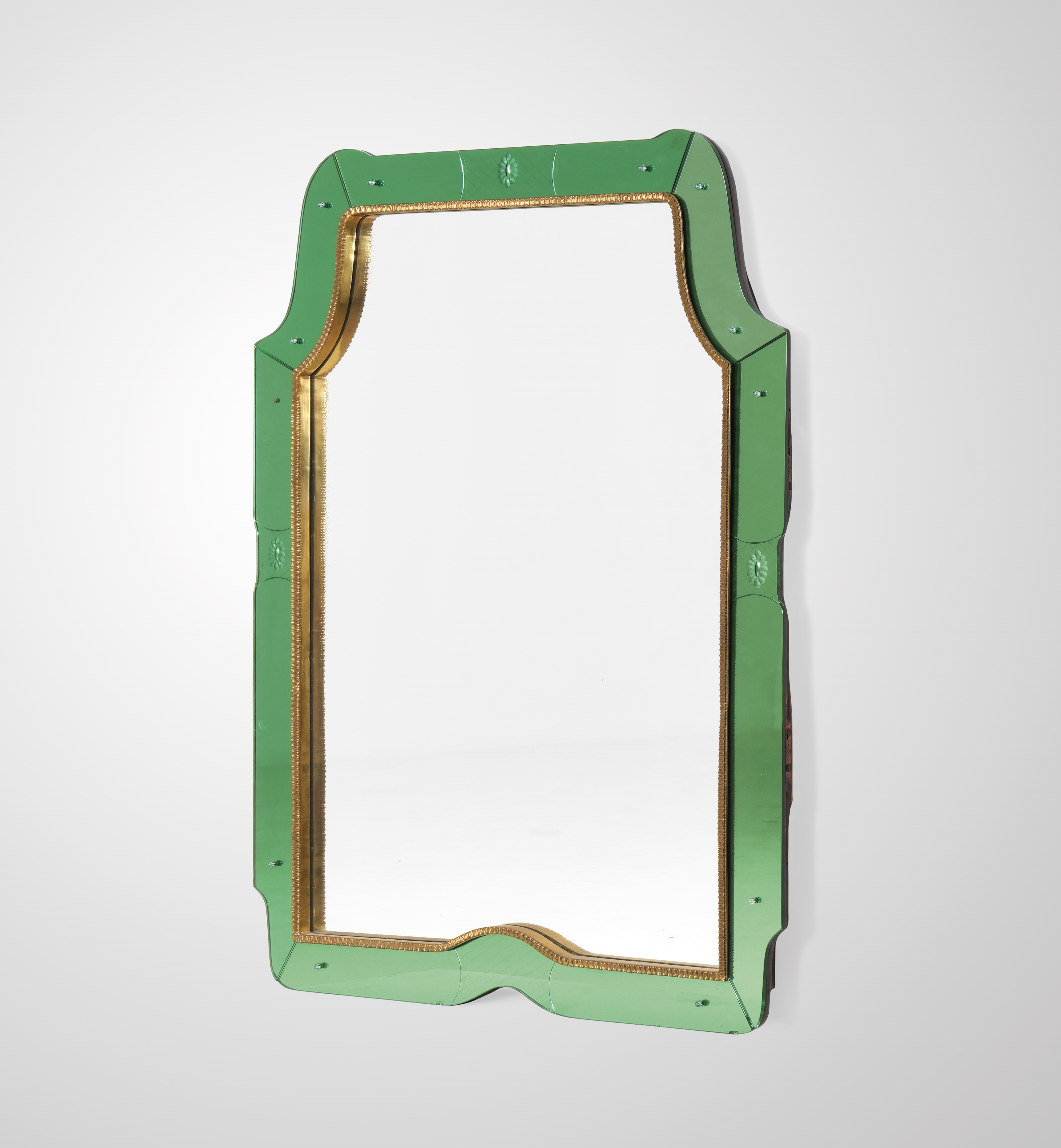 Struttura in legno e legno dorato con cornice in vetro colorato specchiato.