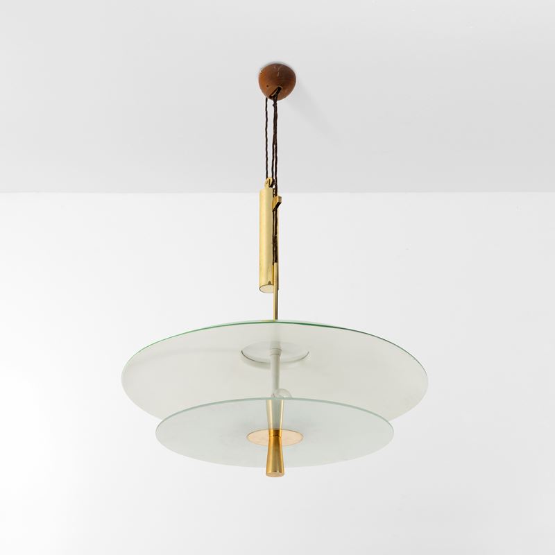 Struttura in ottone e metallo laccato con diffusore in cristallo satinato. Meccanismo di regolazione dell'altezza a contrappeso.
