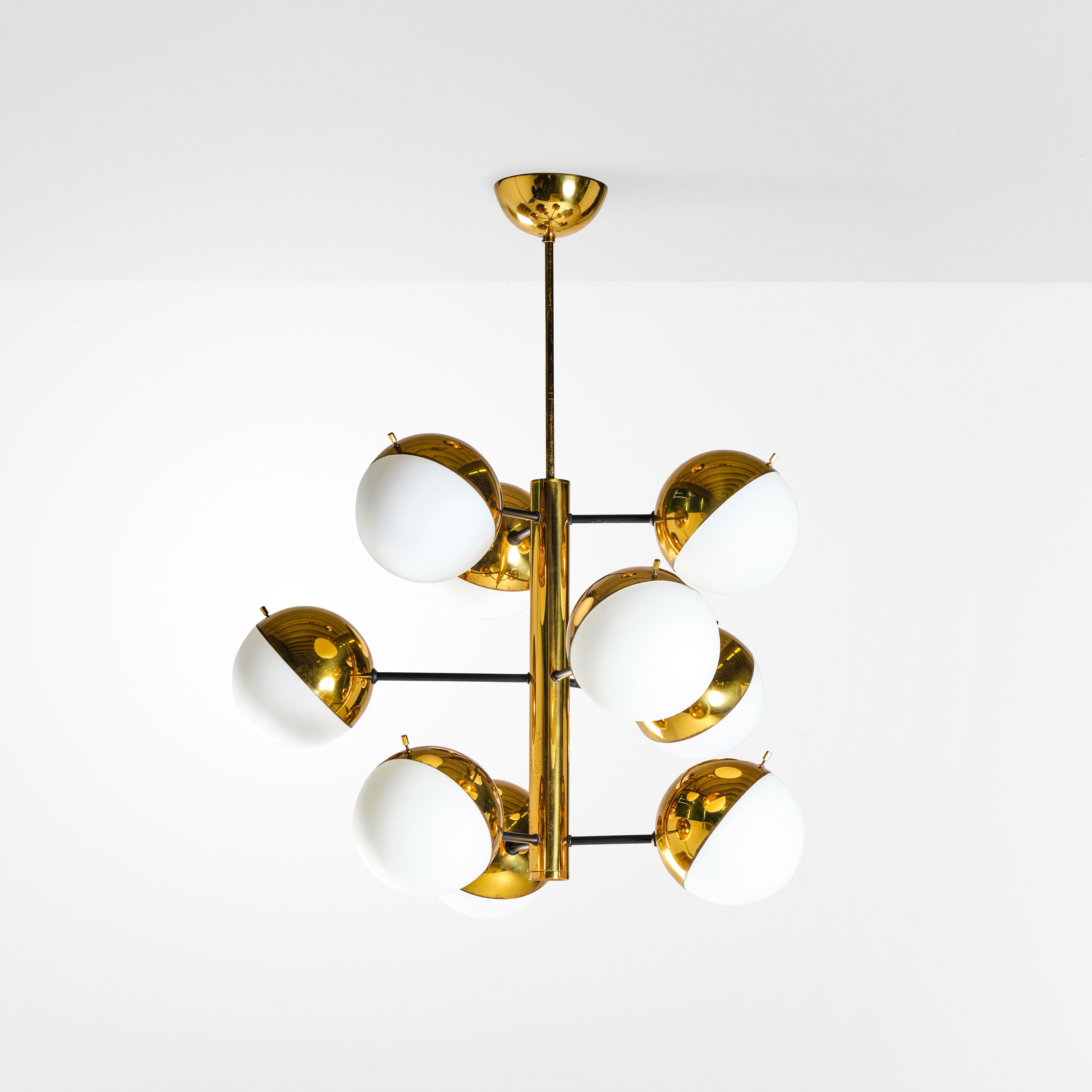 Struttura in metallo, metallo laccato e ottone. Diffusori in vetro opalino.