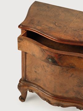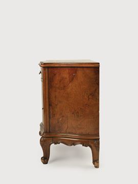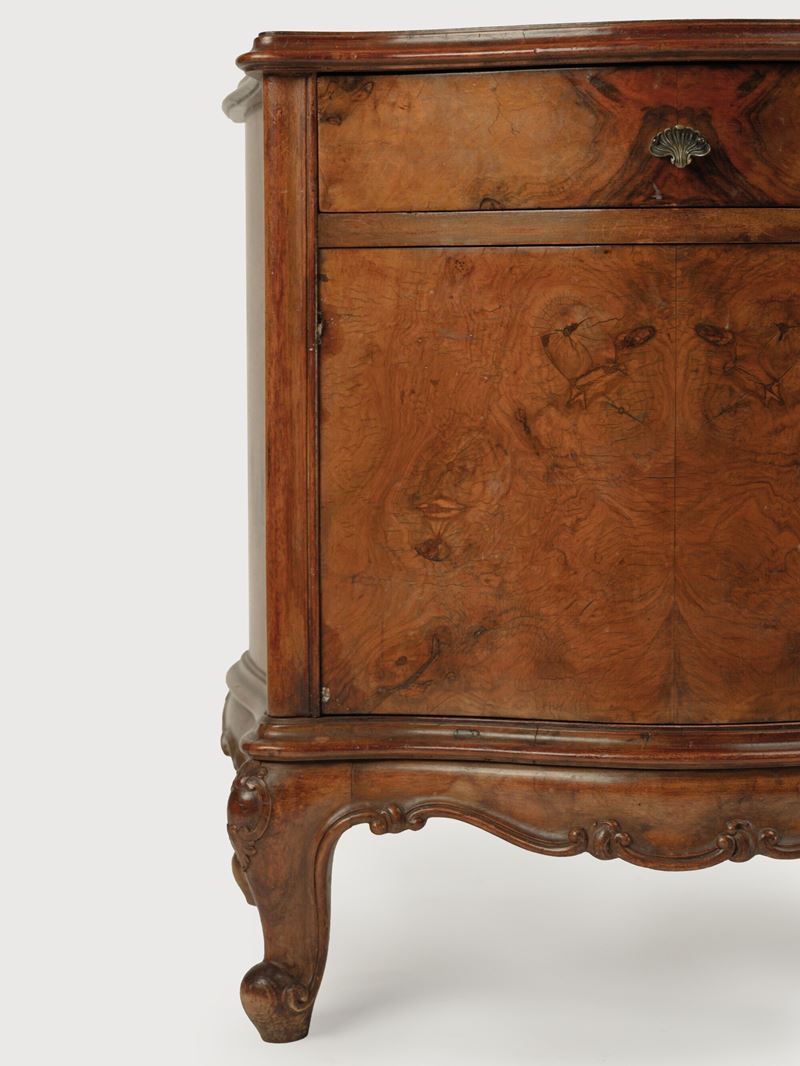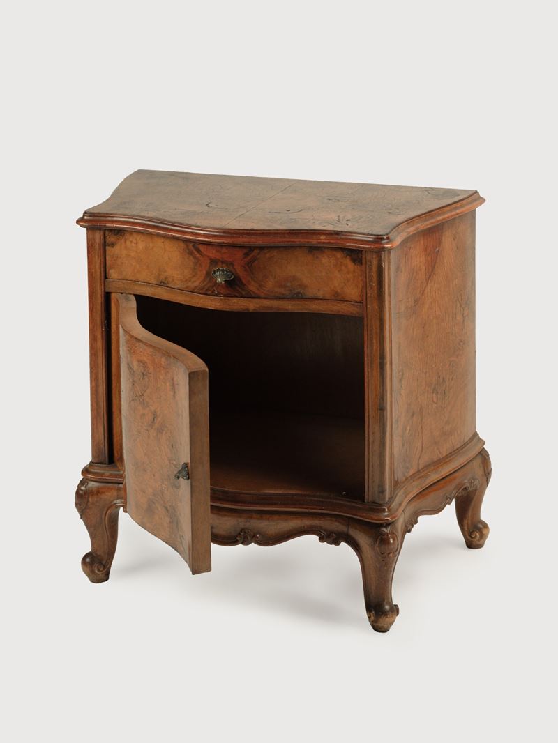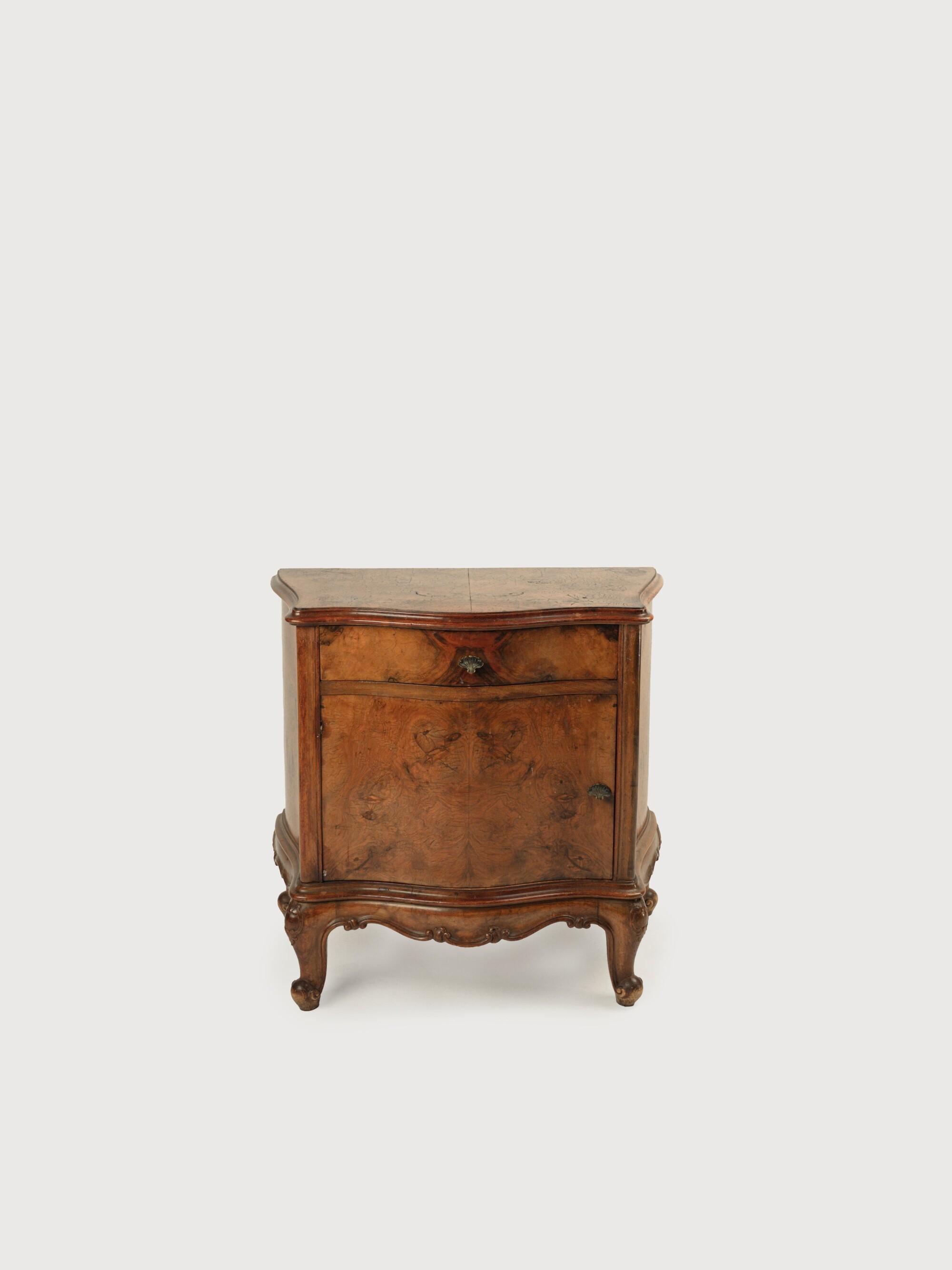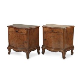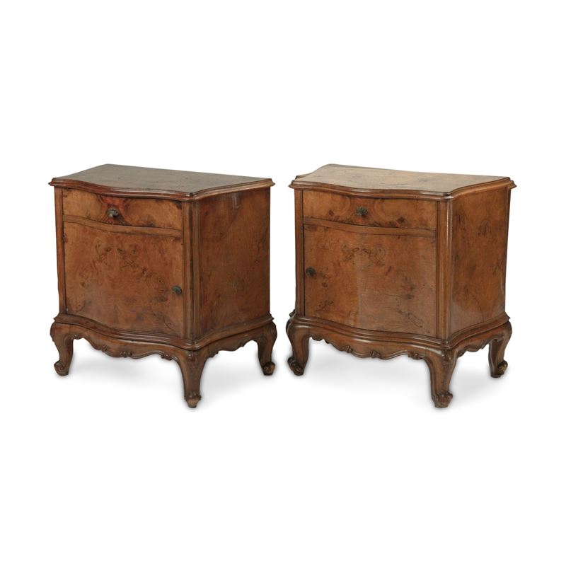 Coppia di comodini impiallacciati in radica di noce in stile settecentesco, XX secolo
