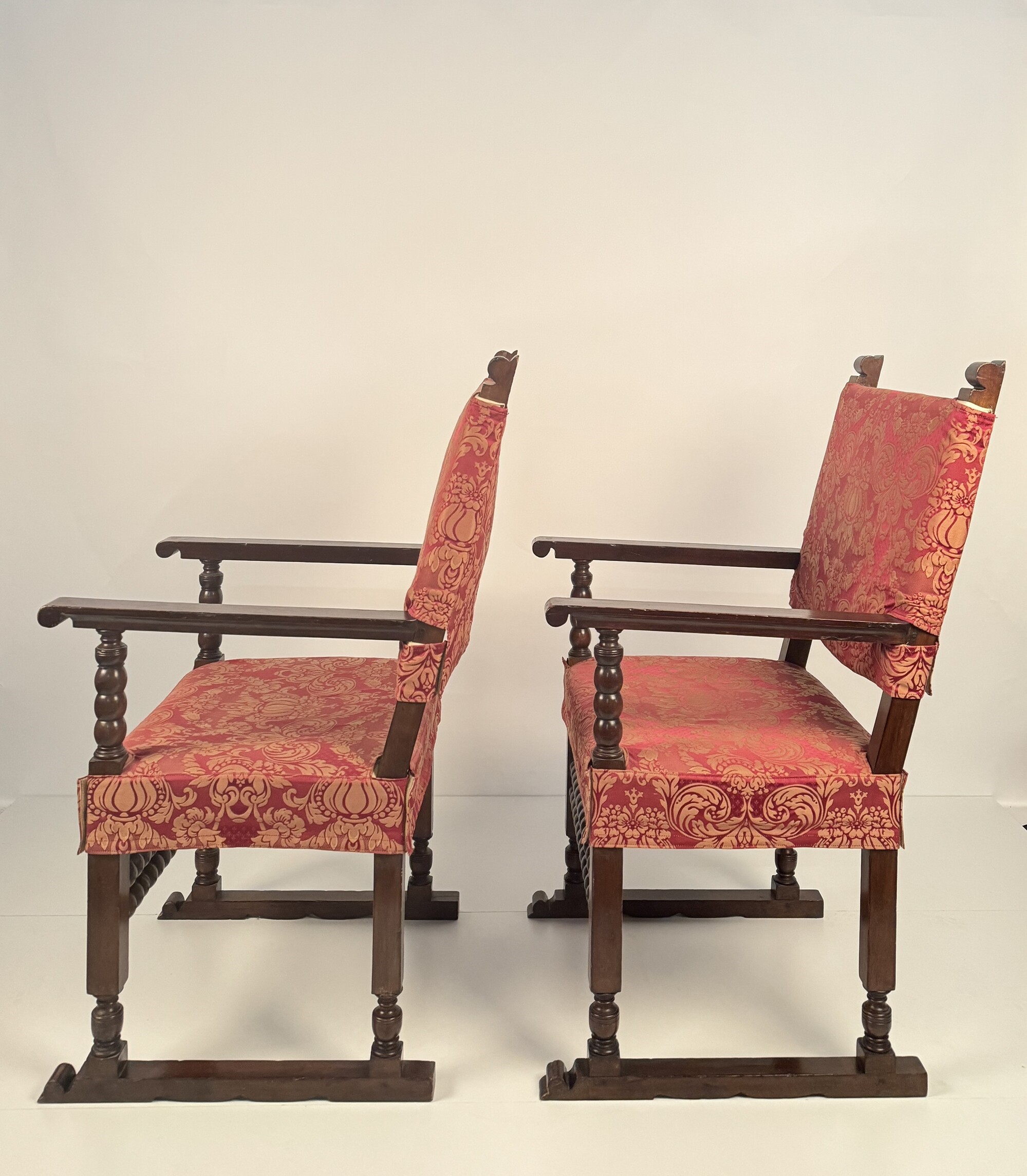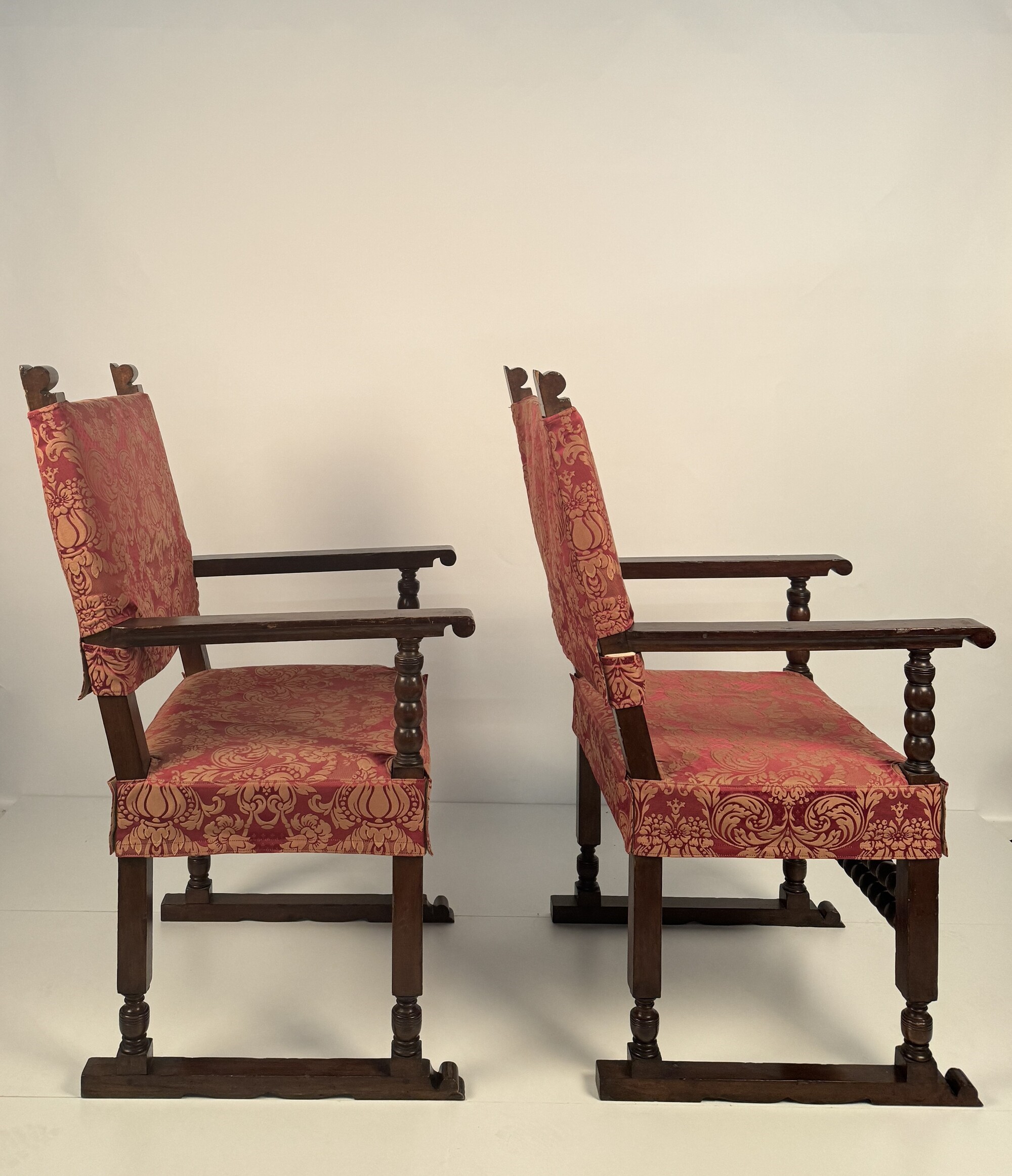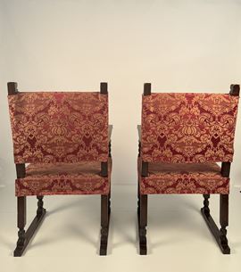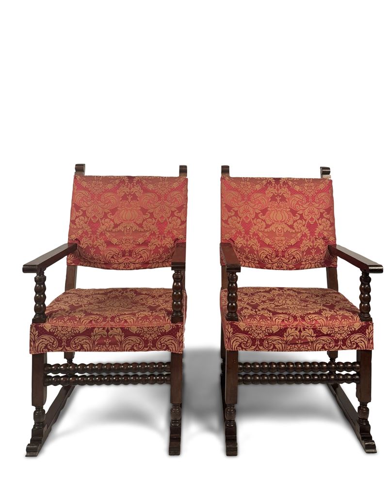 Schienale con finali scolpiti, braccioli dritti poggianti su montanti torniti a bocce, gambe a rocchetto raccordate da una doppia traversa tornita, rivestimento non coevo rosso con racemi