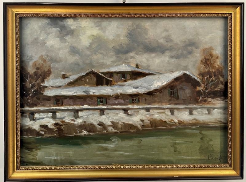 Pittore del XX secolo Paesaggio innevato con cascinale