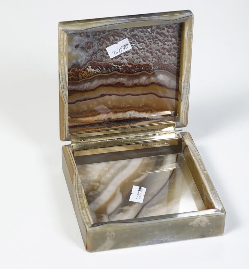 Scatola in pietra dura (occhio di tigre e agata ?). XX secolo