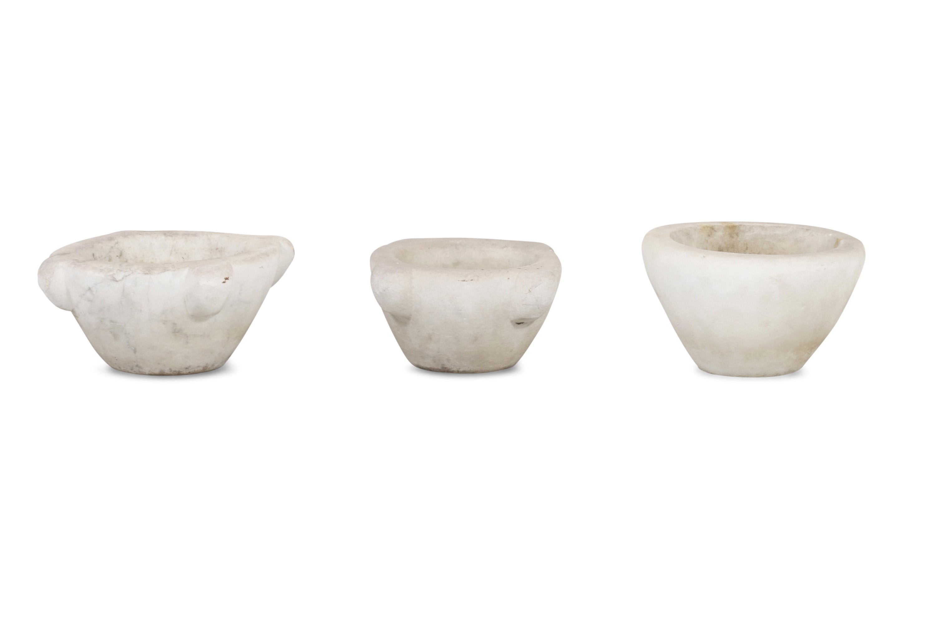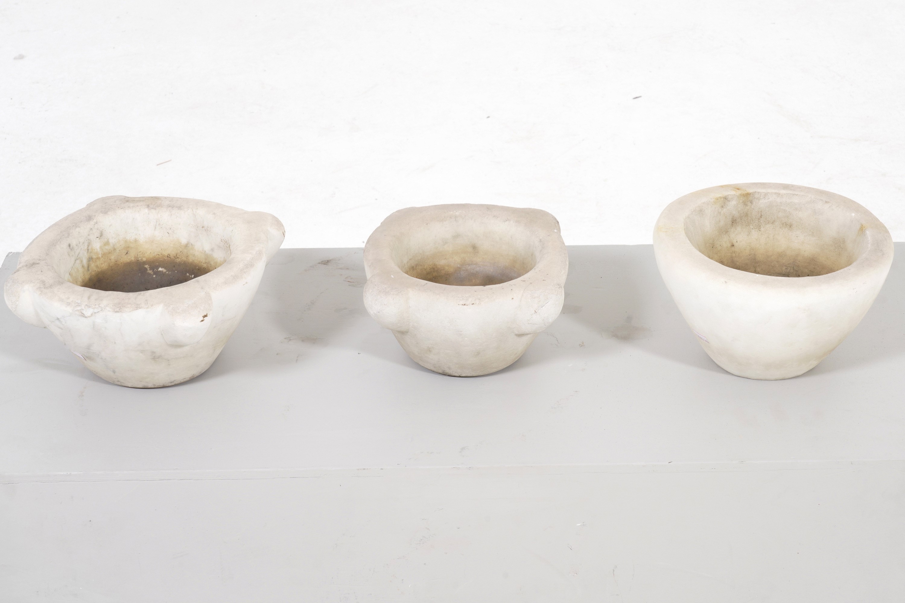 Tre mortai in marmo bianco