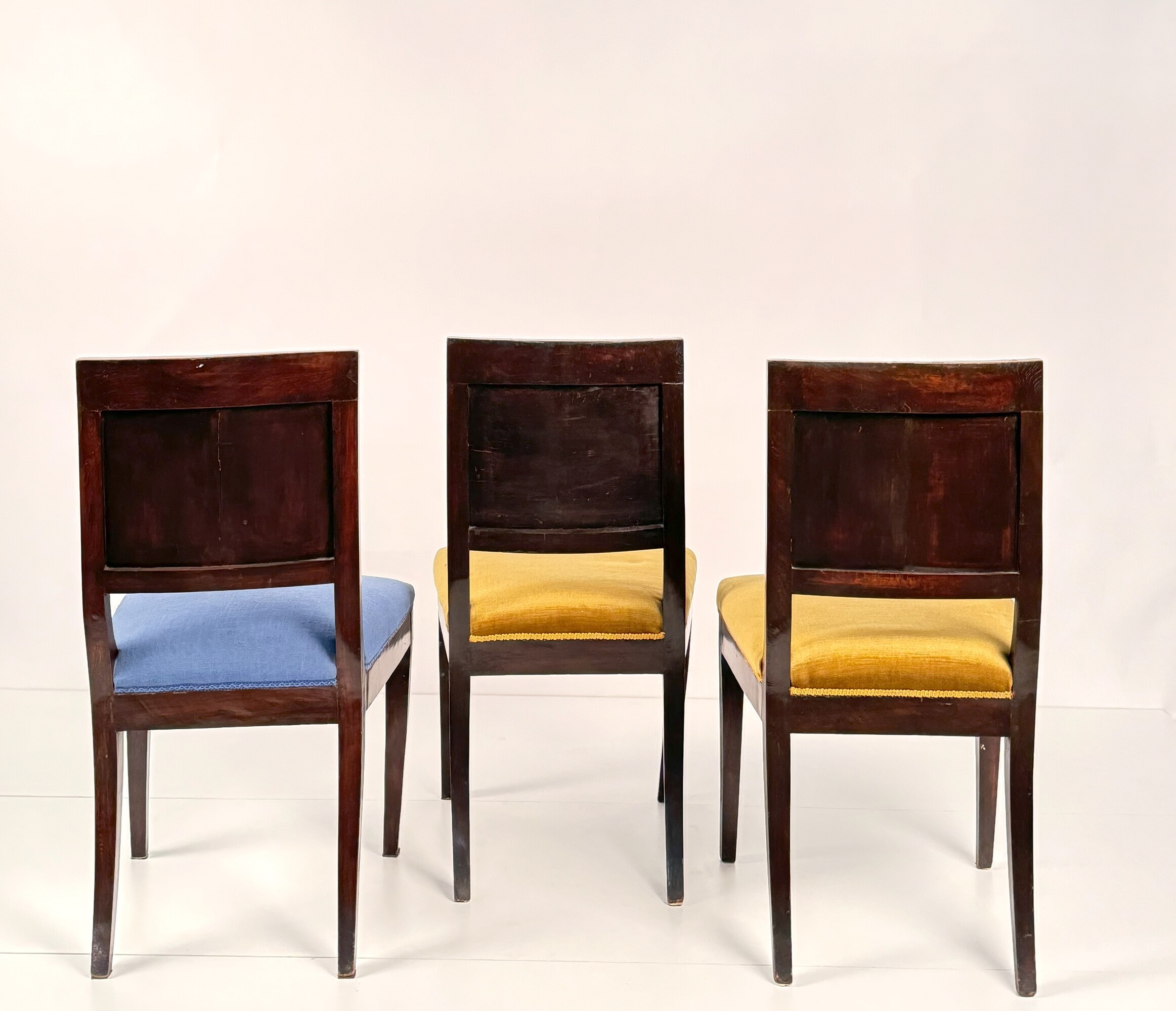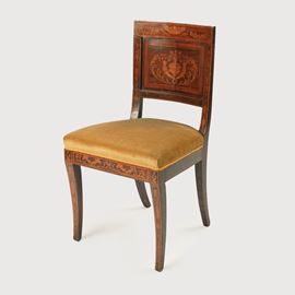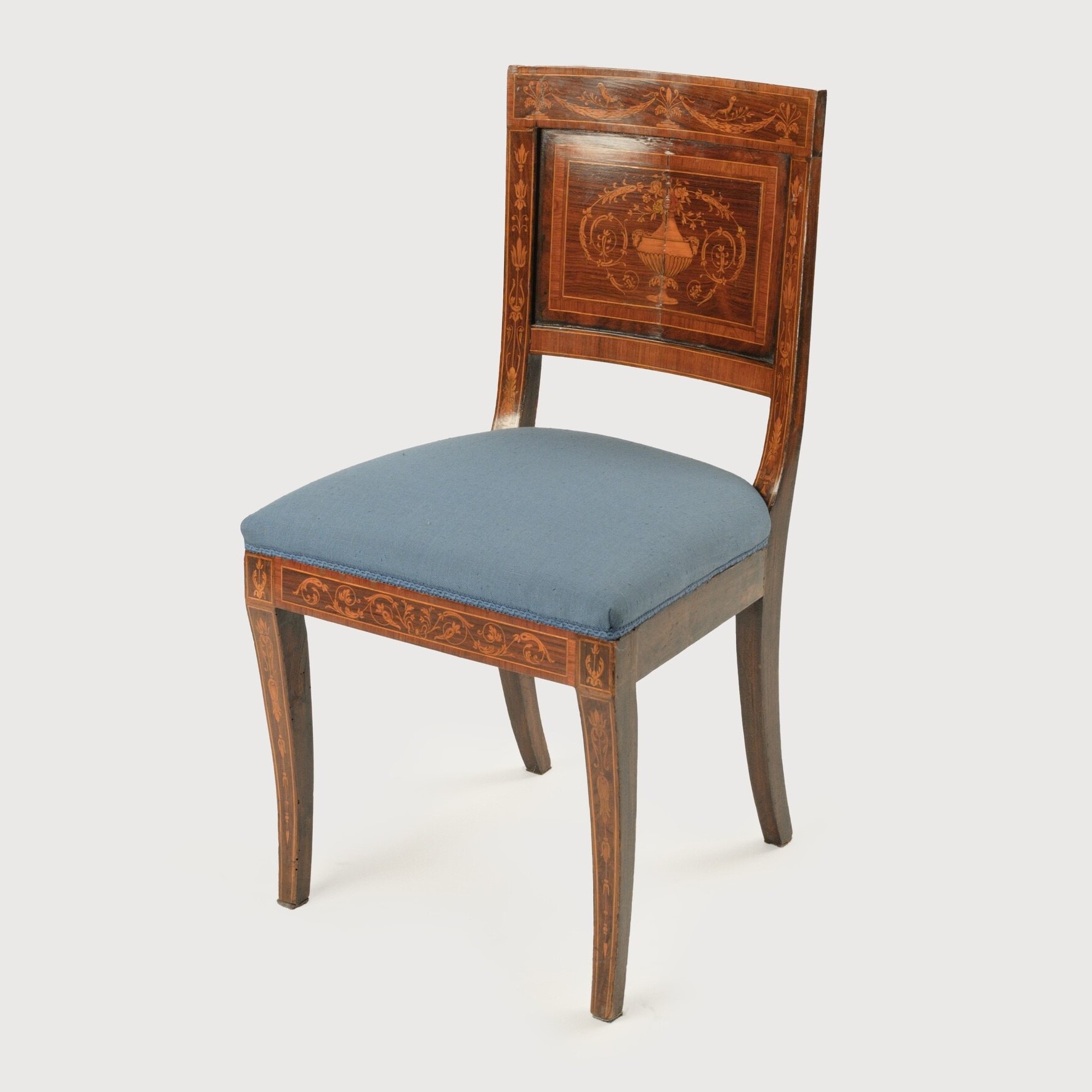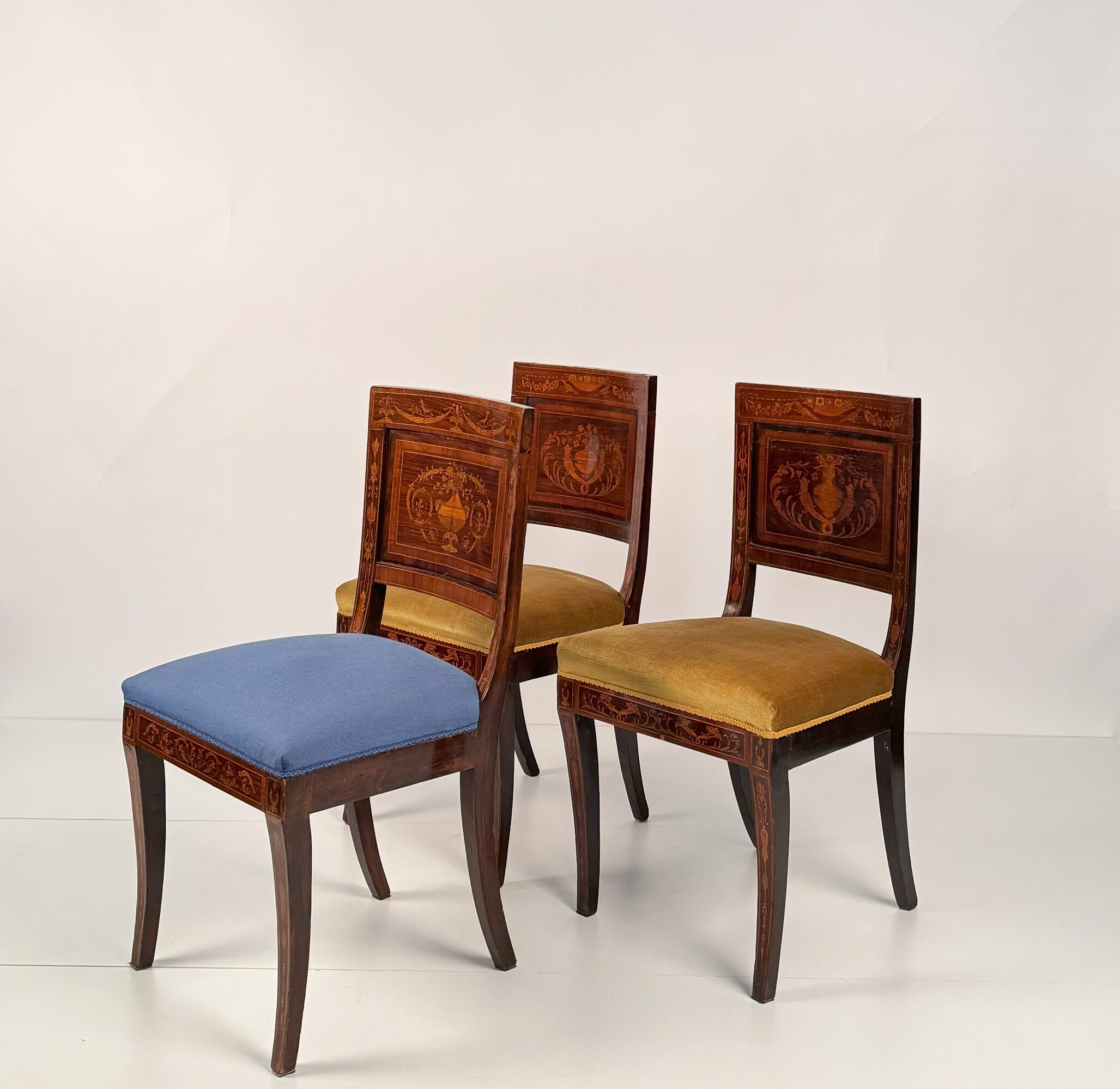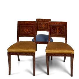 Tre sedie lastronate e intarsiate in stile Luigi XVI, XX secolo