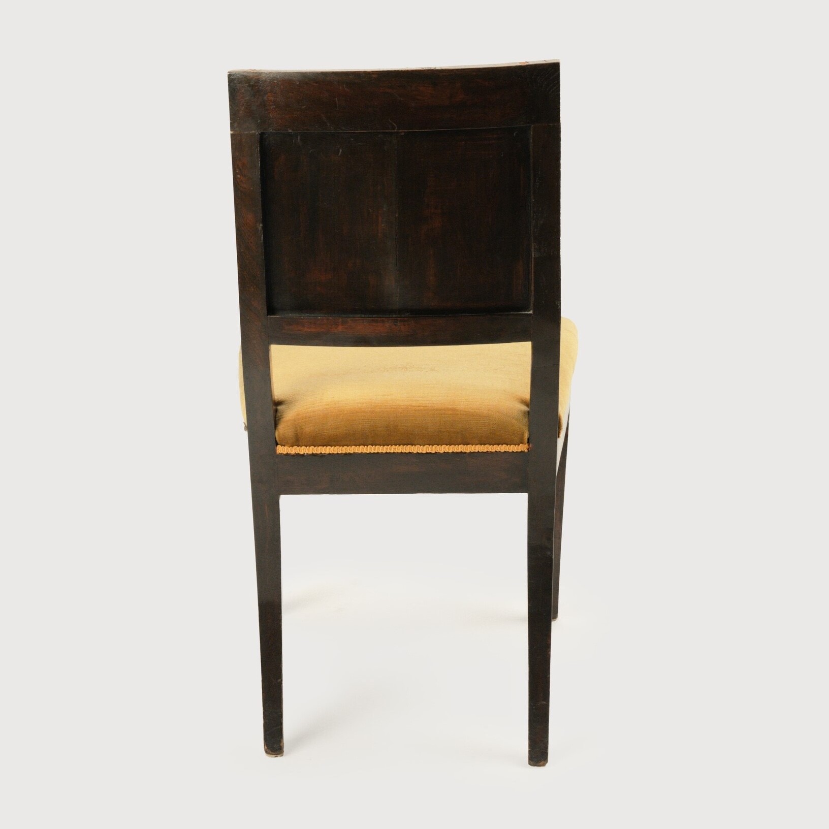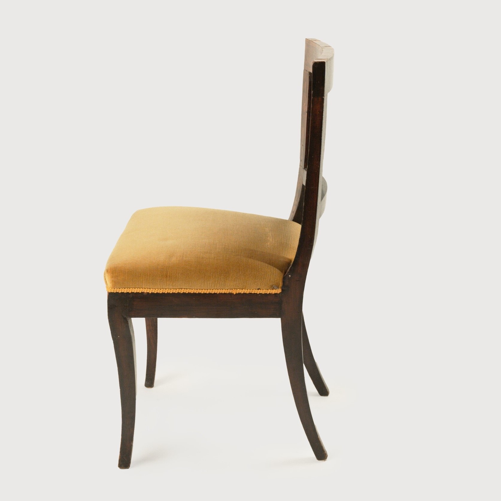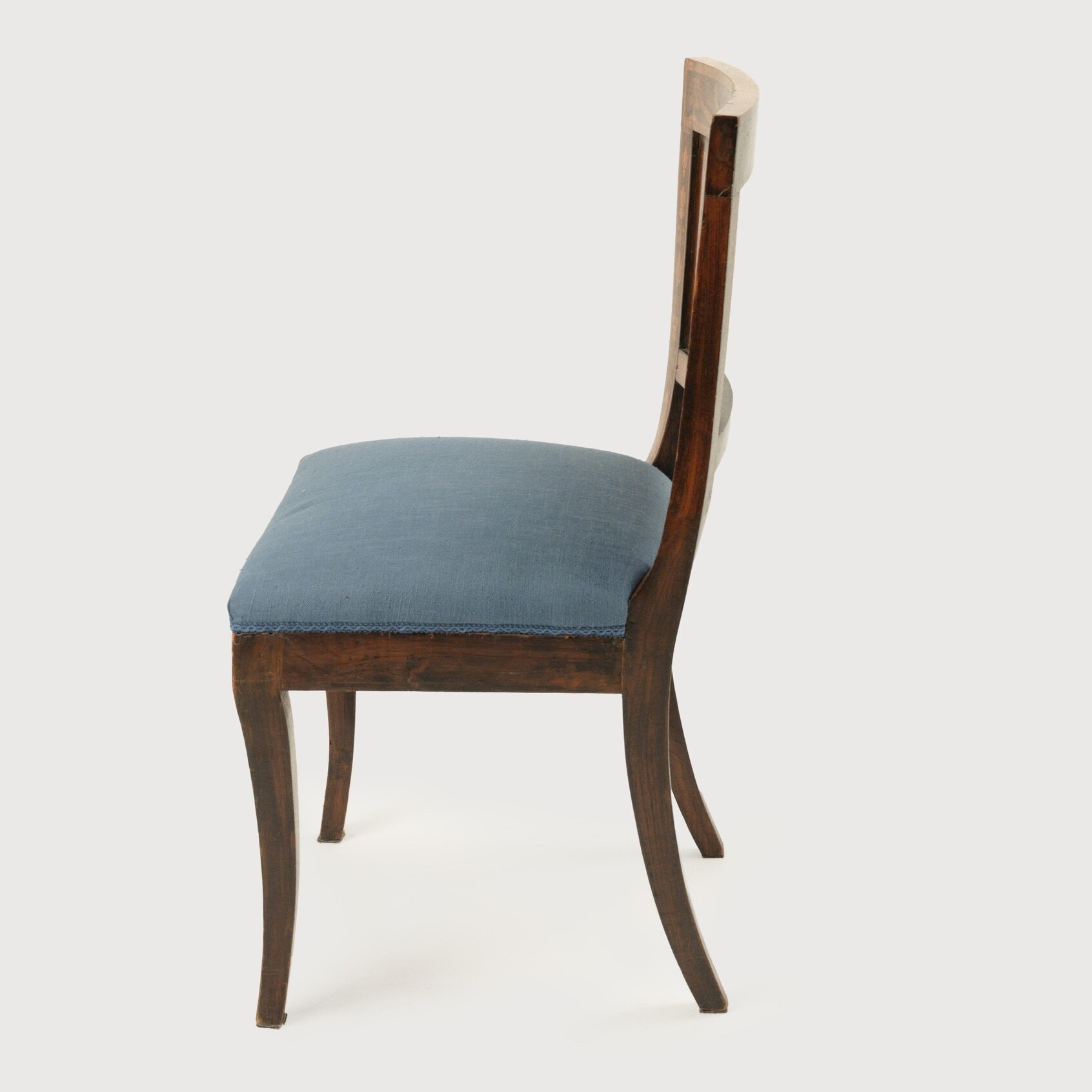 Schienale centrato da un vaso tra due volute fogliate, cintura e gambe anteriori a sciabola intarsiati, seduta imbottita e rivestita in tessuto