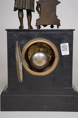 Trittico in marmo nero composto da due vasi e un orologio sormontato da figura maschile in metallo. XIX-XX secolo