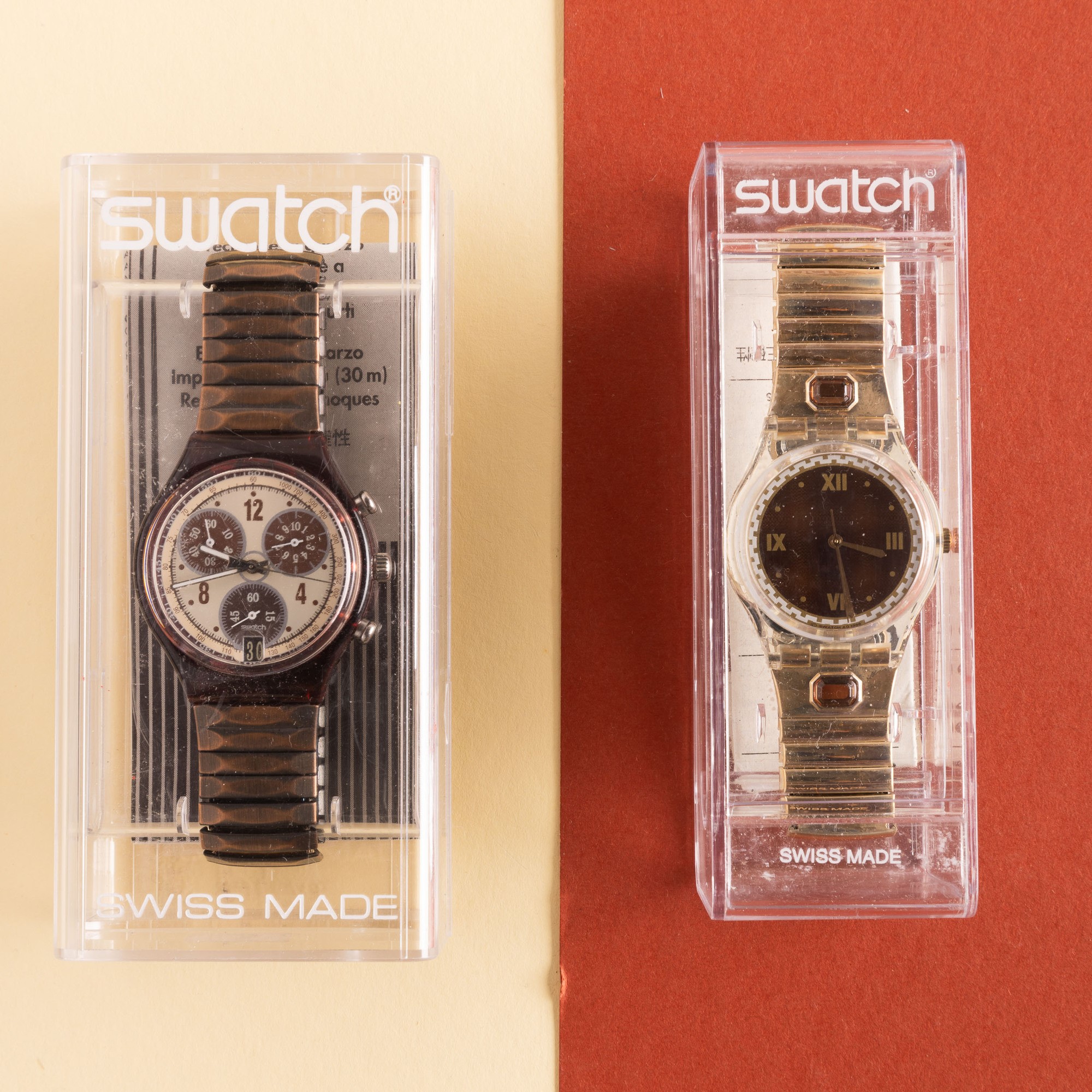 Swatch bracciale elastico e Swatch Chrono con bracciale elastico NOS: Swatch Chrono Brown Brush Swatch Reve D'Automne
