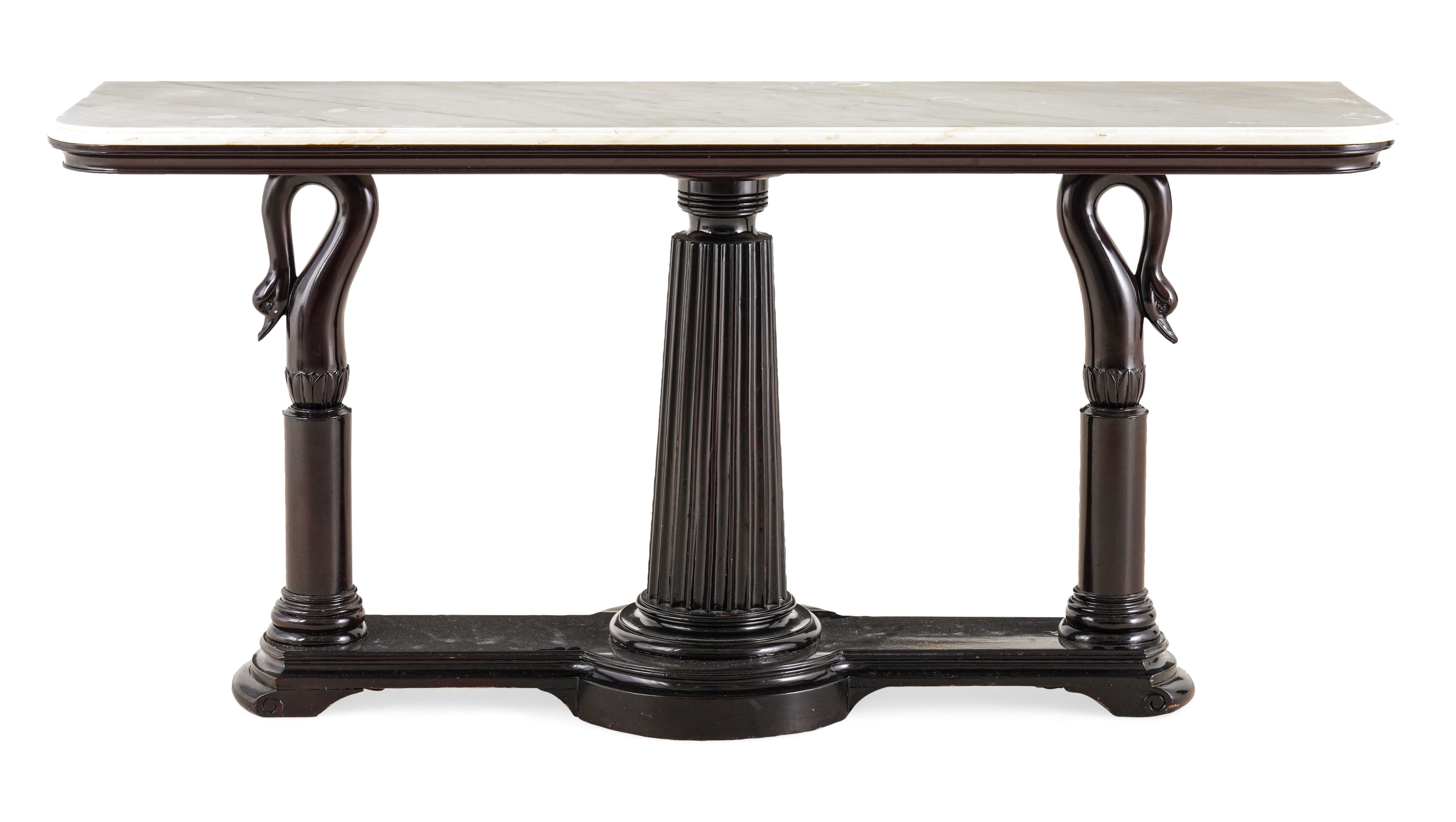 Sostegno formato da elementi terminanti a teste di cigni e colonna scanalata centrale, piano in marmo bianco venato