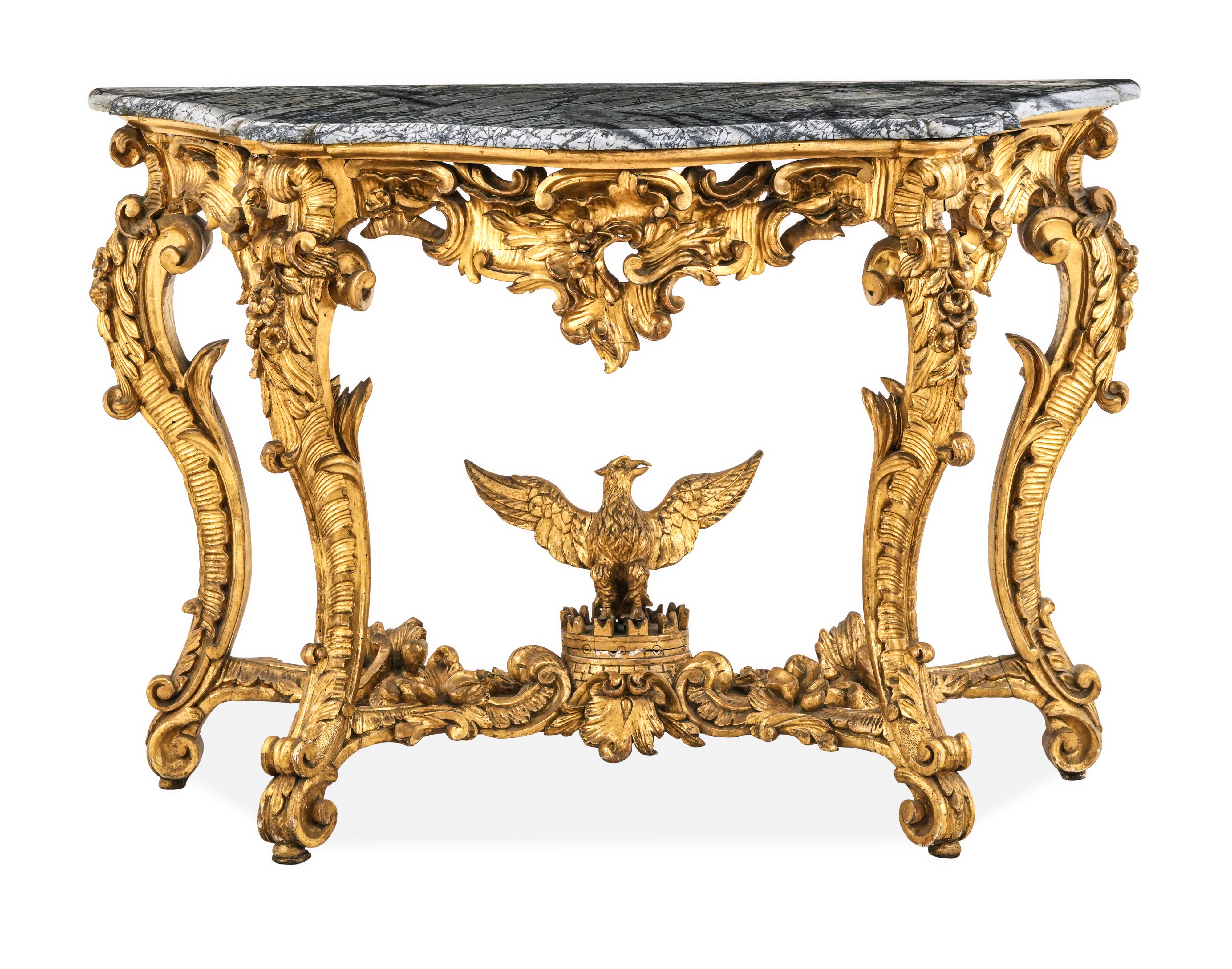 Legno riccamente scolpito e dorato a riccioli, pellacce e motivi vegetali, fascia traforata, piano in marmo sagomato, gambe mosse riunite da crociera centrata da scultura di aquila ad ali spiegate che sormonta una torre, presumibilmente simbolo della famiglia Giustiniani, dalla quale potrebbe derivare la committenza della consolle