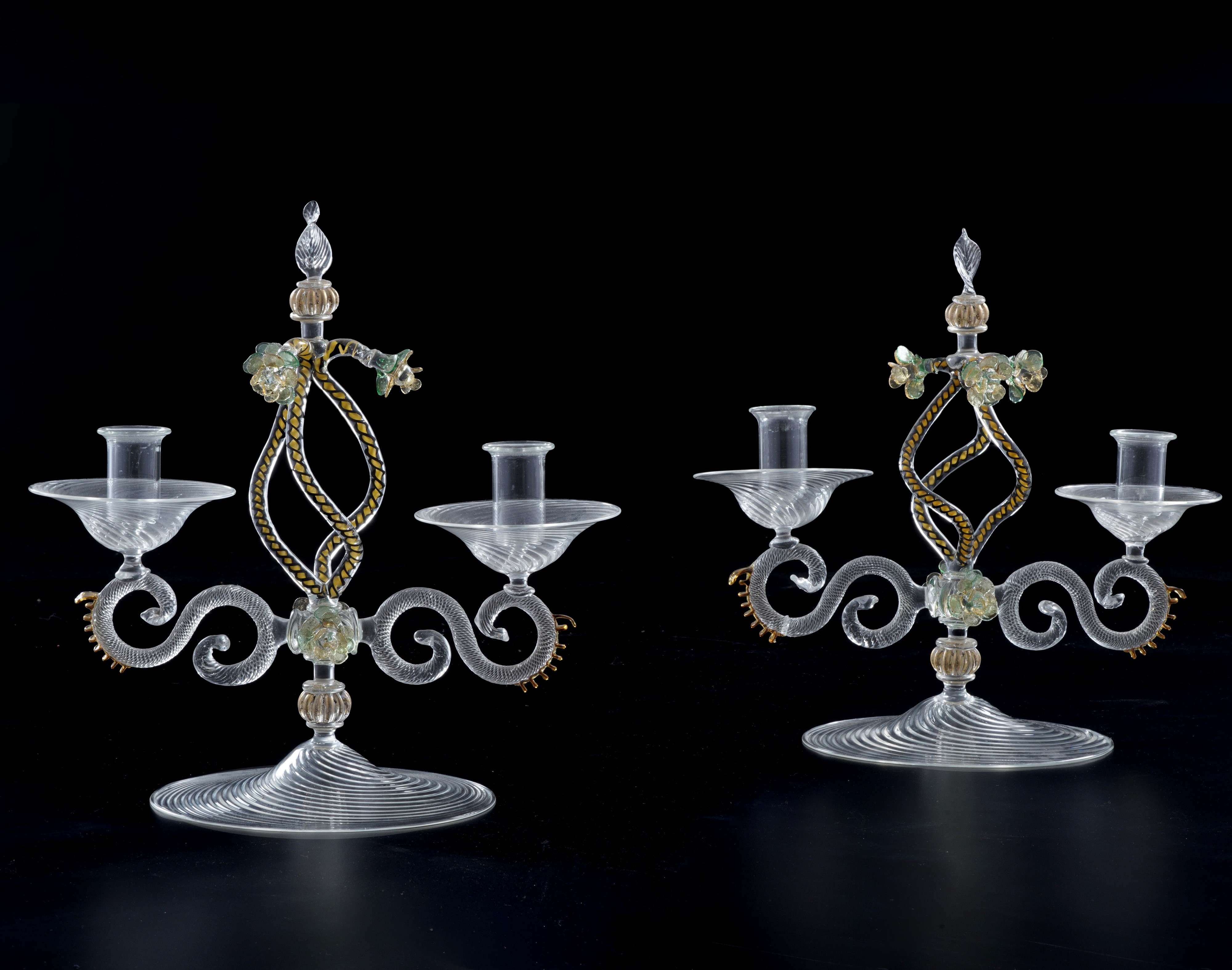 A due fiamme, con bracci a volute, fusto torchon decorato con fiori policromi