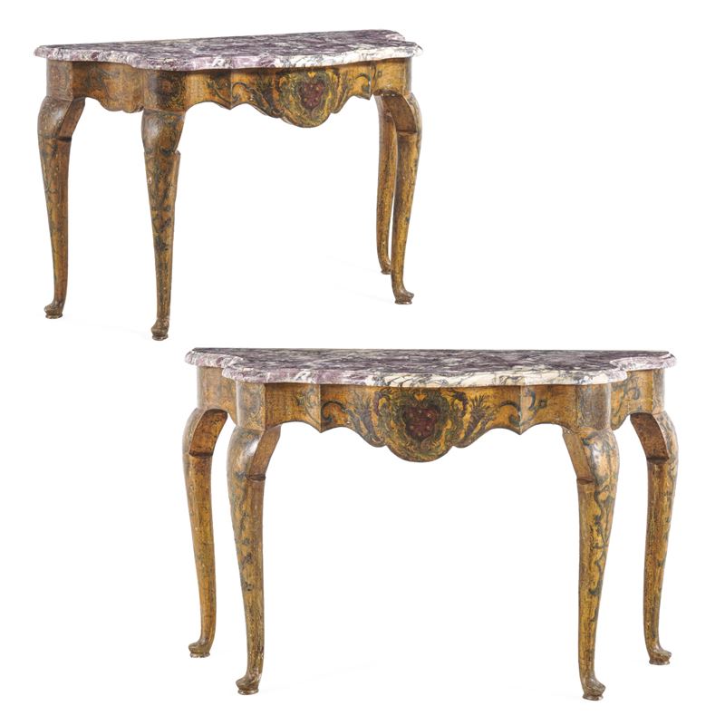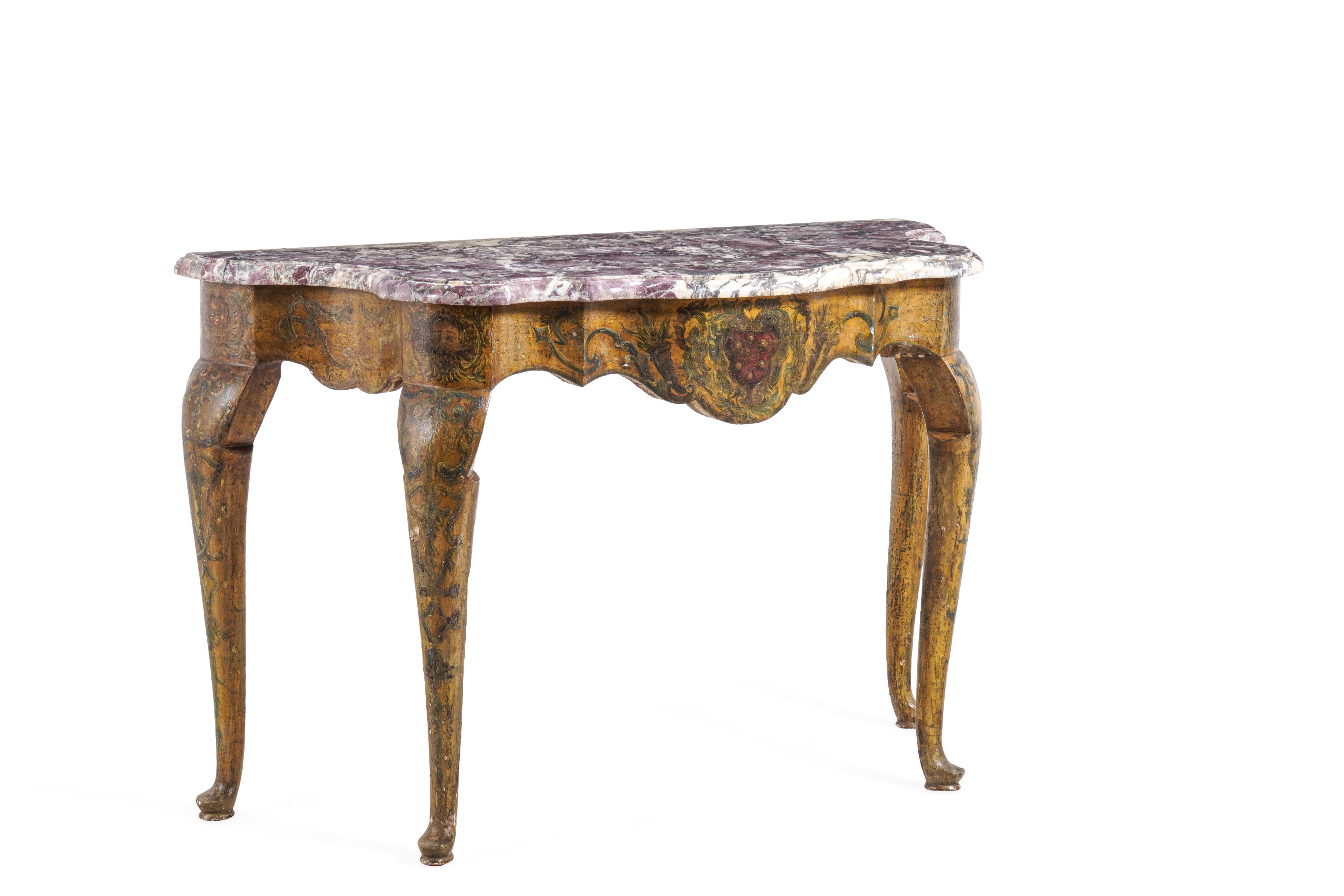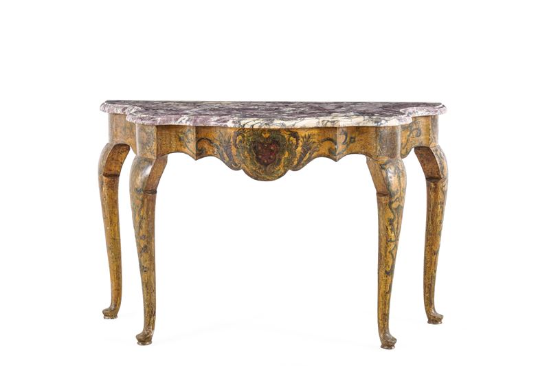 Legno intagliato e laccato, fascia sagomata, decoro rocaille con stemma al centro, gambe mosse, piano in marmo sagomato