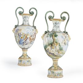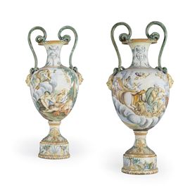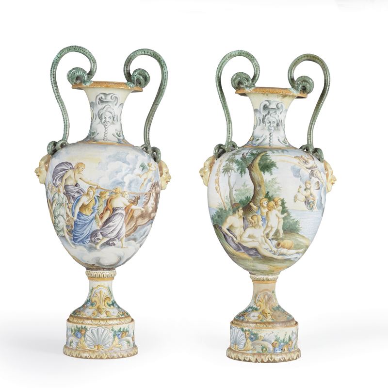 Coppia di vasi istoriati su basi. Italia centrale, 1900 ca.