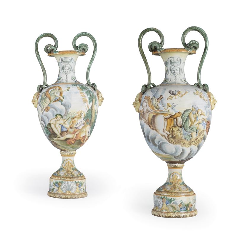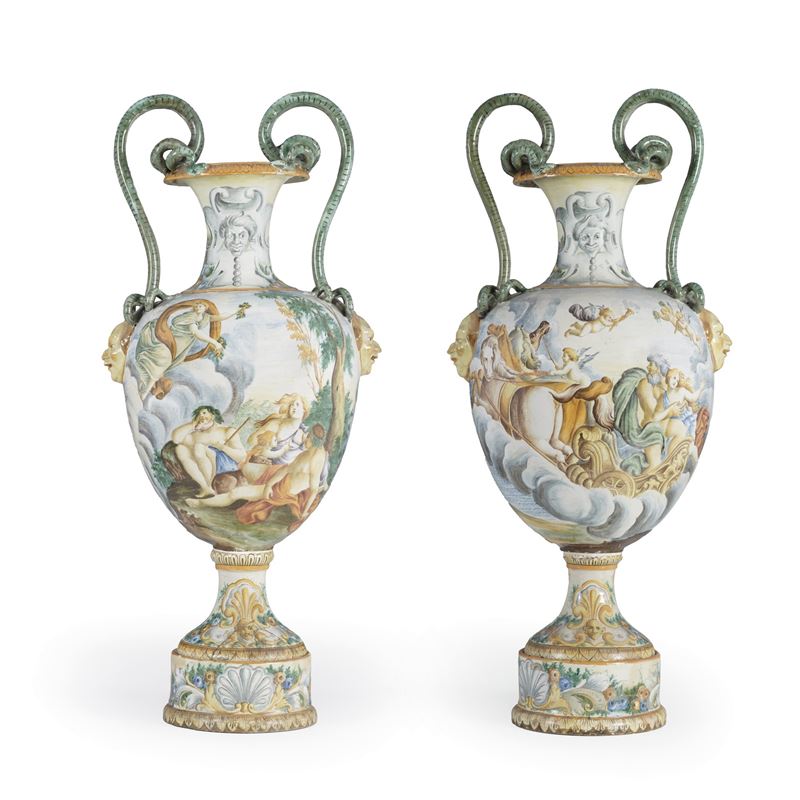 Maiolica policroma. Marca: assente. Dimensioni: altezza totale cm 83; cm 42x34. Conservazione: basi ricomposte in restauro; ogni vaso con il piede e un manico restaurati; un vaso con felature.