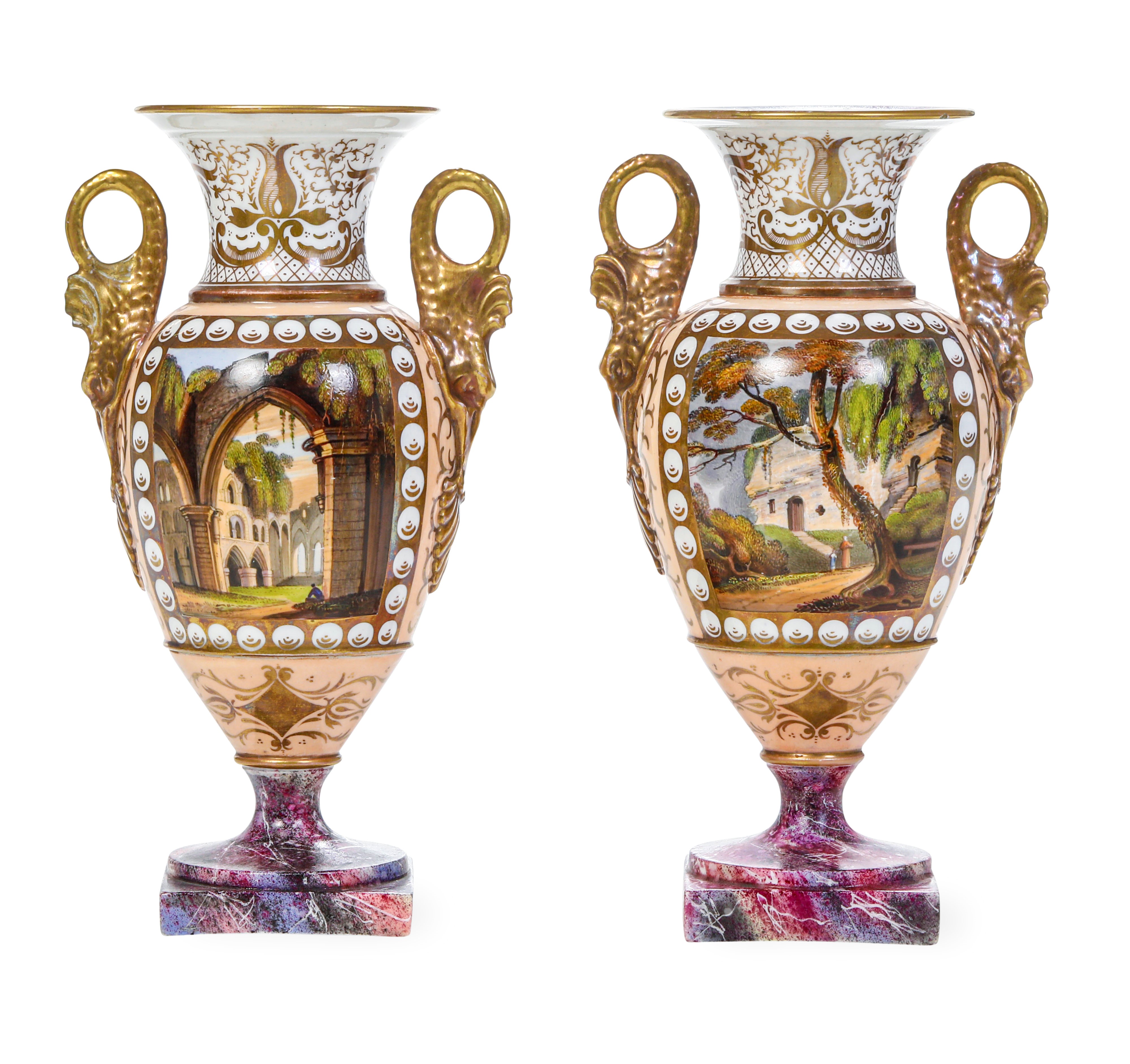 Porcellana. Marca: assente. Altezza cm 23 circa. Conservazione: ottima; insignificante felatura ad un manico e riprese d’oro ad un altro; piccola sbeccatura al bordo superiore.